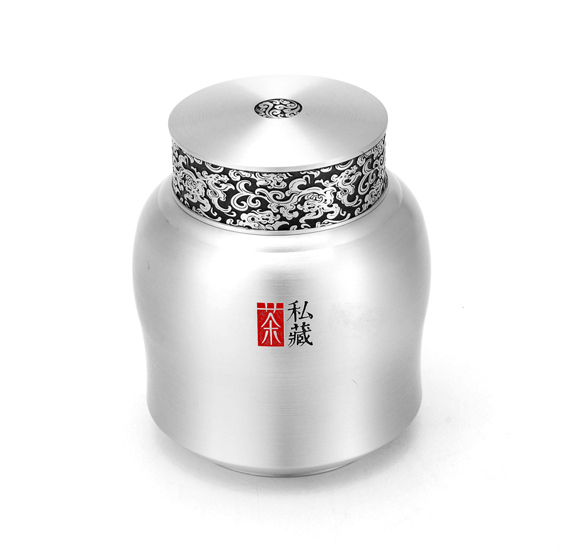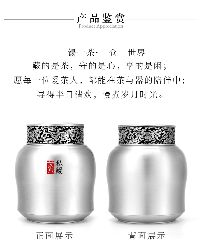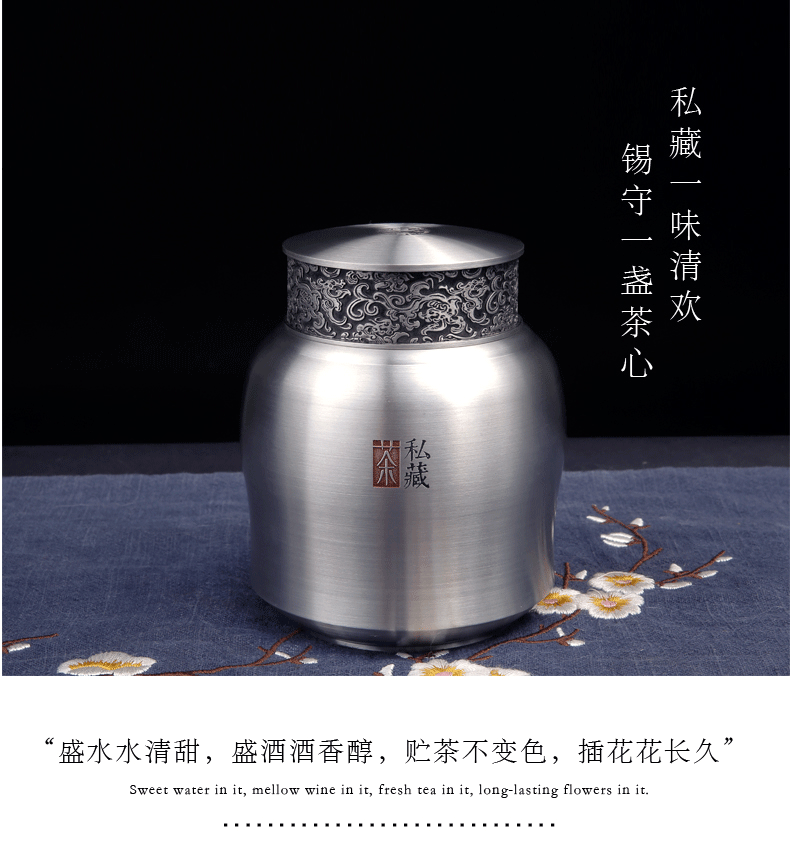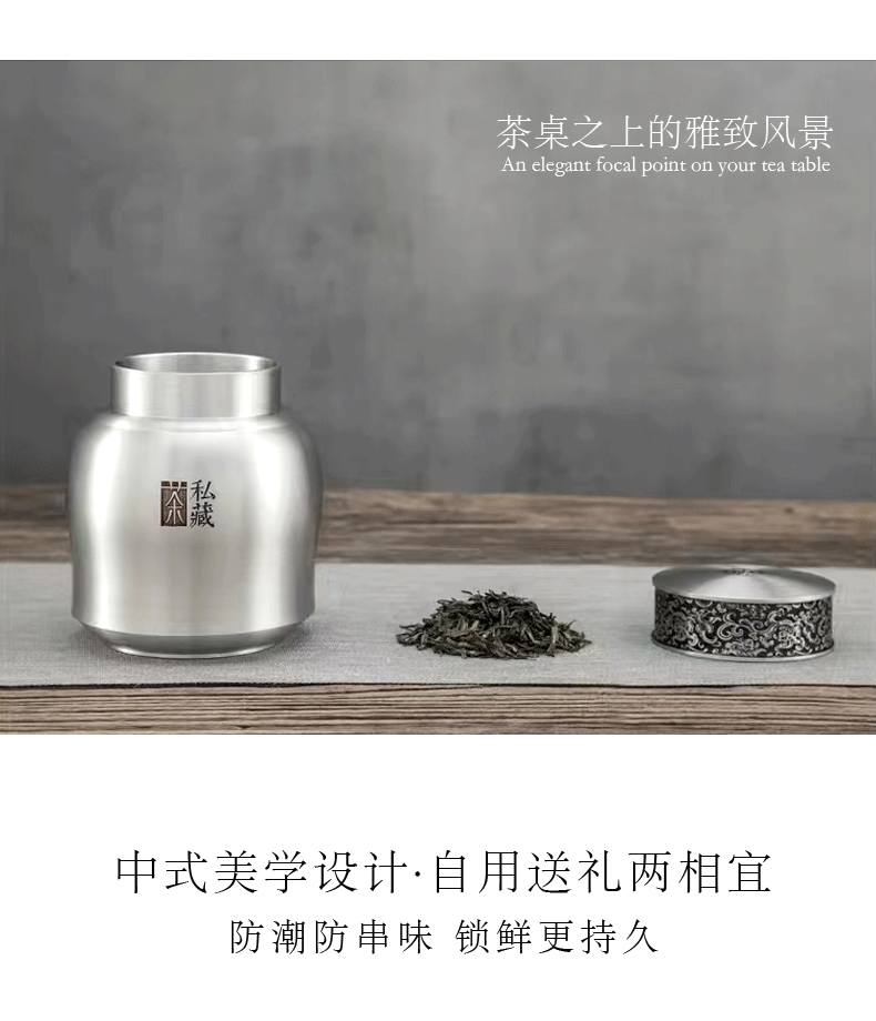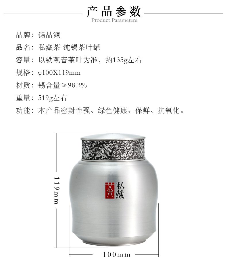 产 品:私藏茶 规 格:φ100*119mm 容 量:约135g装 (铁观音) 重 量:519g左右 支持个性化定制 ✅ 纯锡材质,存茶优势拉满:密封防潮、防串味,恒温锁鲜,保留茶叶本香,适配全品类茶品,越存越醇。 ✅ 匠心工艺,颜值质感双在线:拉丝罐身温润抗造,罐盖缠枝龙纹浮雕古韵盎然,「私藏茶」红印彰显格调,茶桌之上尽显雅致。 ✅ 支持专属定制,礼赠自藏皆宜:罐底可刻 Logo、姓名、祝福语,打造独特的专属茶仓,送长辈、客户体面有心意,自用存茶更具仪式感。
