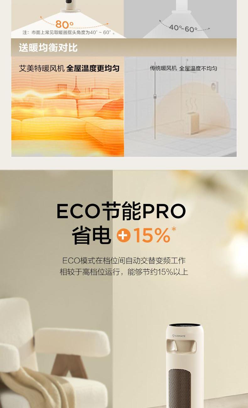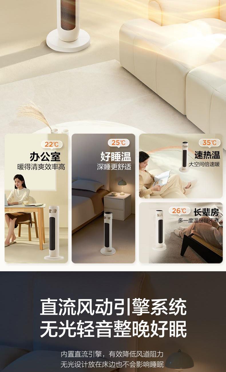额定功率:2100W 额定电压:220V 额定频率:50Hz 档位:3档 净重毛重:1.6kg/2.1kg 控制方式:语音/遥控 装 箱 数:1台/箱 1、【随心控】触摸、遥控、语音、蓝牙小程序控制 2、【1+2档取暖】凉风、1200W、2100W加热 3、【预约定时】24H【左右摆头】80°宽域摆头 4、【温度控制】18-35°宽域温度可调 5、【ECO模式】节能模式,智能省电取暖 6、【睡眠模式】匹配睡眠曲线,智能调节送暖温度,享整晚安睡 7、【PTC+石墨烯】高能效PTC发热体+石墨烯涂层,即开即热宽域出风前网】 冲孔宽域前网,出风更顺畅 8、【四重安全防护】防火材料,过热保护,倾倒断电,童锁
