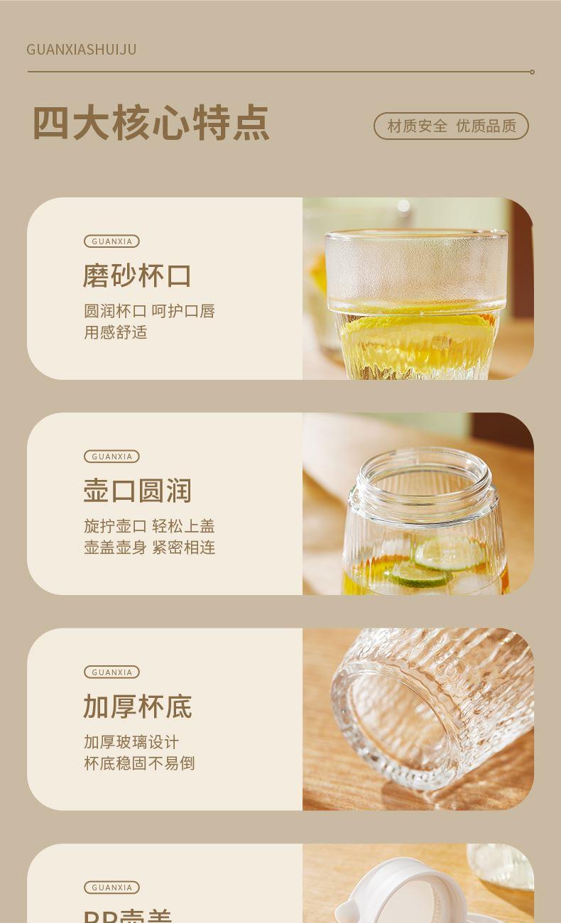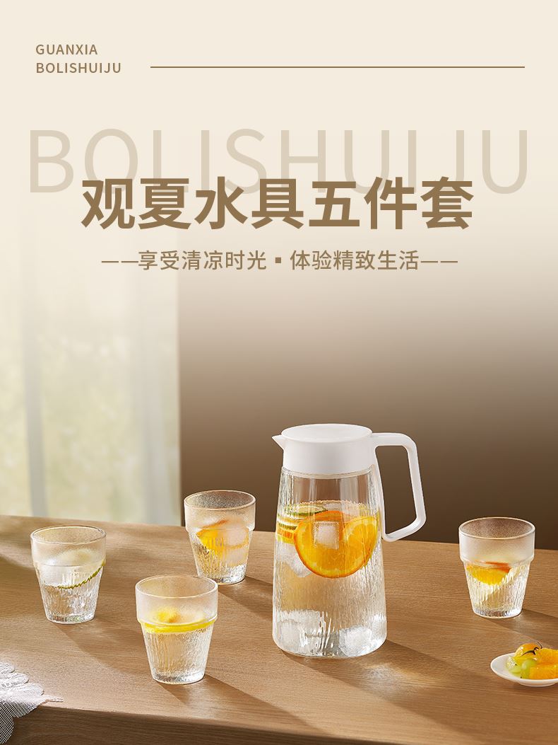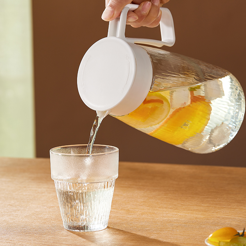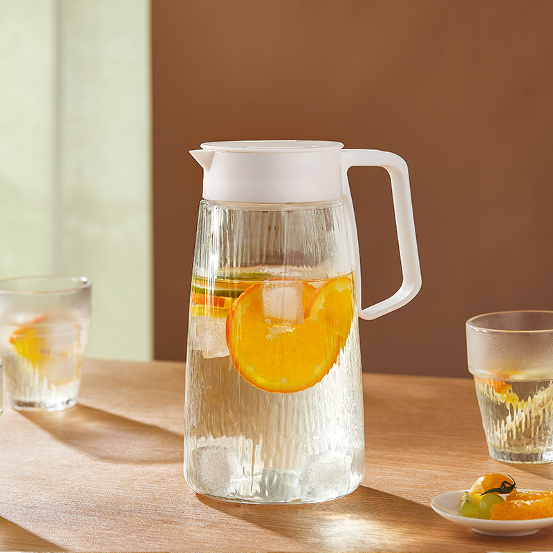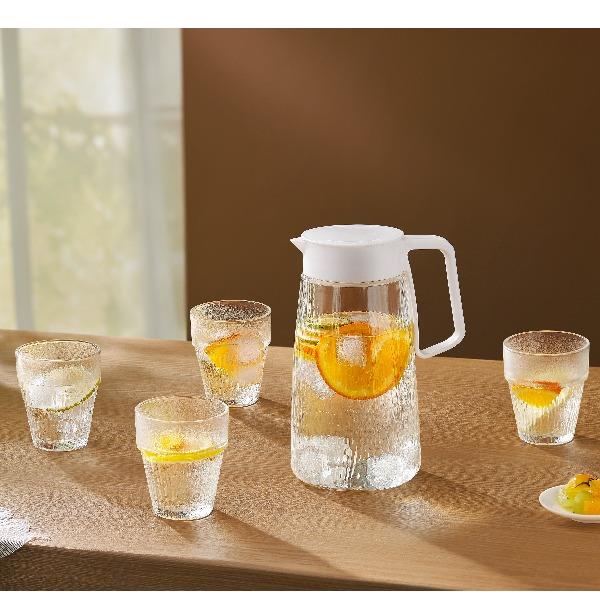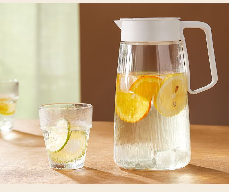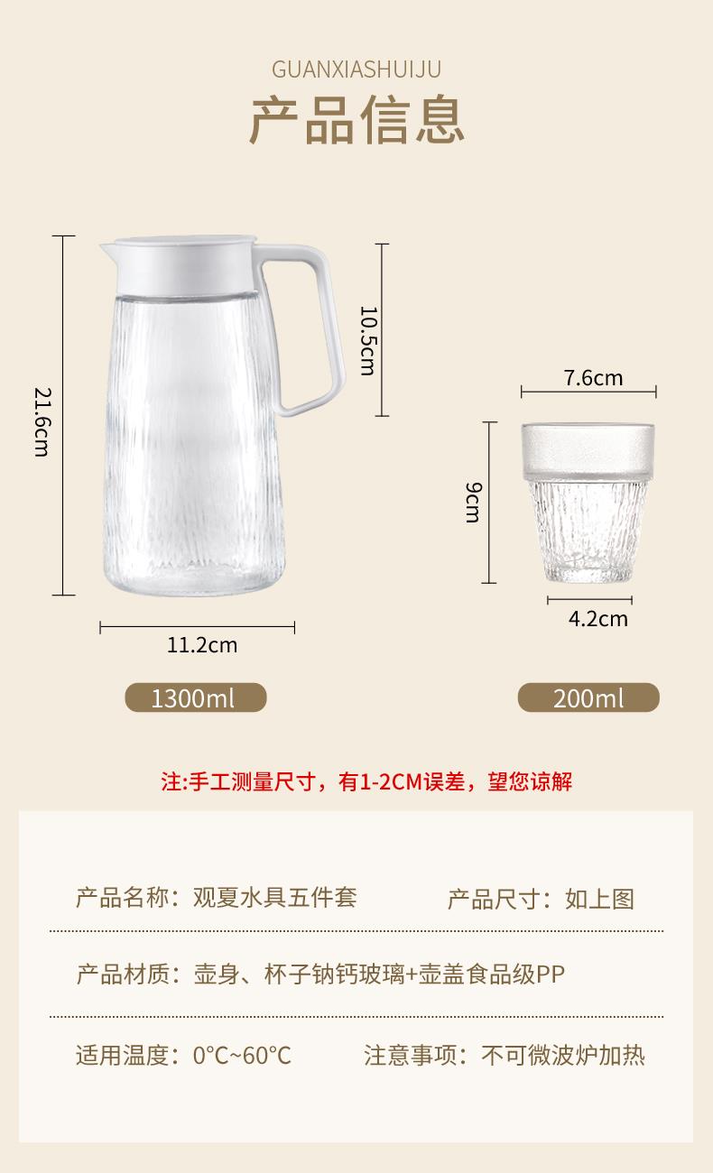 适用温度:0°C-60°C 产品参数:壶1100ml*1、杯200ml*4 材 质:高白料钠钙玻璃,食品级硅胶,食品级pp 彩盒尺寸:342*93*222mm 外箱尺寸:48*35.5*46.5cm 产品卖点:1.产品采用高白料钠钙玻璃材质,不易残留细菌易清洗,无异味,防腐蚀。2.冰箱壶搭配可叠杯组合时尚设计、实用与空间节省理念 鹰嘴出水口设计,防尘防漏。3.分体壶盖加水更方便,大口径方便清洗,加宽把手结实防烫。
