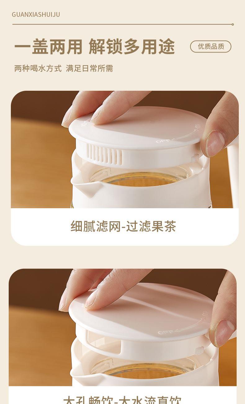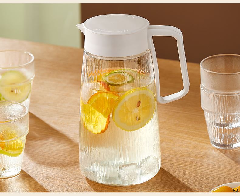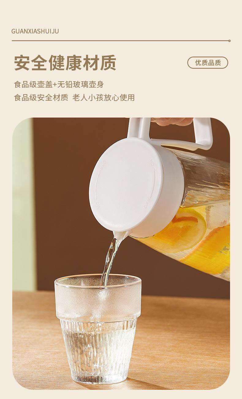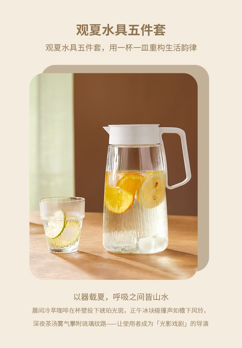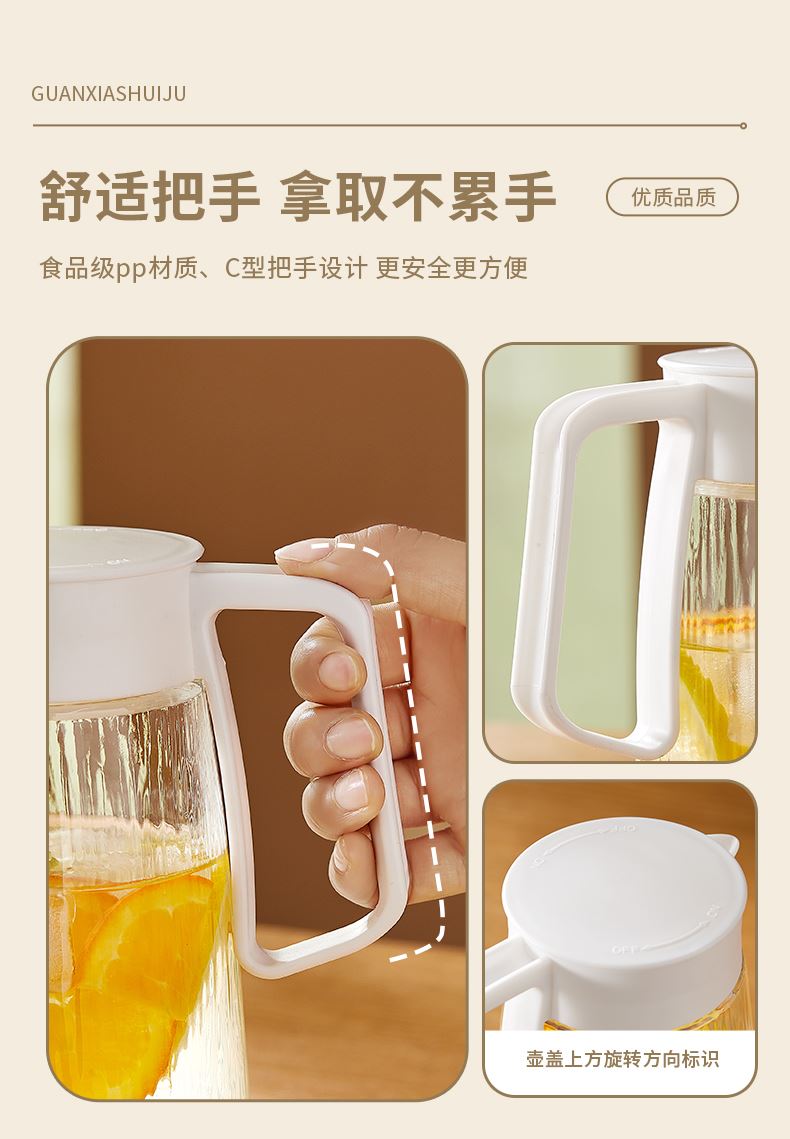 适用温度:0°C-60°C 产品参数:壶1100ml*1、杯200ml*4 材 质:高白料钠钙玻璃,食品级硅胶,食品级pp 彩盒尺寸:342*93*222mm 外箱尺寸:48*35.5*46.5cm 产品卖点:1.产品采用高白料钠钙玻璃材质,不易残留细菌易清洗,无异味,防腐蚀。2.冰箱壶搭配可叠杯组合时尚设计、实用与空间节省理念 鹰嘴出水口设计,防尘防漏。3.分体壶盖加水更方便,大口径方便清洗,加宽把手结实防烫。