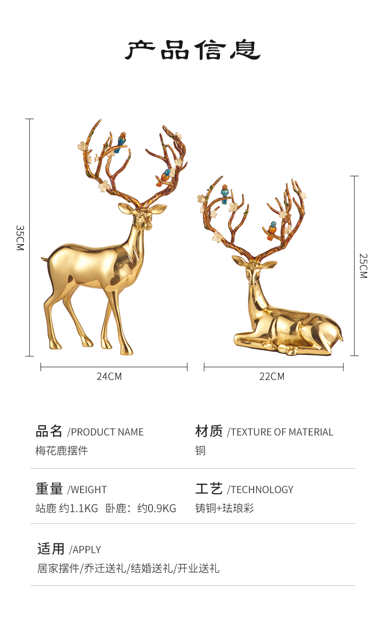工艺:铸铜+珐琅彩 材质:铜 重量:站鹿约1.1KG,卧鹿约0.9KG