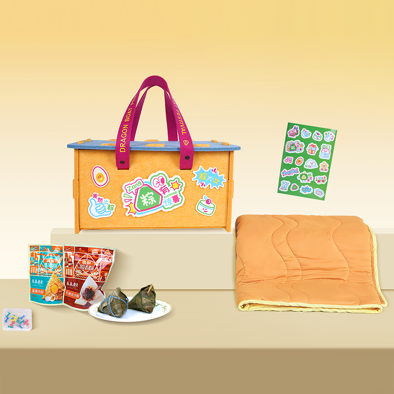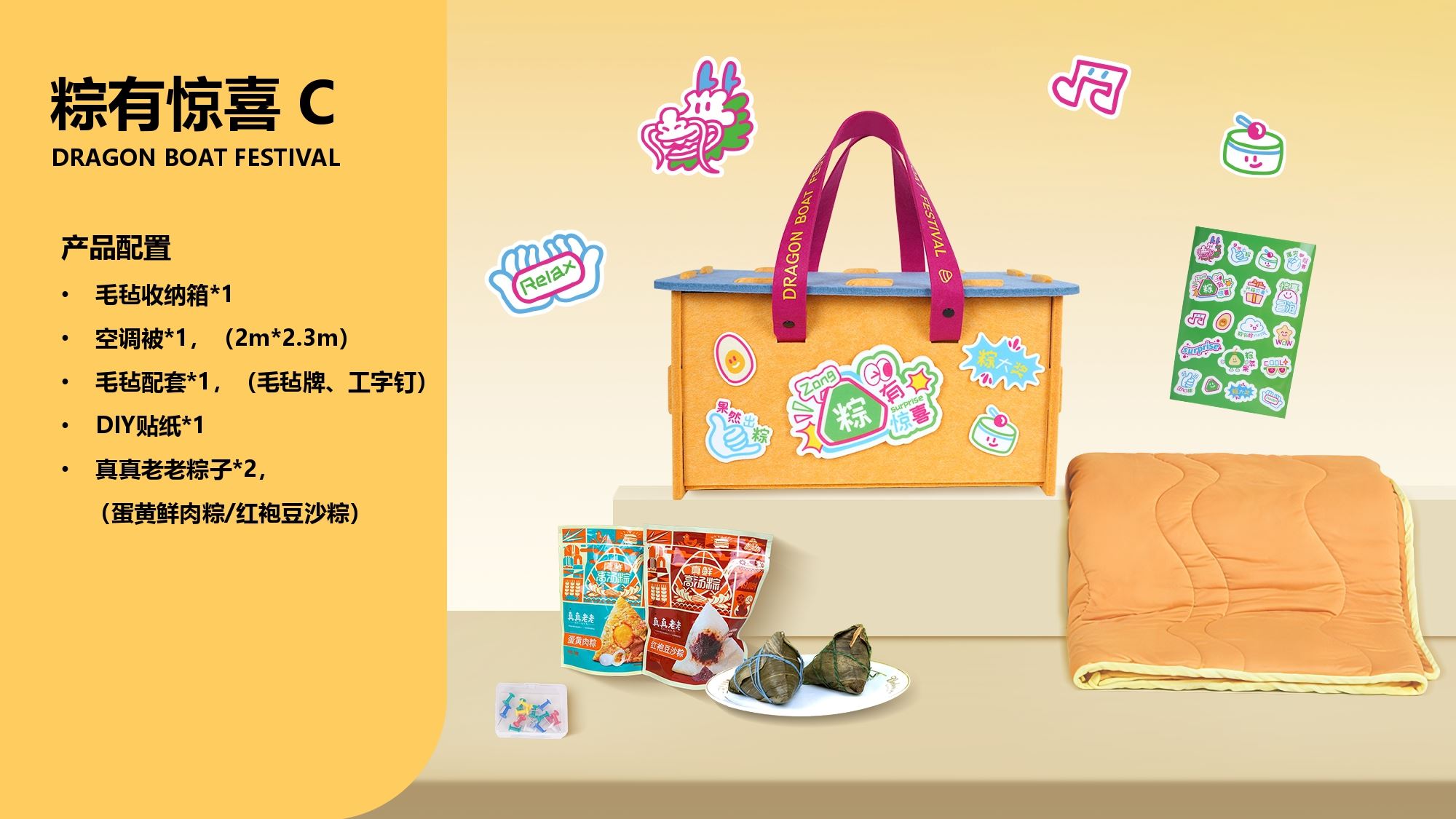 产品配置 毛毡收纳箱*1 空调被*1,(2m*2.3m) 毛毡配套*1,(毛毡牌、工字钉) DIY贴纸*1 真真老老粽子*2, (蛋黄鲜肉粽/红袍豆沙粽)
