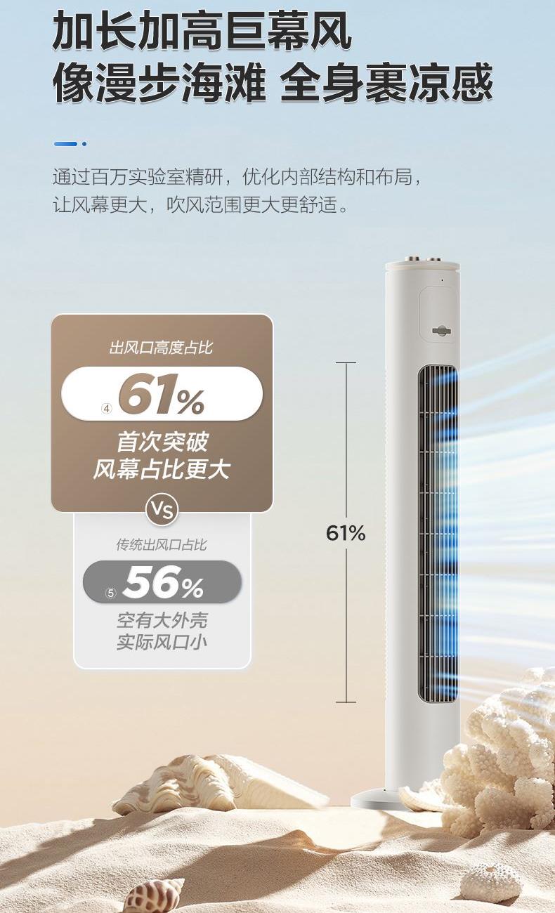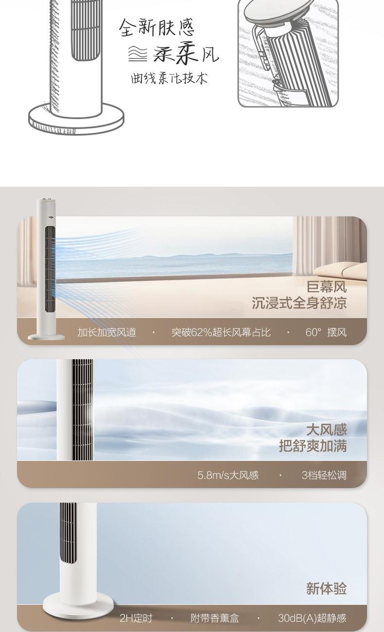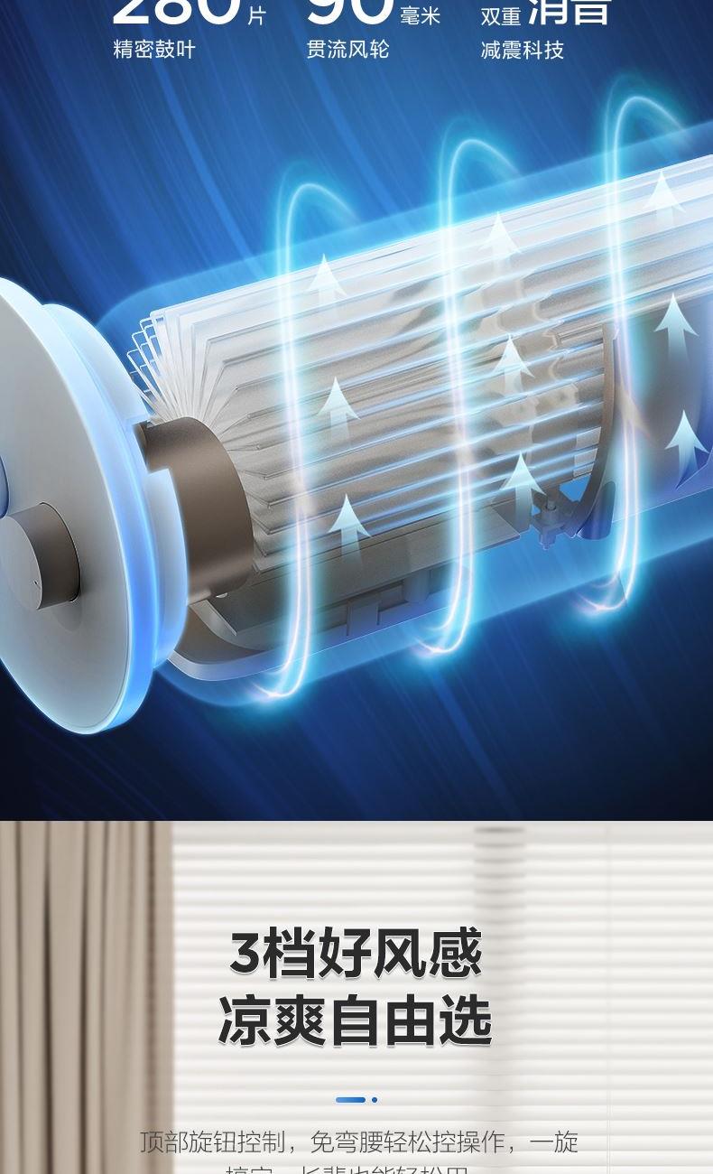 额定电压:220V 额定功率:50W 净重:3.25kg 毛重:4.20kg 档位:3档 控制方式:机械 摆头角度:左右60度摆头 包装尺寸:1020x200x210mm 1.巨幕风沉浸式全身舒凉 加长加宽风道突破62%超长2.风幕占比60°摆风 大风感把舒爽加满 5.8m/s大风感 3.3档轻松调 4.新体验 2H定时 附带香薰盒 30dB(A)超静感 5.280片鼓叶细细柔切出风细腻柔和