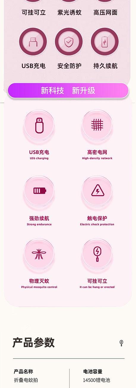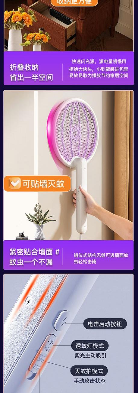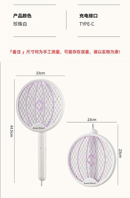 额定电压:5V 额定功率:3W 型料材质:PP 输出电压:3000V~ 产品尺寸:23*44.5CM 旋转折叠一拍双用多重保护,3000V高密度电网全新的塑网防护设计,365nm变频光波自动诱蚊,两种灭蚊模式即是电蚊拍也是灭蚊灯。轻松转换壁挂自动灭蚊,吸引蚊虫智能灭蚊省心省力,3000mAh锂电池强劲持久续航,充电时间为2小时,充满约可使用一个月。