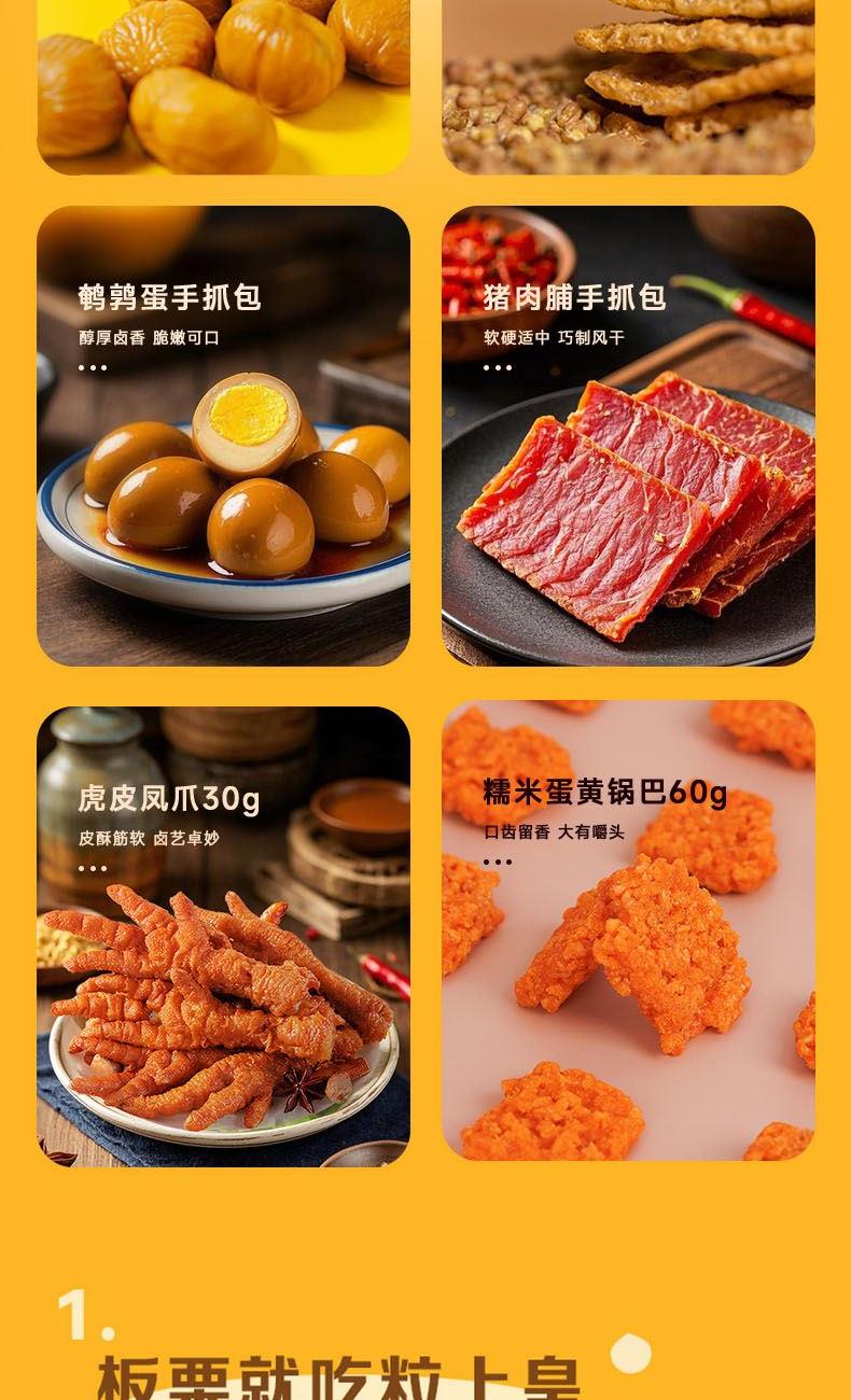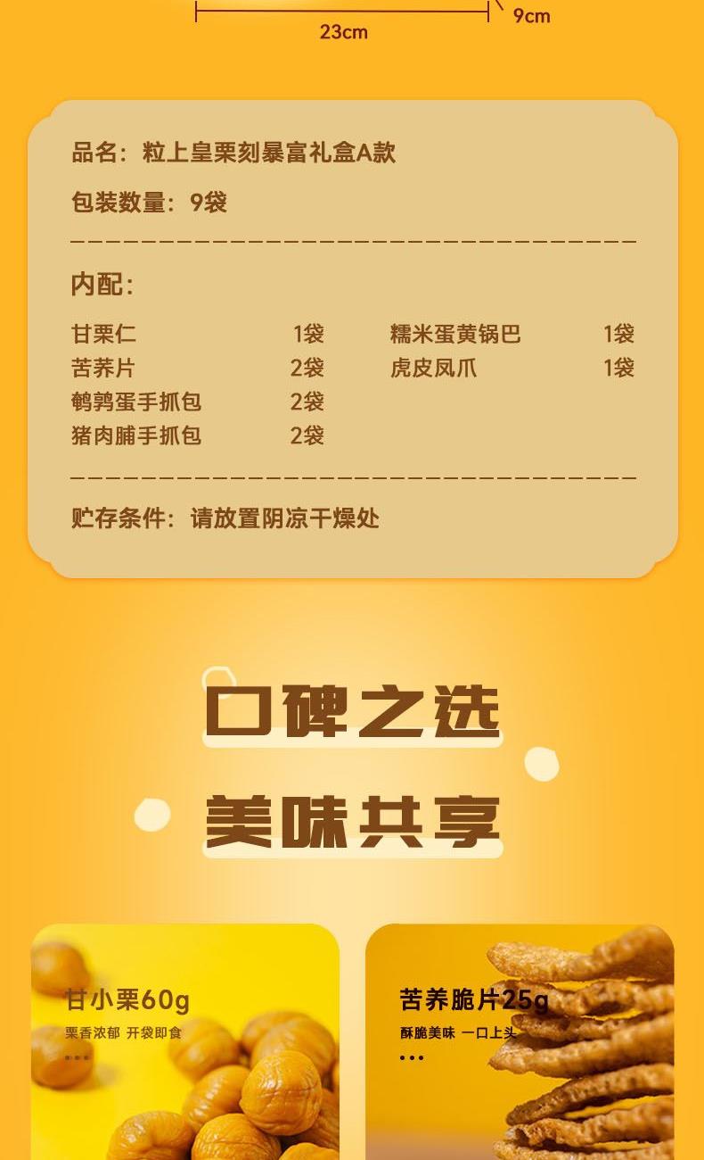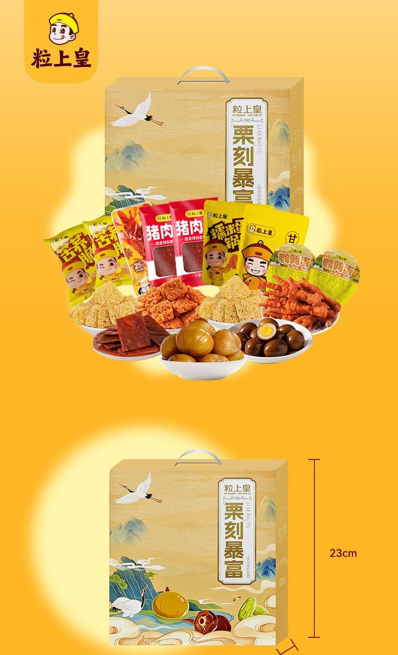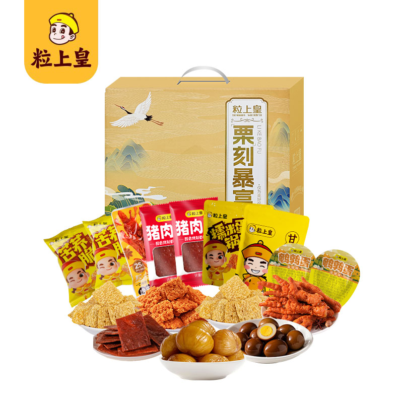 粒上皇鹌鹑蛋手抓包*2 粒上皇猪肉脯手抓包*2 粒上皇糯米蛋黄锅巴60g*1 粒上皇虎皮凤爪30g*1 粒上皇甘栗仁60g*1 粒上皇苦荞片25g*2 礼盒*1
