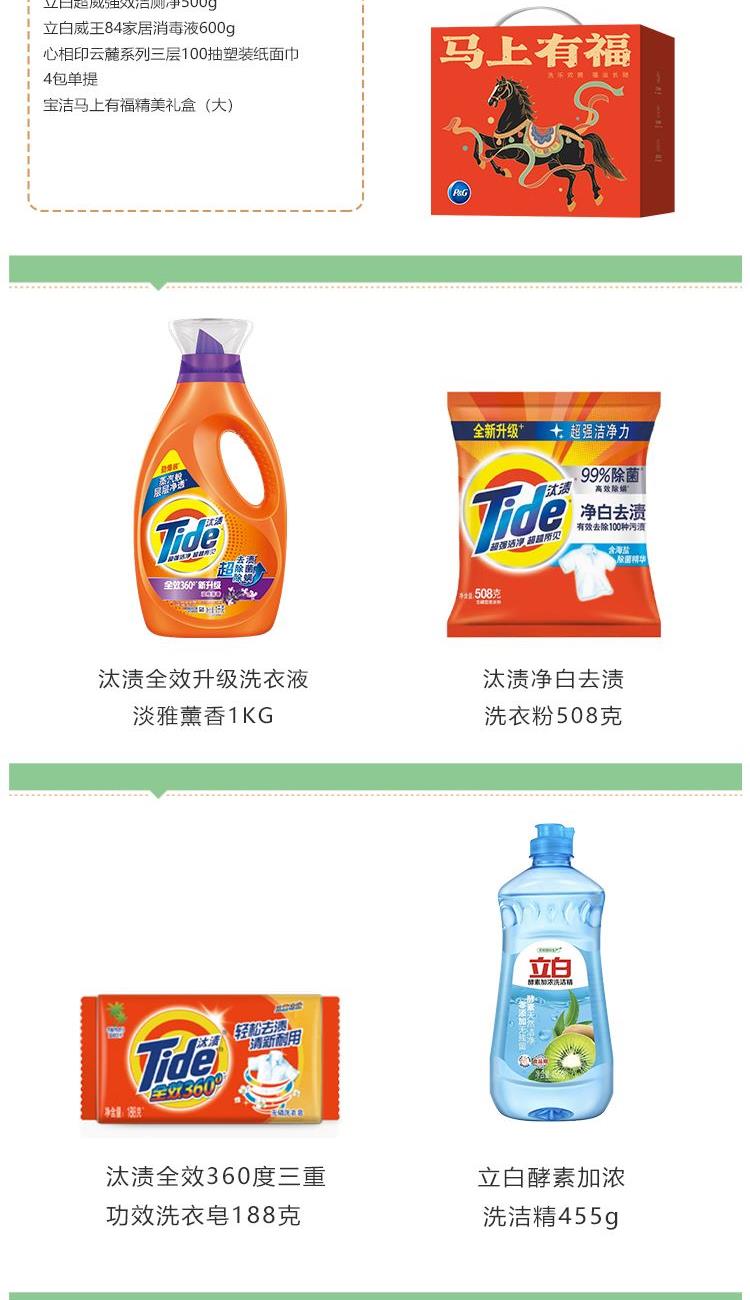 汰渍2合1深层洁净洗衣液1KG 汰渍净白去渍洗衣粉508克 汰渍全效360度三重功效洗衣皂188克 立白酵素加浓洗洁精455g 立白超威强效洁厕净500g 立白威王84家居消毒液600g 心相印云麓系列三层100抽塑装纸面巾4包单提 宝洁马上有福精美礼盒(大)