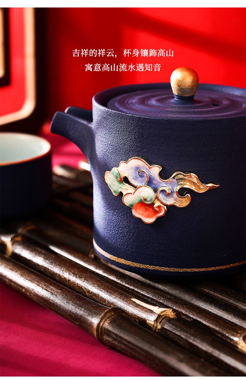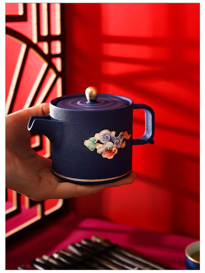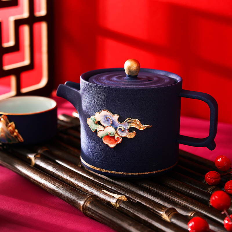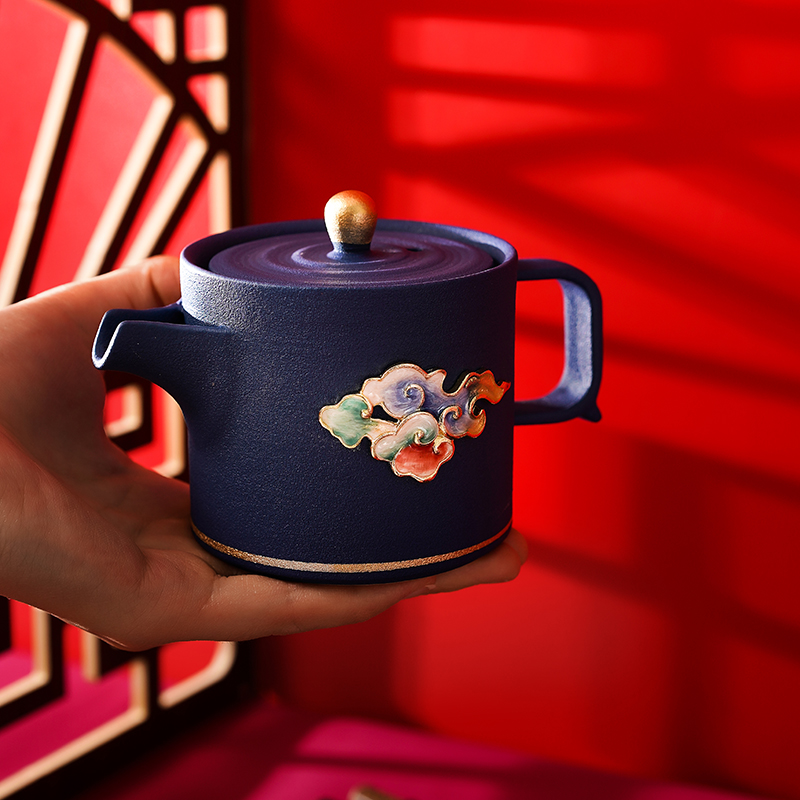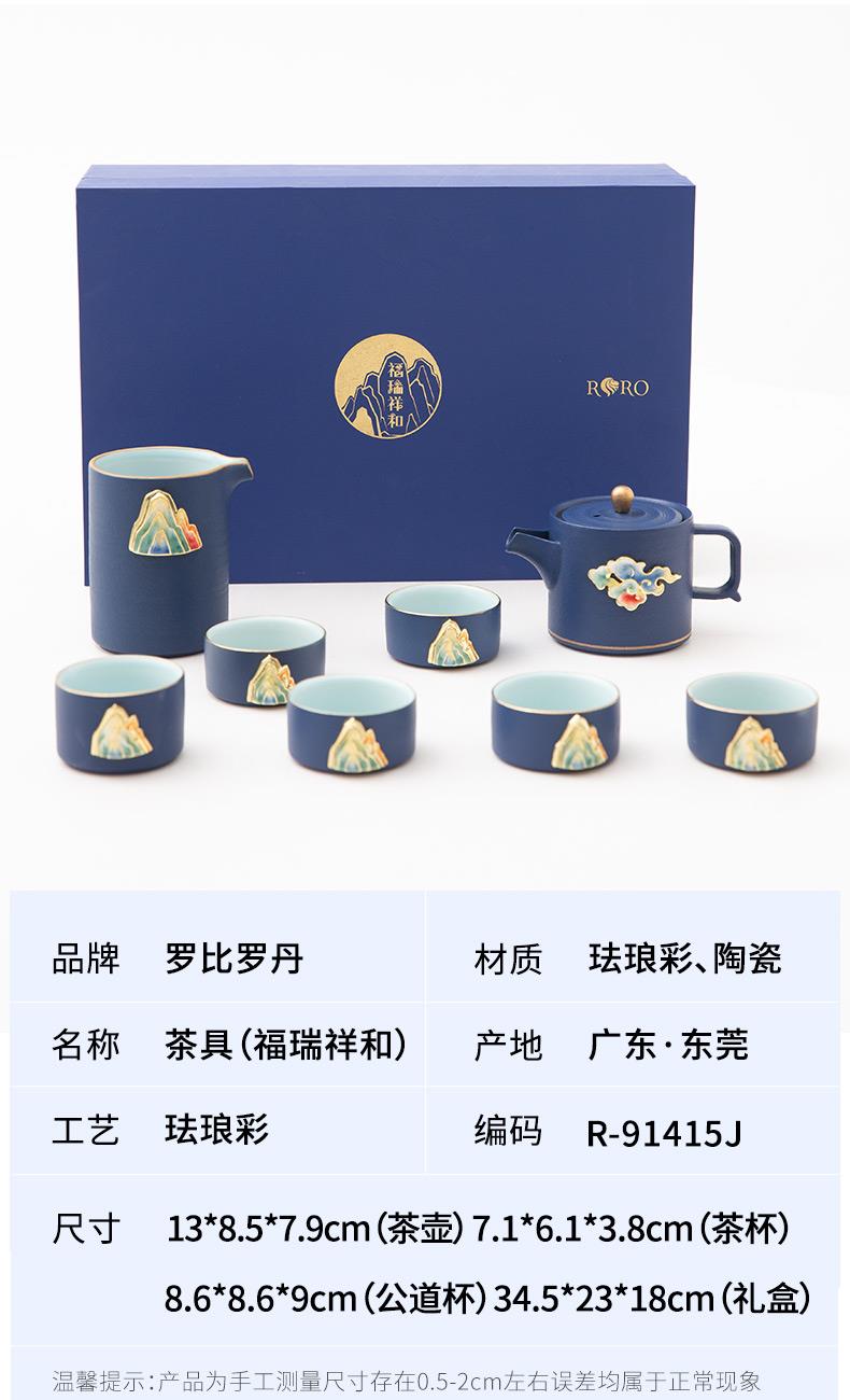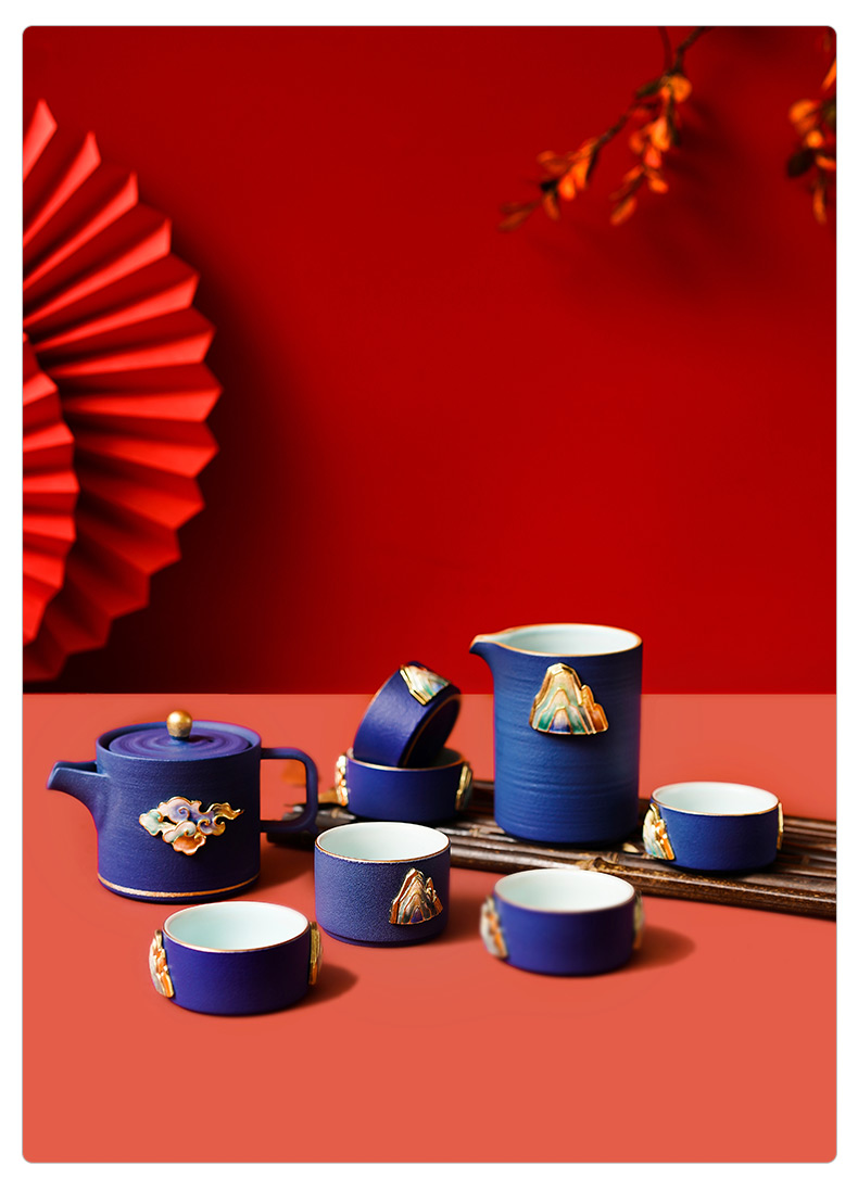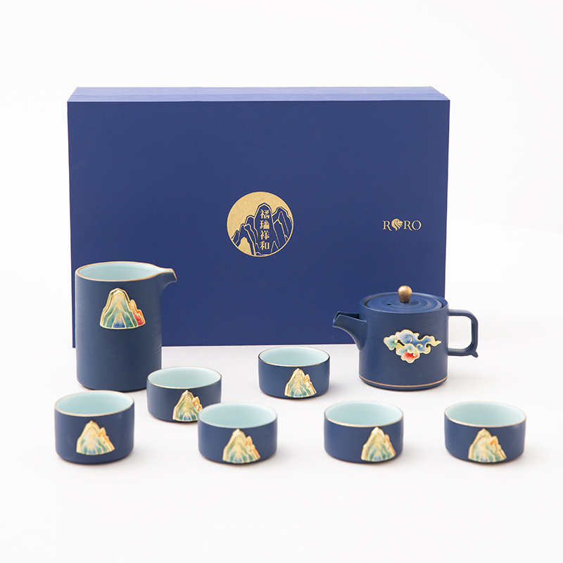 规格:13x8.5x7.9cm(茶壶) 8.6x8.6x9cm(茶海) 7.1x6.1x3.8cm(茶杯) 包装:34.5x23x18cm 灵感源自高山祥云,寓意幸福安康、吉祥如意。配色典雅,富有禅意,视觉上具有国潮美学魅力。壶底及壶顶盖耳为金色,寓意富贵荣华、家业兴旺。