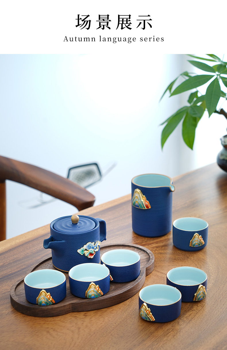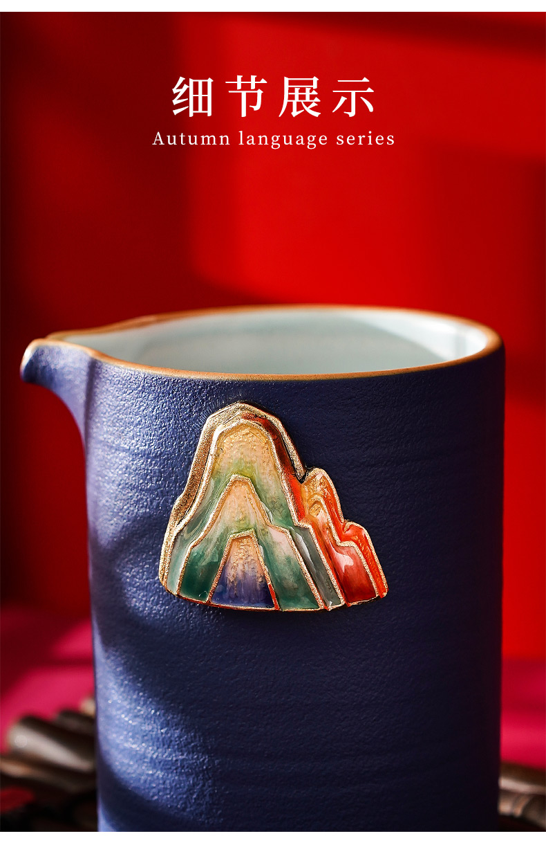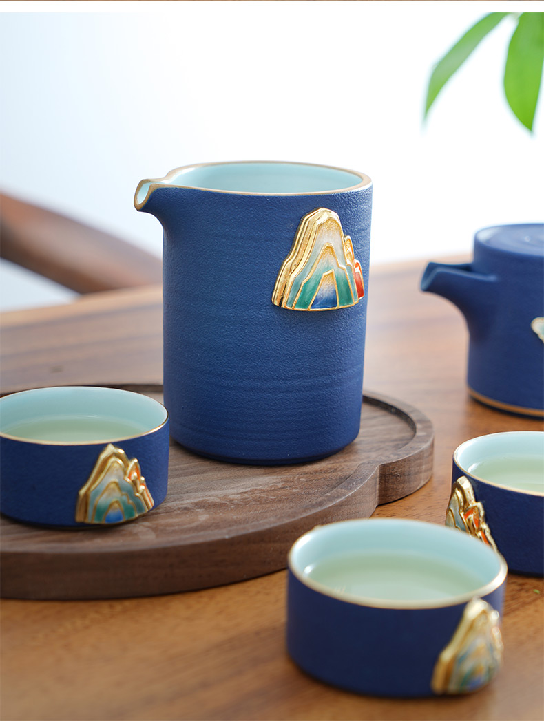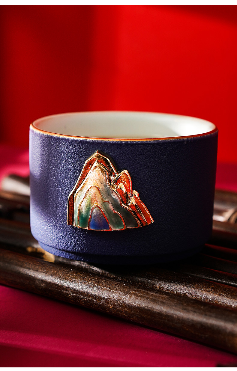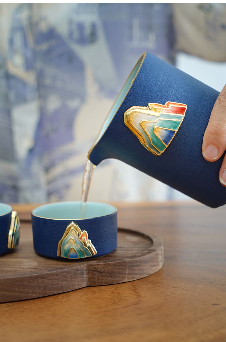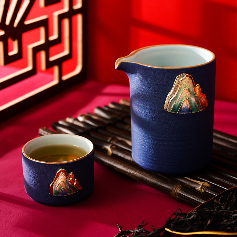 规格:13x8.5x7.9cm(茶壶) 8.6x8.6x9cm(茶海) 7.1x6.1x3.8cm(茶杯) 包装:34.5x23x18cm 灵感源自高山祥云,寓意幸福安康、吉祥如意。配色典雅,富有禅意,视觉上具有国潮美学魅力。壶底及壶顶盖耳为金色,寓意富贵荣华、家业兴旺。
