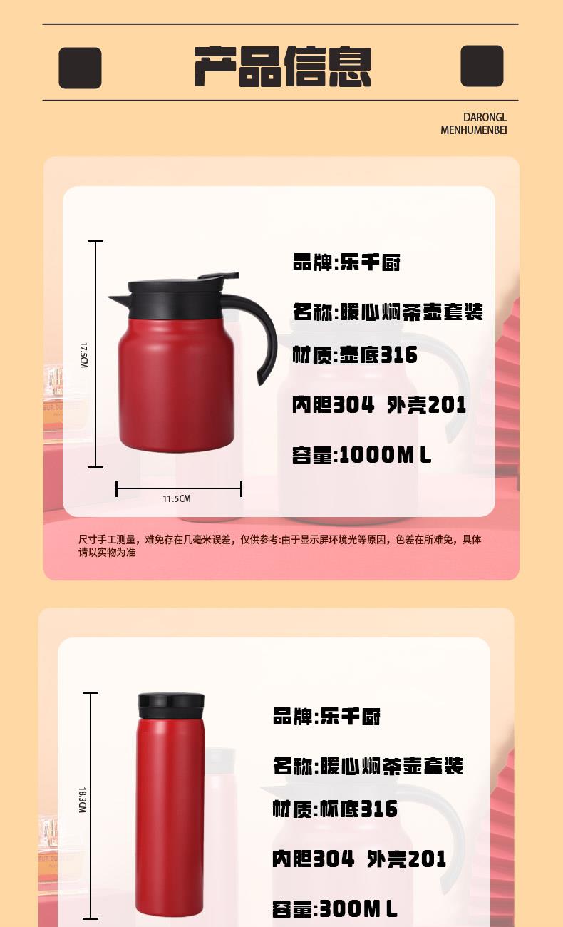 材 质:杯 底SUS316 内胆SUS304 壶 底SUS316 内胆SUS304 容 量:壶1000ml 杯300ml 彩盒尺寸:27.5*14.5*21.8 1. 304不锈钢真空胆身,锁温持久,寒冬热饮常暖; 2. 内胆经电解研磨工艺处理,光滑抗污,符合食品接触标准,清洁省心; 3. 极简杯身线条利落,造型简约不失设计感,轻量便携适配多场景; 4.一杯一壶满足多种运用场景