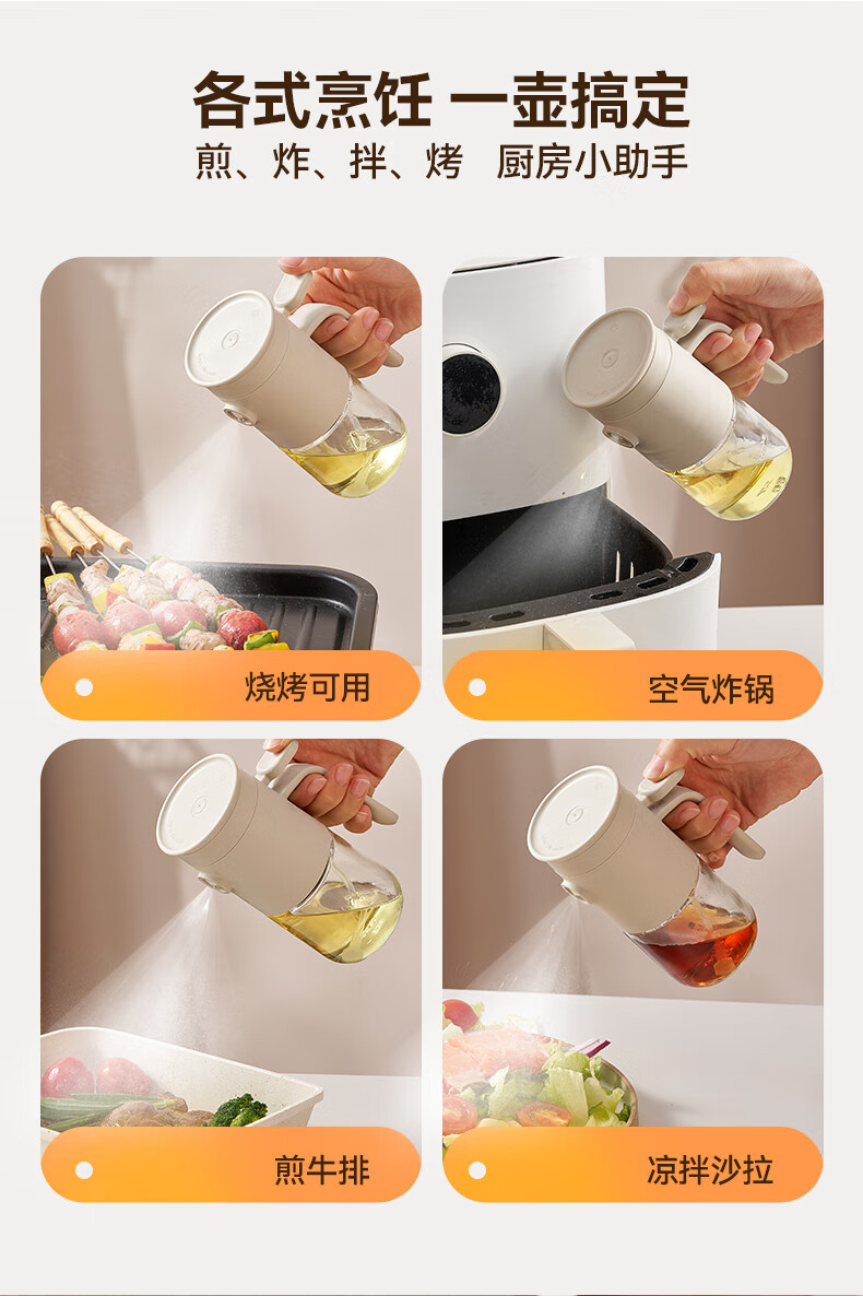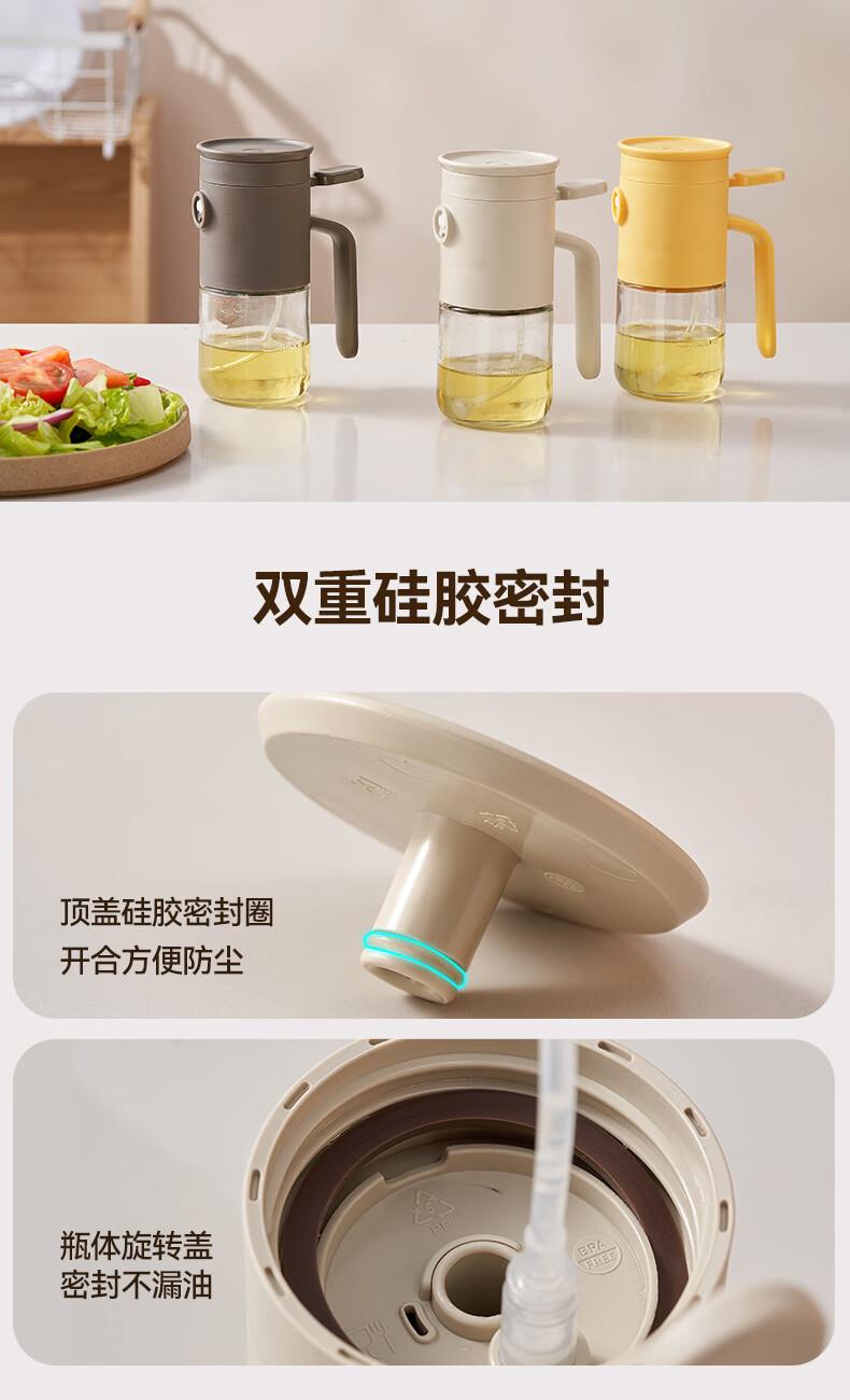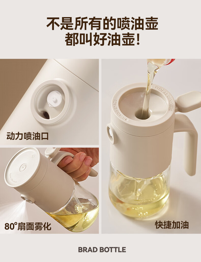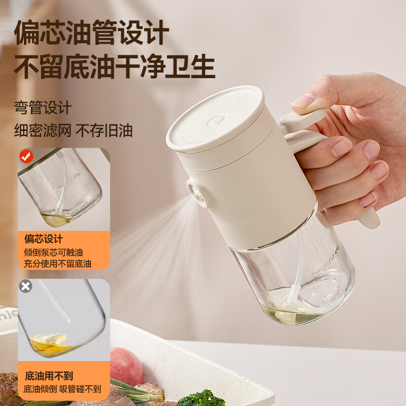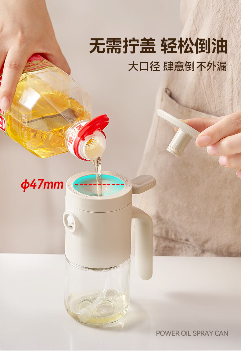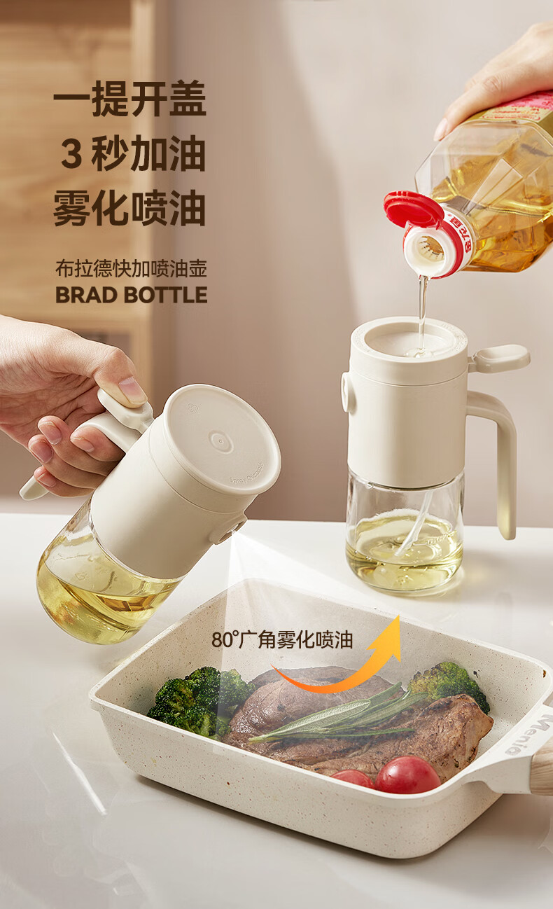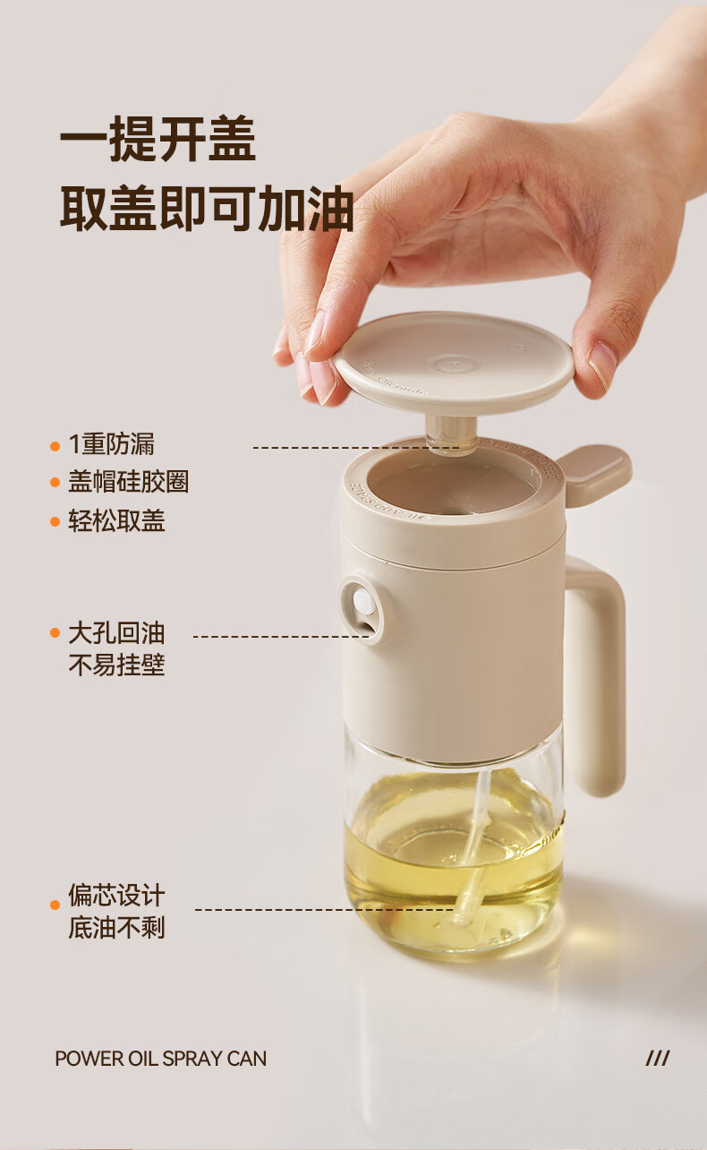 一提开盖3秒加油雾化喷油 无需拧盖 轻松倒油大口径 肆意倒不外漏 “立体广角喷雾”真正的均匀雾化 强压下也能瞬时铺开保持扇形黄金夹角 偏芯油管设计不留底油干净卫生 弯管设计:细密滤网不存旧油 顶盖硅胶密封圈开合方便防尘 瓶体旋转盖密封不漏油