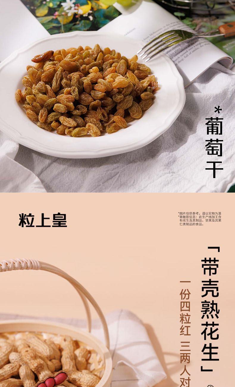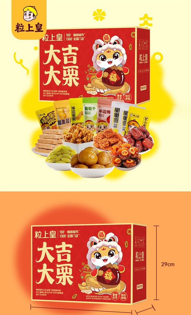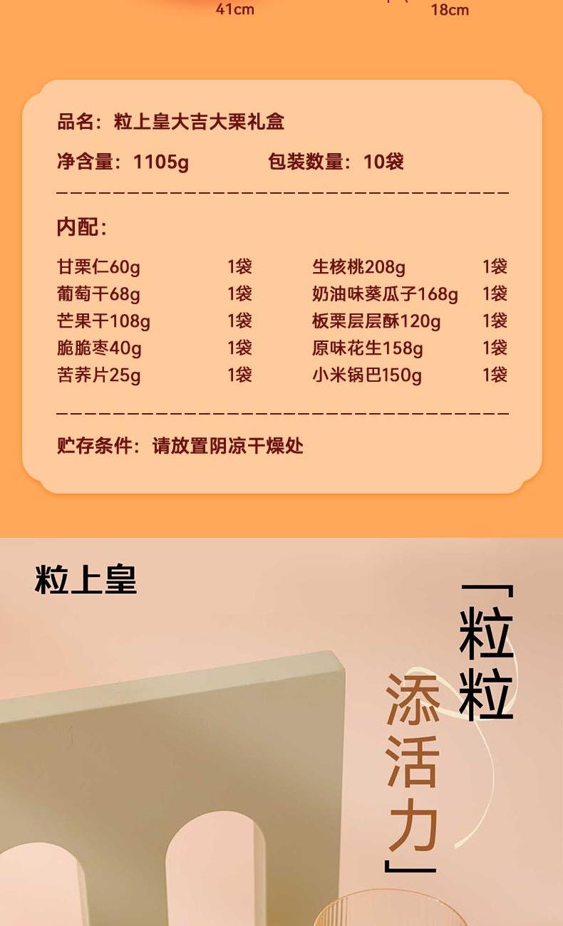 粒上皇甘栗仁60g*1 粒上皇葡萄干68g*1 粒上皇脆脆枣40g*1 粒上皇板栗层层酥120g*1 粒上皇苦荞片25gg*1 粒上皇小米锅巴150g*1 粒上皇芒果干108g*1 粒上皇生核桃208g*1 粒上皇奶油味葵瓜子168g*1 粒上皇原味花生158g*1 红色元素喜庆&春节礼盒*1