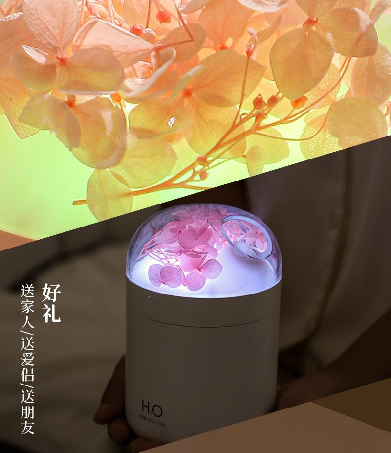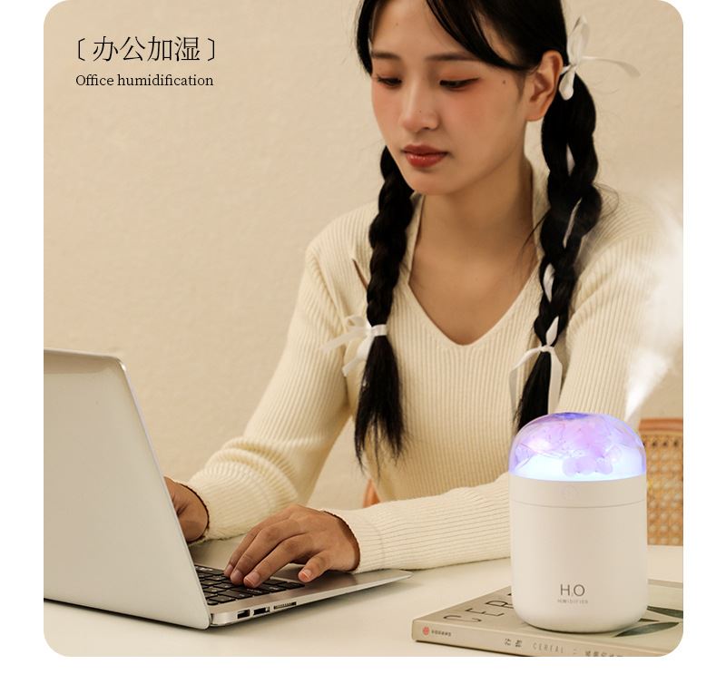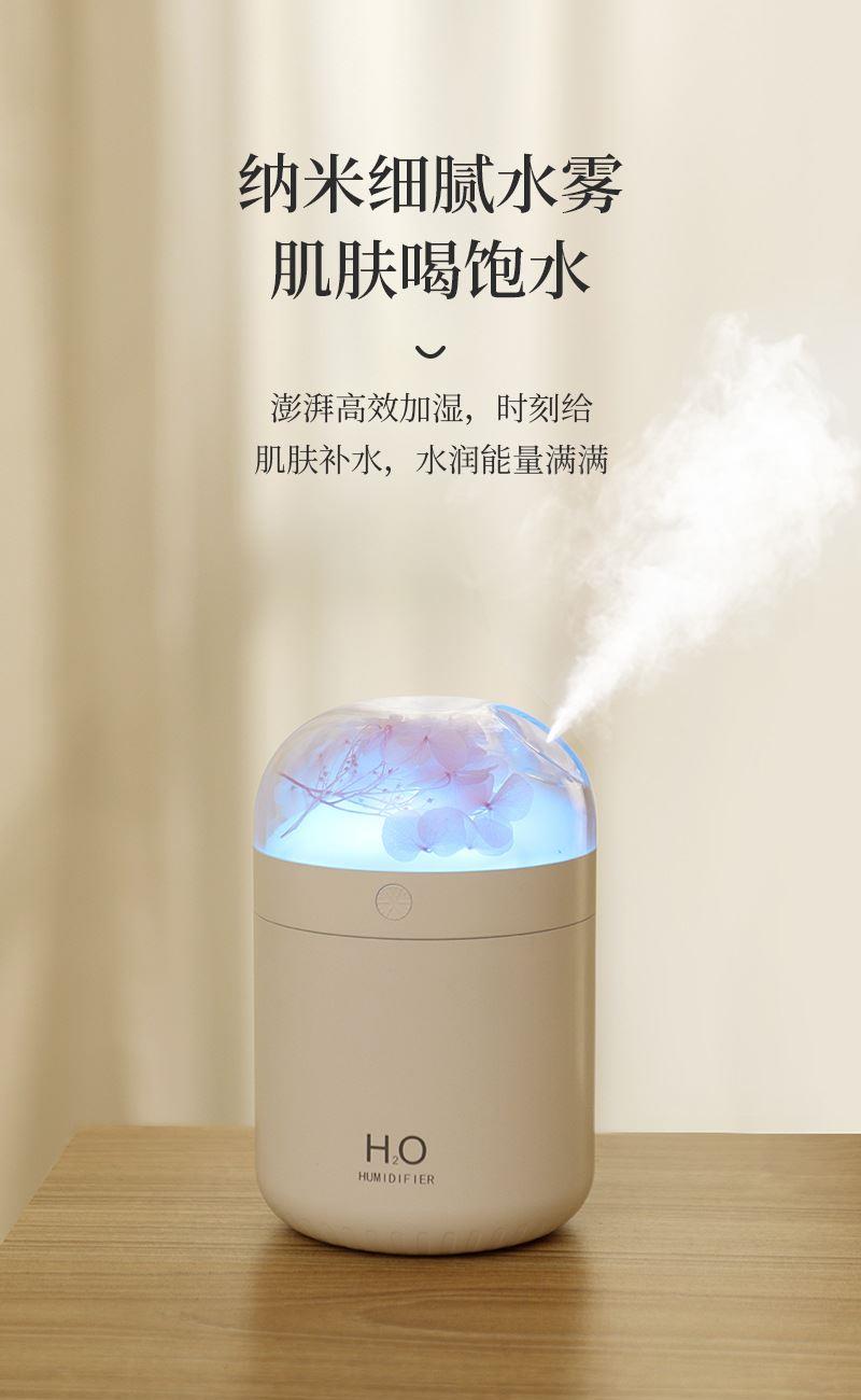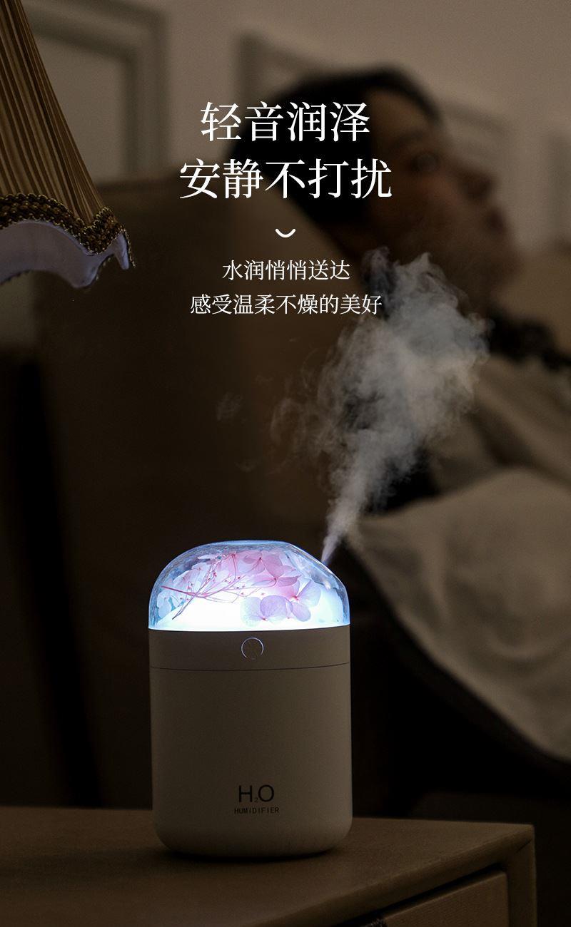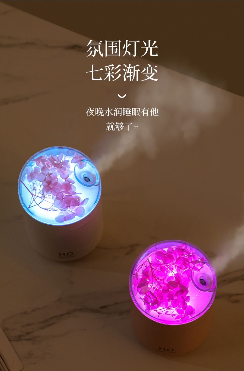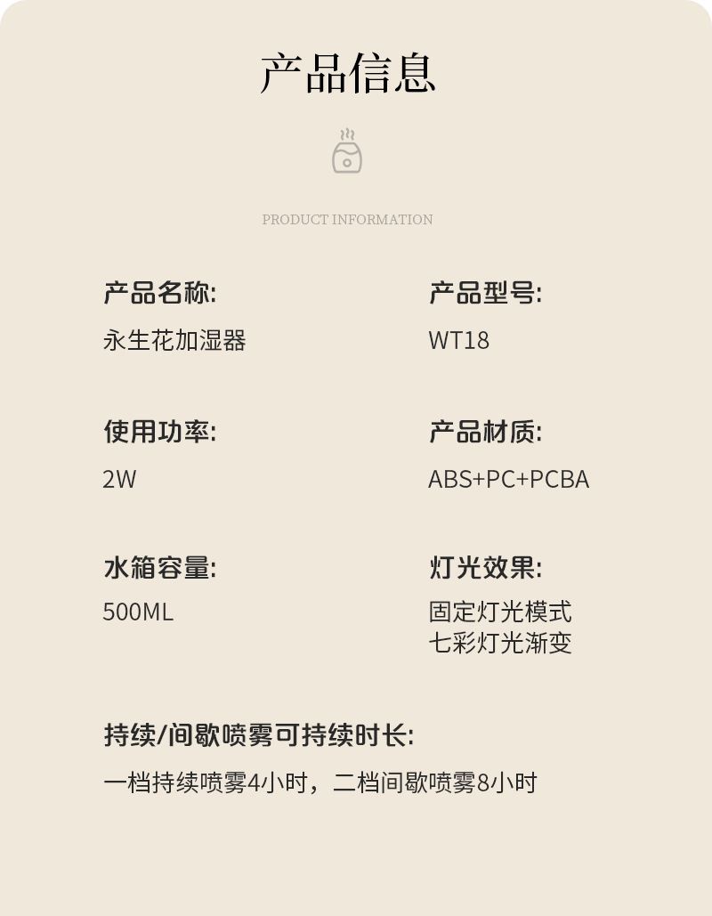 【颜色】粉色、白色 【材质】ABS+PP+硅胶+电子元件 【重量】203G/270G 【水箱容量】500ML 【喷雾量】30-40mL/h 【产品尺寸】98*98*157mm 【包装尺寸】98*98*152mm 【输入电流】5V-1A 【定时时间】定时时间:一档4H,二档8H 七彩灯光,纳米水雾,仿真雪景,氛围夜灯 纳米喷雾,滋润补水,2档大喷雾,一档持续喷雾,二档间歇喷雾 安全加湿,定时断电