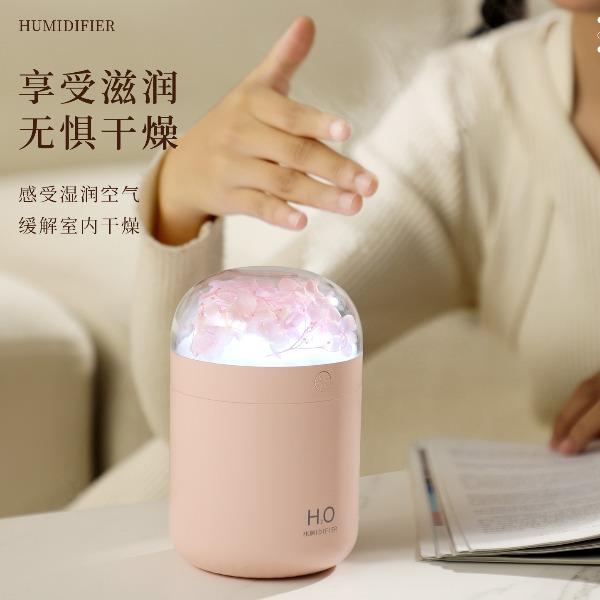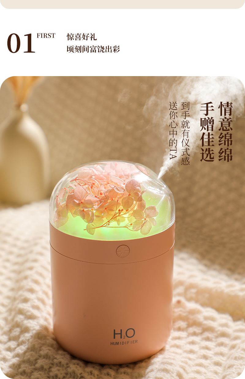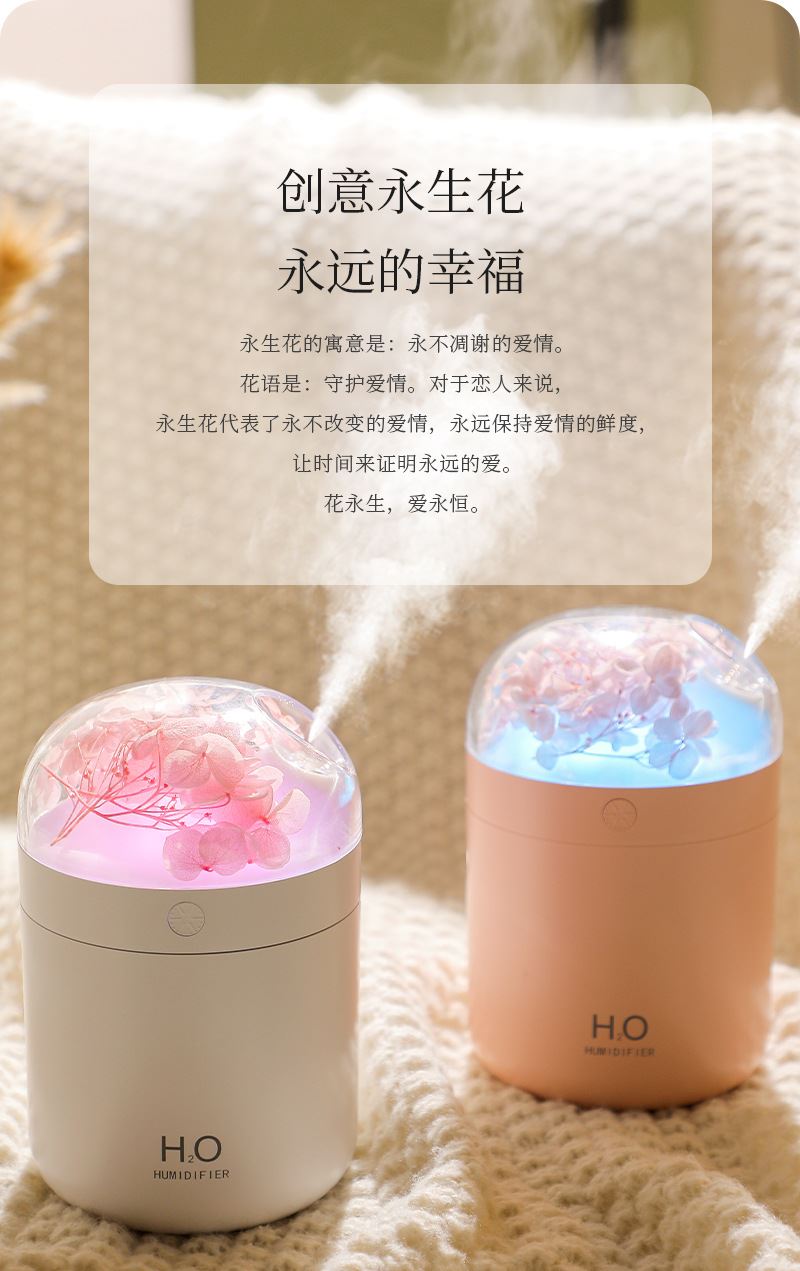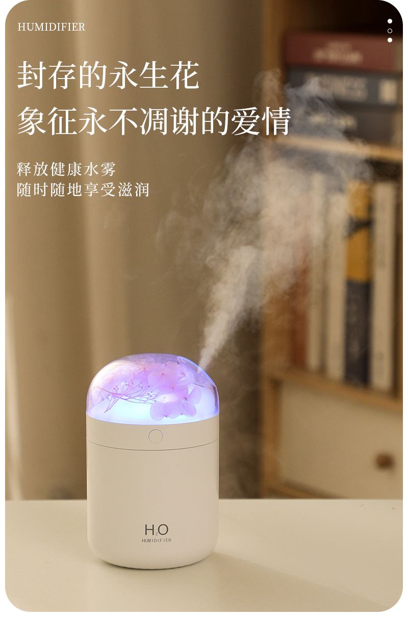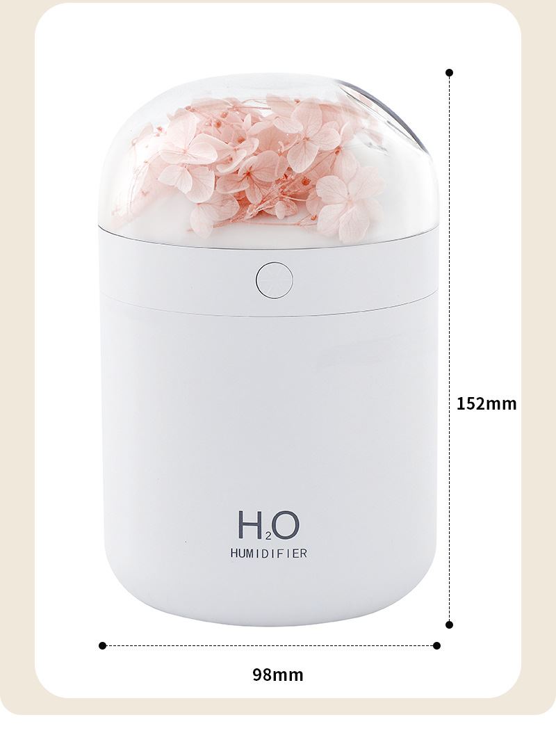 【颜色】粉色、白色 【材质】ABS+PP+硅胶+电子元件 【重量】203G/270G 【水箱容量】500ML 【喷雾量】30-40mL/h 【产品尺寸】98*98*157mm 【包装尺寸】98*98*152mm 【输入电流】5V-1A 【定时时间】定时时间:一档4H,二档8H 七彩灯光,纳米水雾,仿真雪景,氛围夜灯 纳米喷雾,滋润补水,2档大喷雾,一档持续喷雾,二档间歇喷雾 安全加湿,定时断电