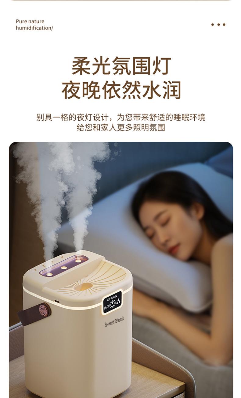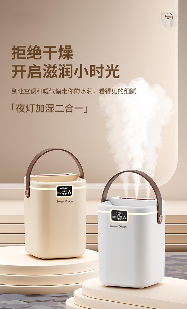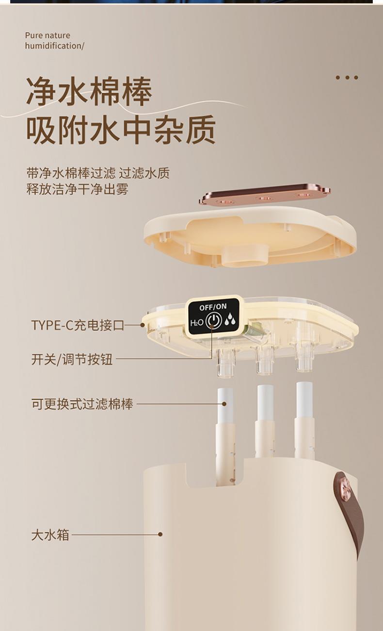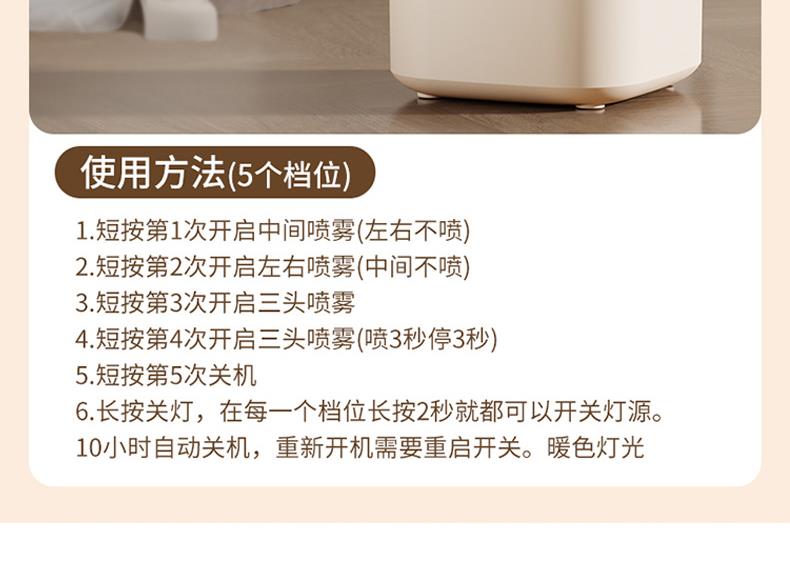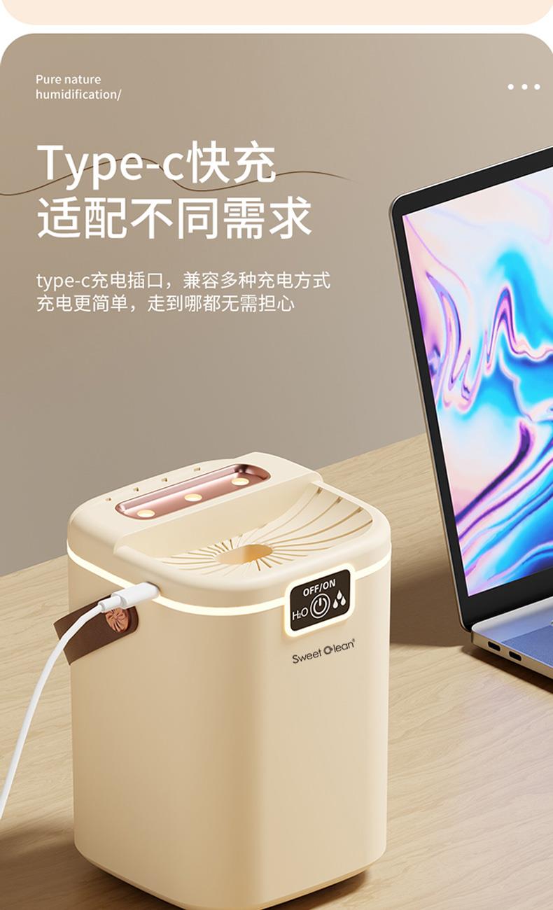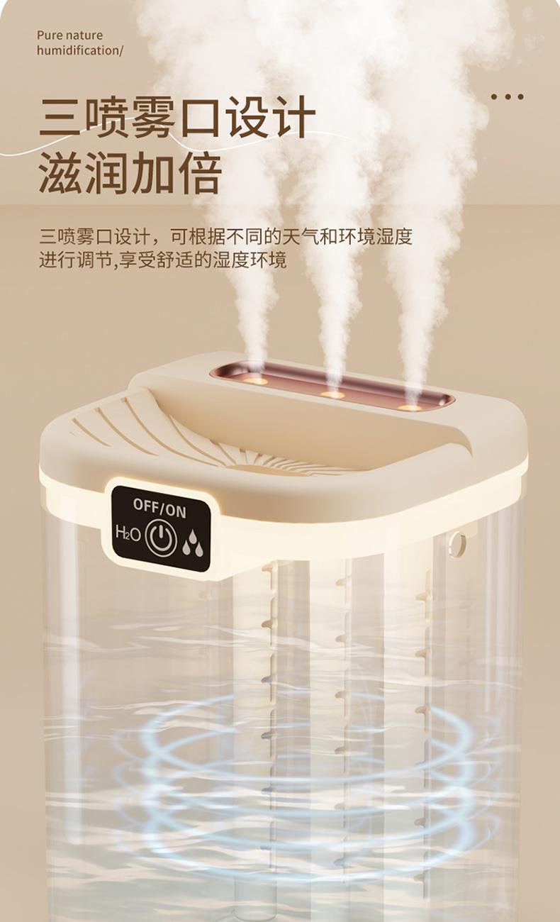 水箱容量:2000ML 输入电压5V~1A 档位5档喷雾调节 产品颜色:简约白 奶油黄 输入接口 :Type-c快充 产品款式:插电式 产品重量:235g 2L 超大储水量:大容量长效续航,加水一次安心用整天,少换水更省心 三喷强力出雾:三孔同步雾化,出雾效率翻倍,全屋快速润湿度拉满 纳米细腻喷雾:超细雾化不积水不打湿桌面,补水均匀更滋润 轻音静音运行:低噪运作不扰眠,卧室办公全天安静使用 柔光氛围小夜灯:温馨柔光护眼伴睡,夜间起夜柔光不刺眼 强效深度雾化:渗透补水不干燥,缓解空调房干涩不适 空调专用好搭档:搭配空调使用,中和干燥空气,守护肌肤水润 母婴安全级材质:无异味安全用料,孕婴家庭安心全天候使用