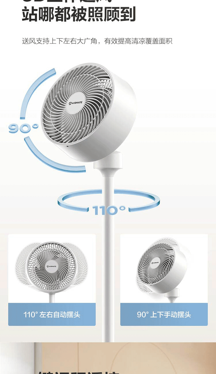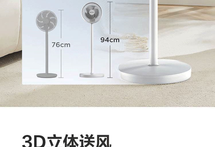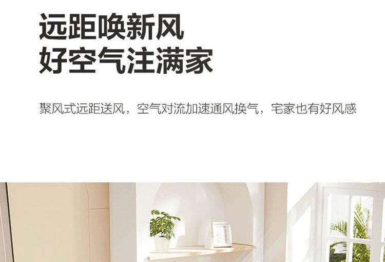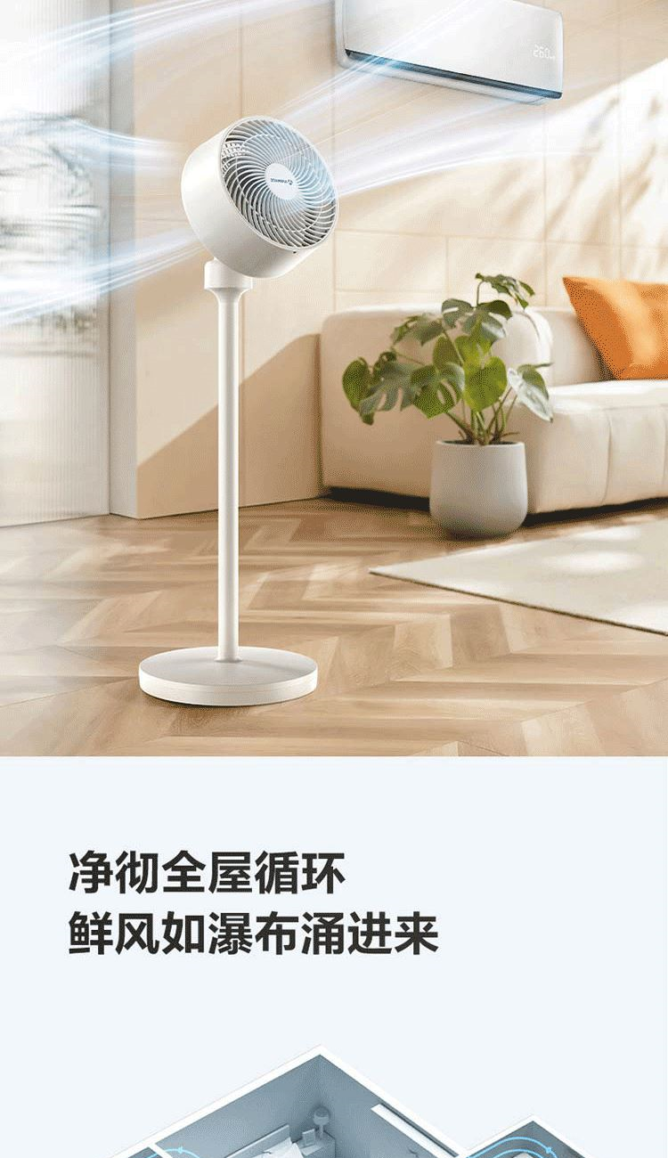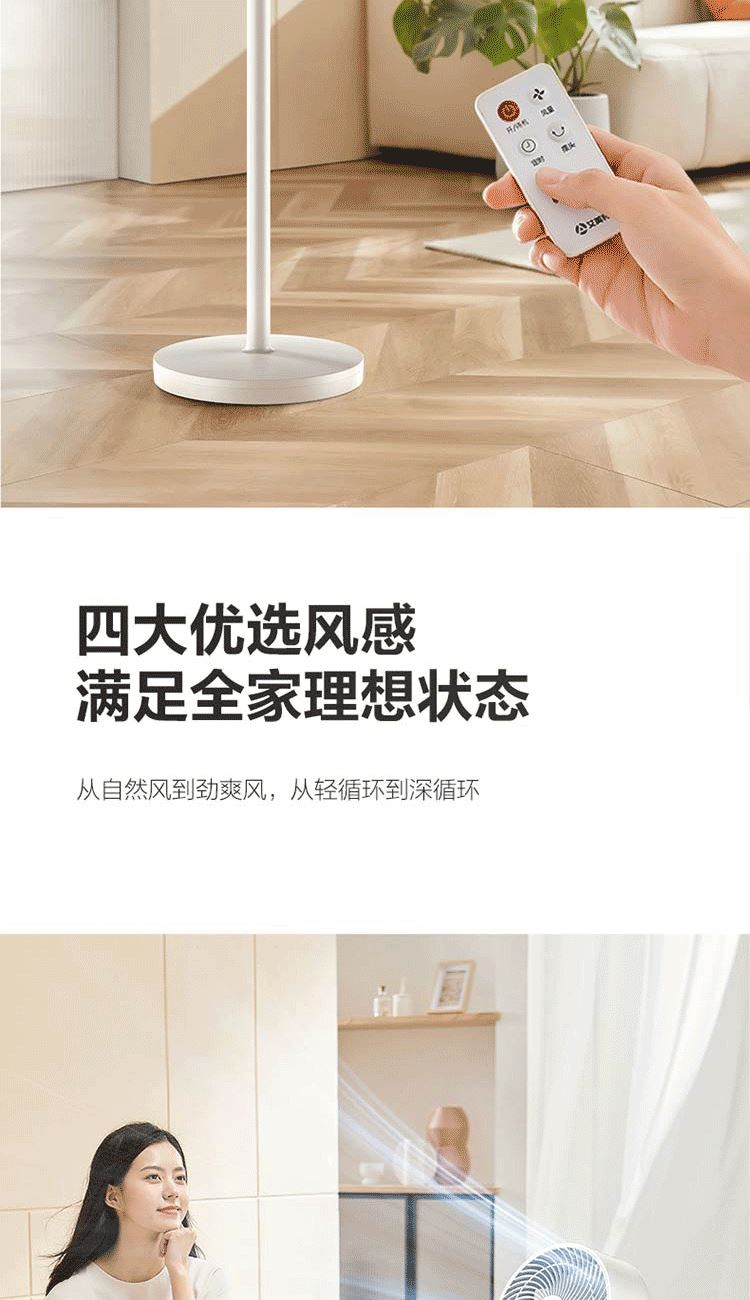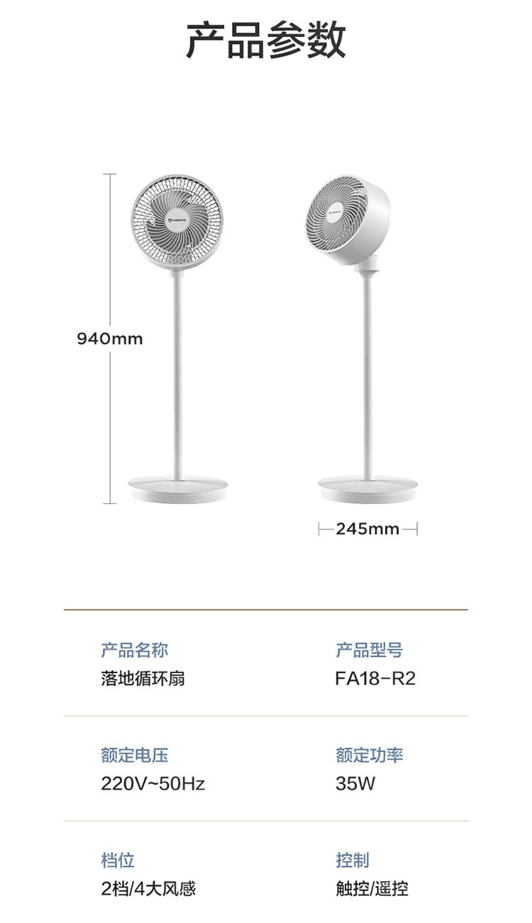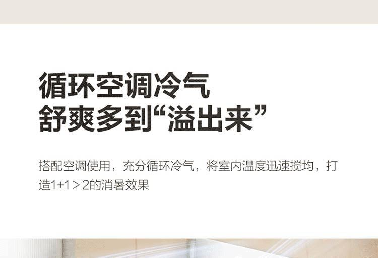 额定功率:35W 额定电压:220V 额定频率:50Hz 档位:2档 噪 音:≤60dB(A) 净重毛重:2.8/3.4KG 控制方式:遥控 装 箱 数:1台/箱 1、【循环整屋空气】整屋空气,秒速循环 2、【大倾角螺旋扇叶】风力强劲,送风距离更远 3、【聚风集中】消除漩涡,吹出自然风 4、【2档风量】2档随意调节 5、【94CM身高】颀长身姿,送风范围更广 6、【3D立体送风】左右110°自动摆头,上下90°手动摆头 7、【7寸扇头】精致小巧,不占空间