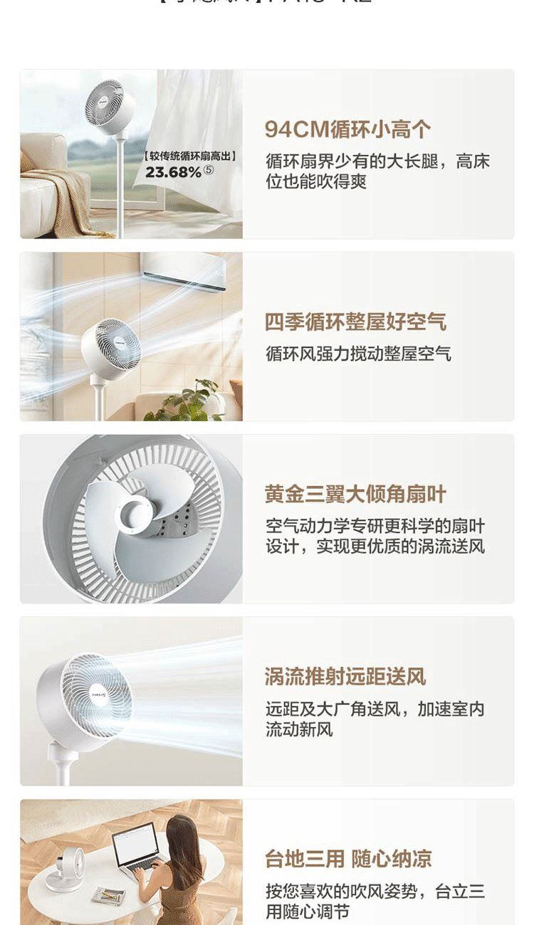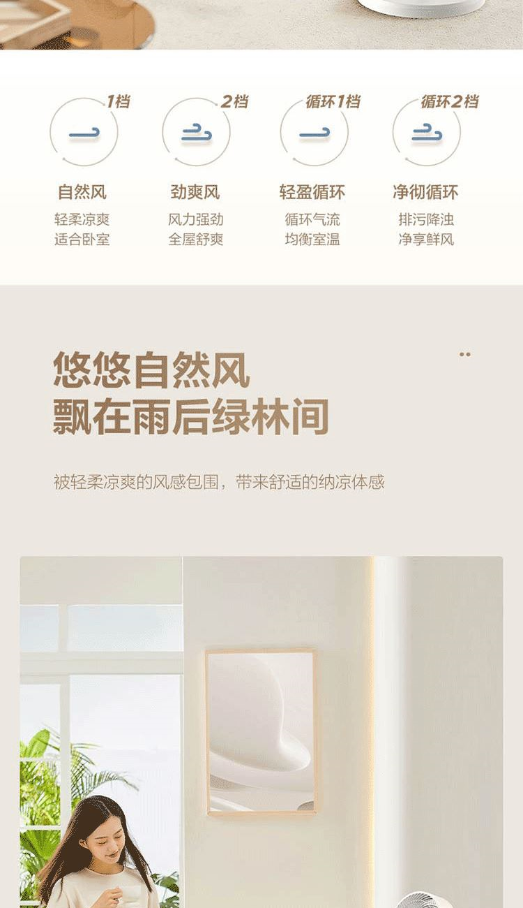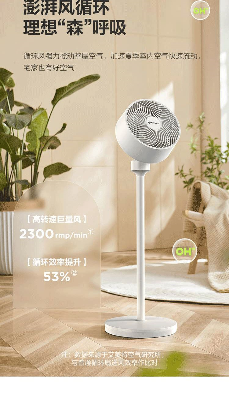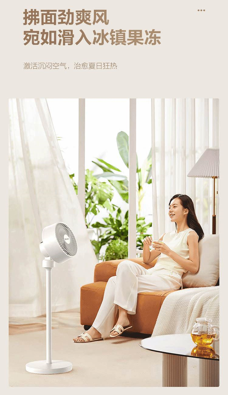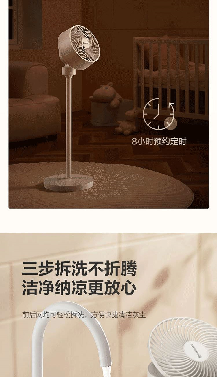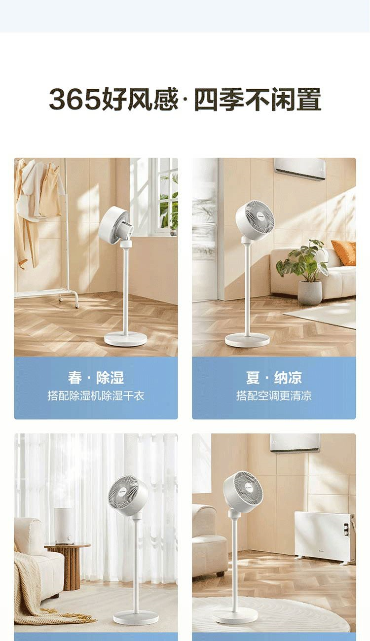 额定功率:35W 额定电压:220V 额定频率:50Hz 档位:2档 噪 音:≤60dB(A) 净重毛重:2.8/3.4KG 控制方式:遥控 装 箱 数:1台/箱 1、【循环整屋空气】整屋空气,秒速循环 2、【大倾角螺旋扇叶】风力强劲,送风距离更远 3、【聚风集中】消除漩涡,吹出自然风 4、【2档风量】2档随意调节 5、【94CM身高】颀长身姿,送风范围更广 6、【3D立体送风】左右110°自动摆头,上下90°手动摆头 7、【7寸扇头】精致小巧,不占空间