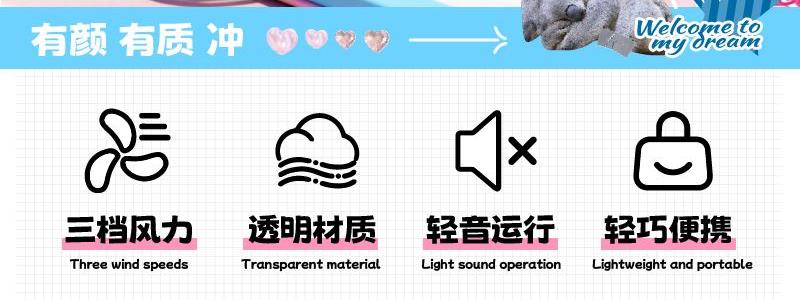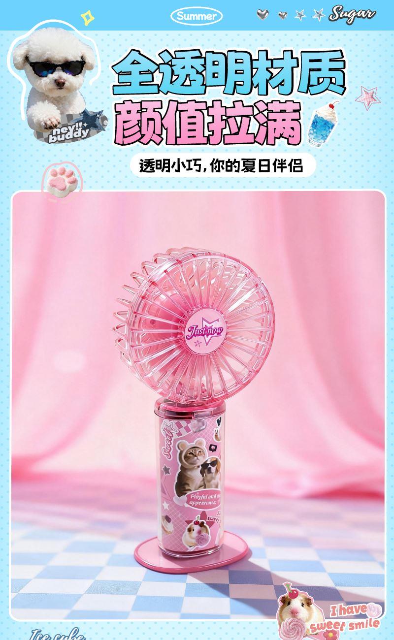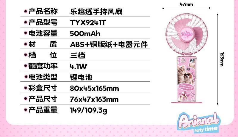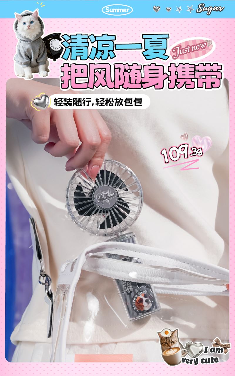 产品颜色:粉色、蓝色、灰色 产品尺寸:76x47x163mm 电池容量:500mAh 风速档位:3档 充电时间:2H 使用时间:60-120分钟 外箱尺寸:53.5*47.5*36.2cm 整箱毛/净重:17.3/16.3kg 备注:本产品须整箱发货 温馨提示:季节品库存数据波动较大,以当天确认出货时间为准