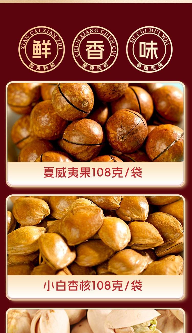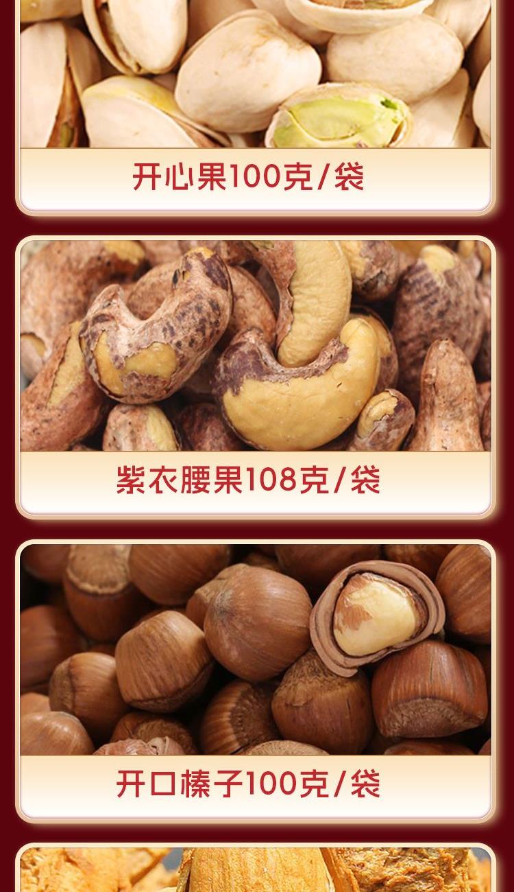 夏威夷果108g 小白杏核108g 开口榛子100g 巴旦木108g 碧根果108g 开心果100g 紫衣腰果108g 纸皮核桃158g