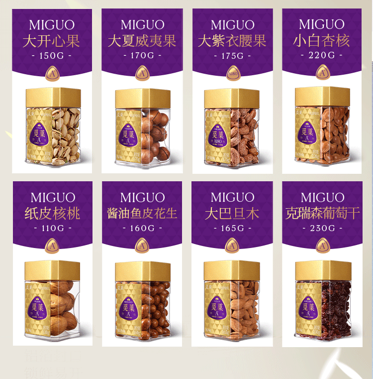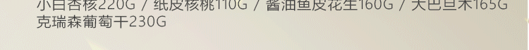 大开心果150g 大夏威夷果170g 小白杏核220g A180大紫衣腰果175g 纸皮核桃110g 酱油鱼皮花生160g 大巴旦木165g 克瑞生葡萄干 230g