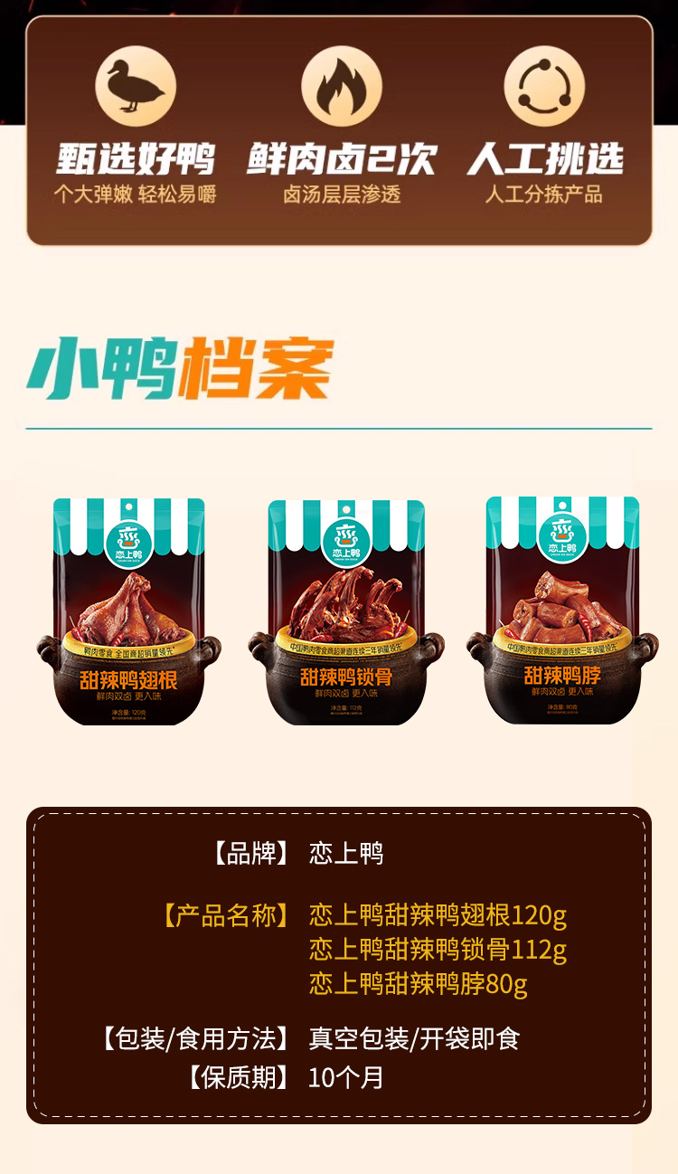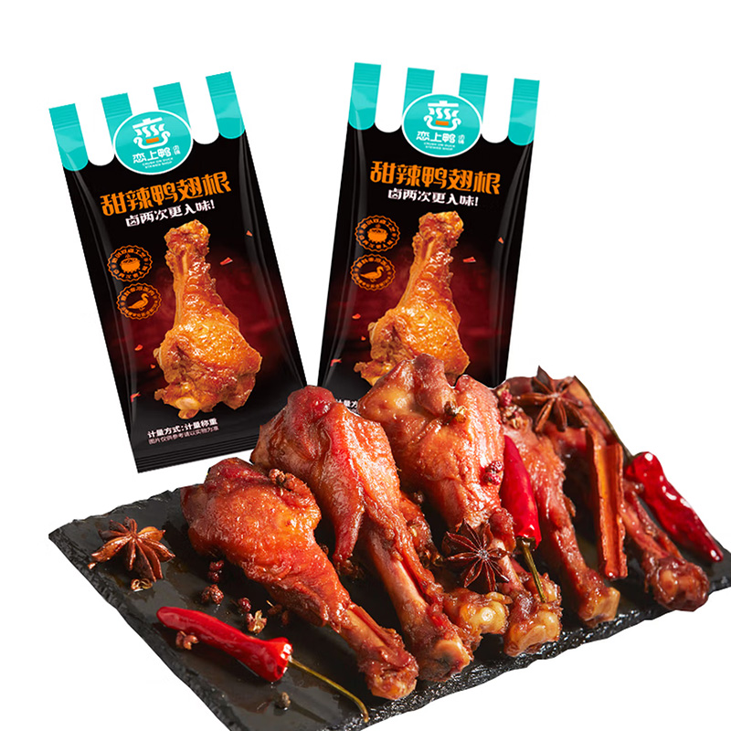 恋上鸭甜辣鸭脖80g*1 恋上鸭甜辣鸭翅根120g*1 恋上鸭甜辣鸭锁骨 112g*1