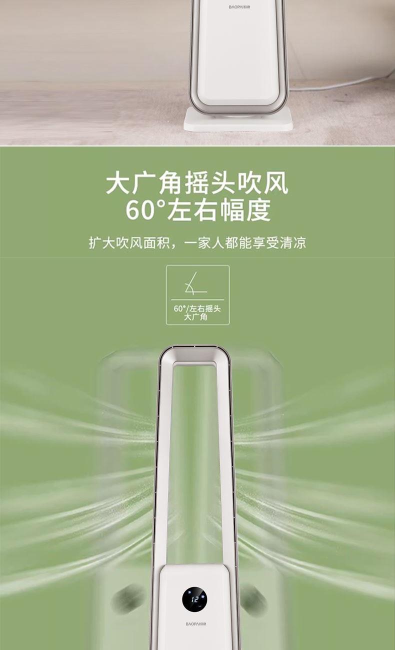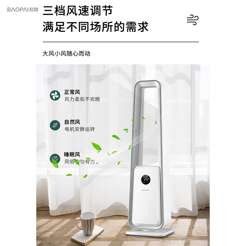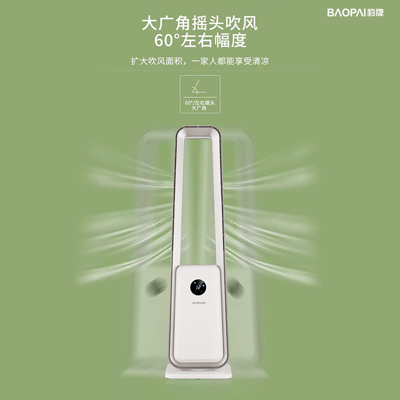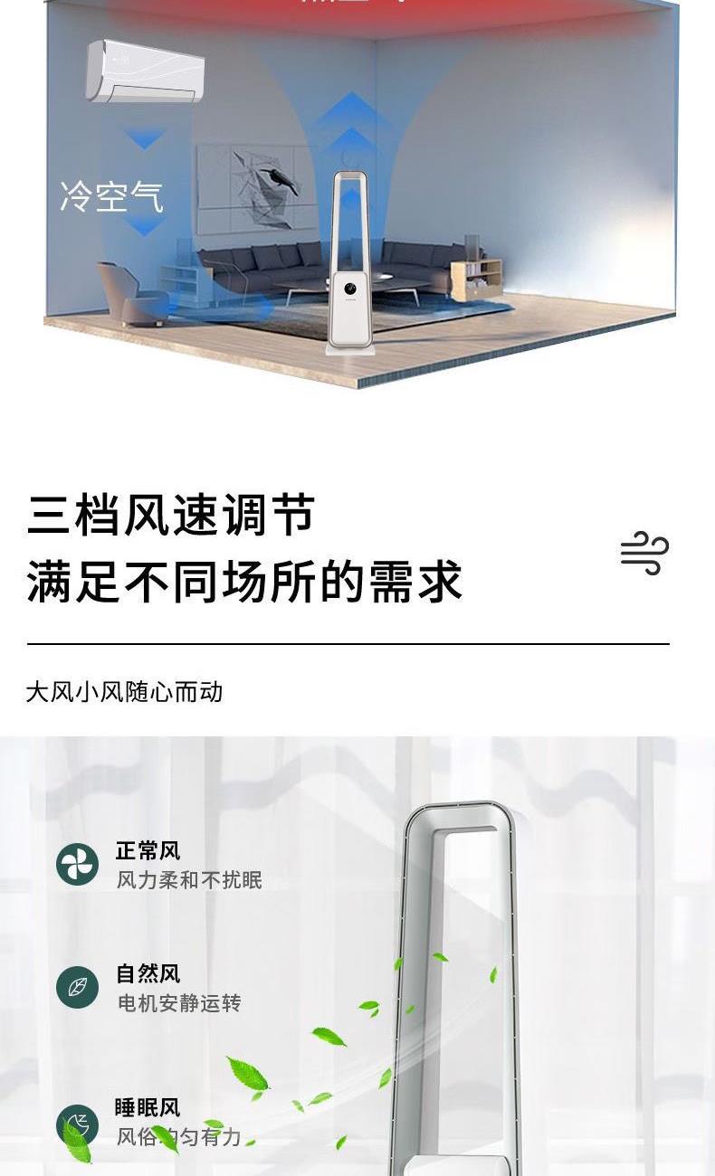 产品材质:ABS 额定功率:60W 额定电压/频率:220V~50Hz 控制方式:遥控+触摸 产品重量: 3.57kg 产品尺寸:240*216*903mm 包装尺寸:935*255*270mm 高速循环气流增大风量输出 高效电容电机,低噪音、长寿命 遥控控制,12小时预约定时 3档风速调节,刚柔随心 触屏面板操作,简单易懂 60°左右摇头广角送风 300万负离子净化空气 自然风、睡眠风、正常风,3种送风模式