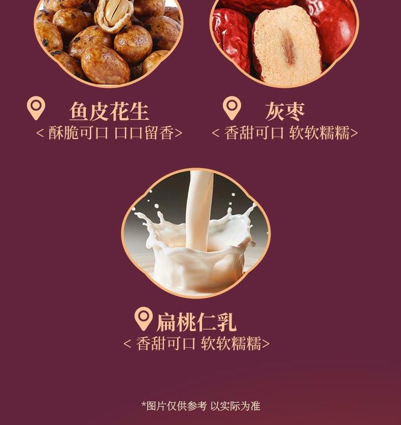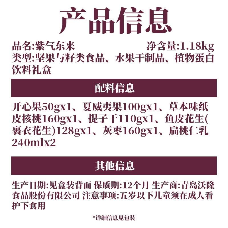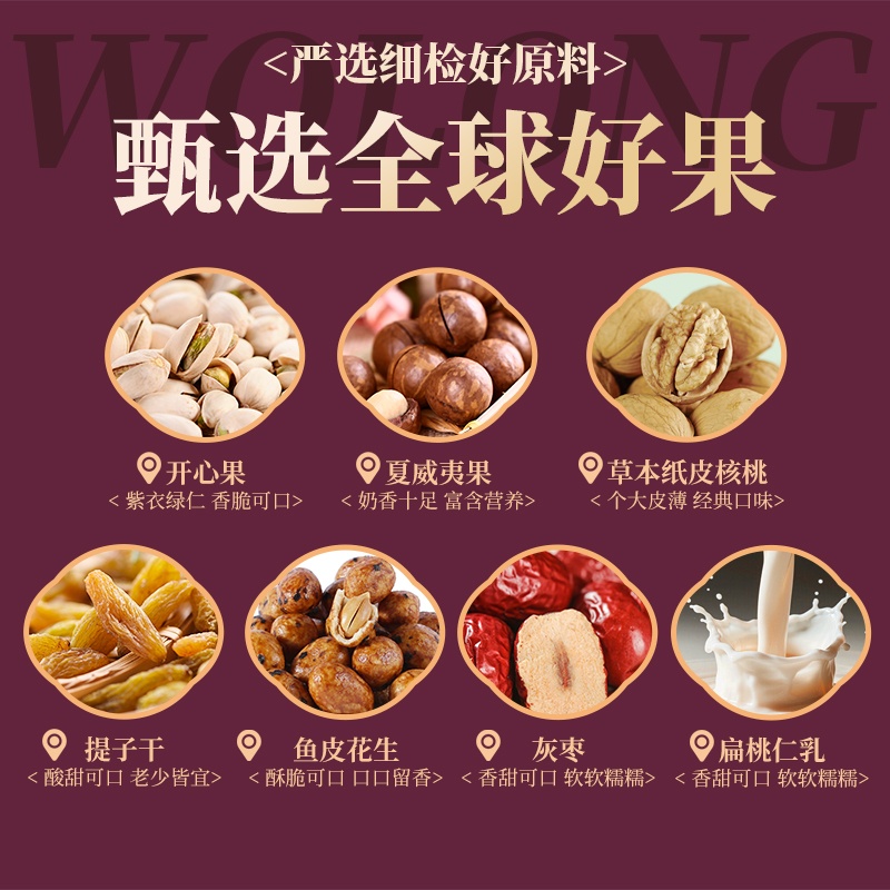 口袋开心果 50g×1袋 草本味纸皮核桃 160g×1袋 夏威夷果 100g×1袋 提子干 110g×1袋 灰枣 160g×1袋 鱼皮花生(裹衣花生) 128g×1袋 扁桃仁乳 240mL×2罐