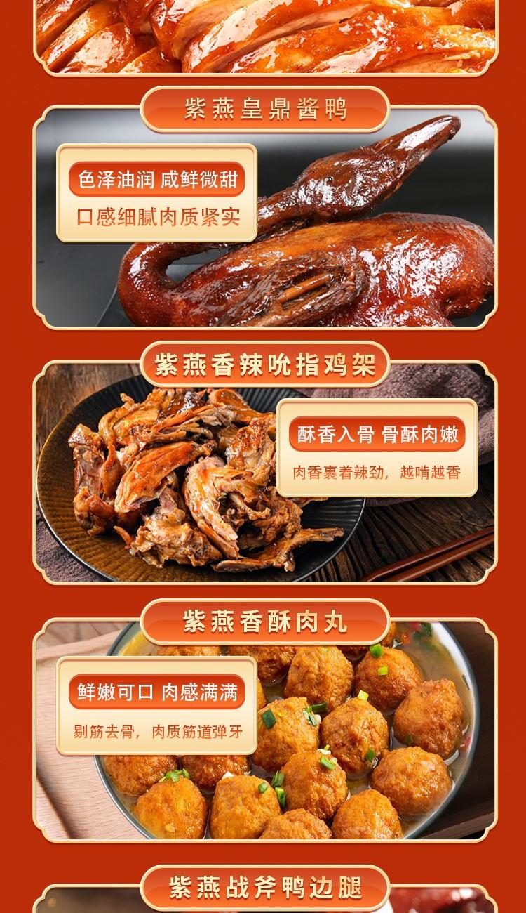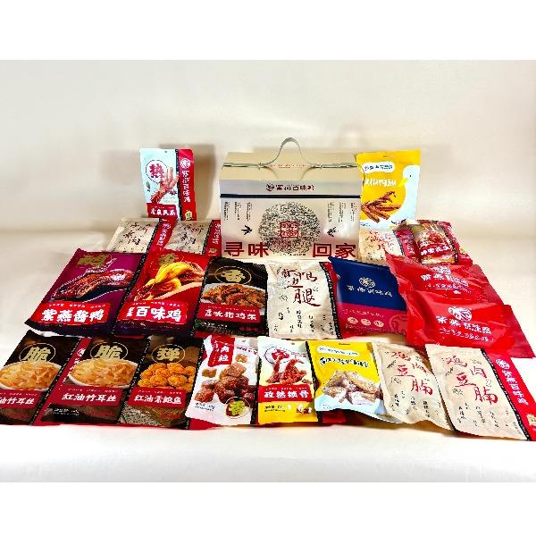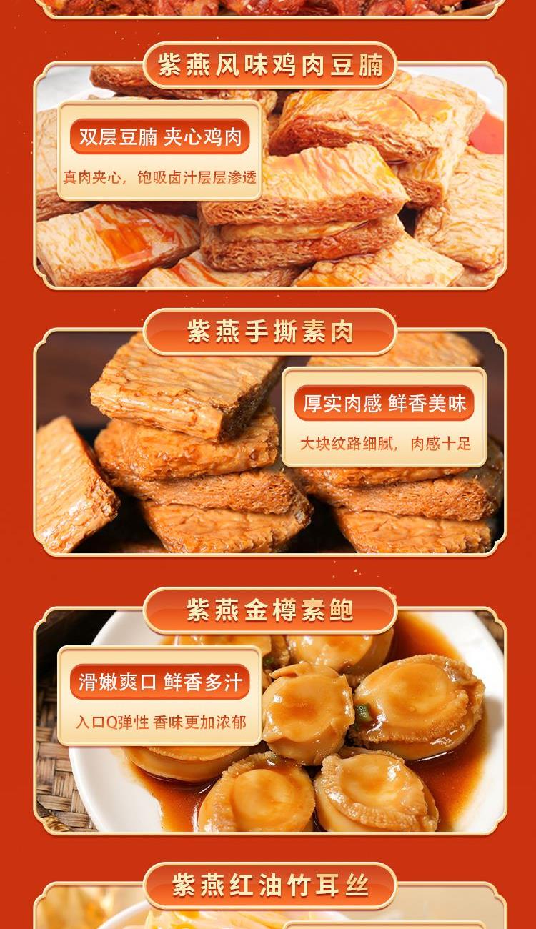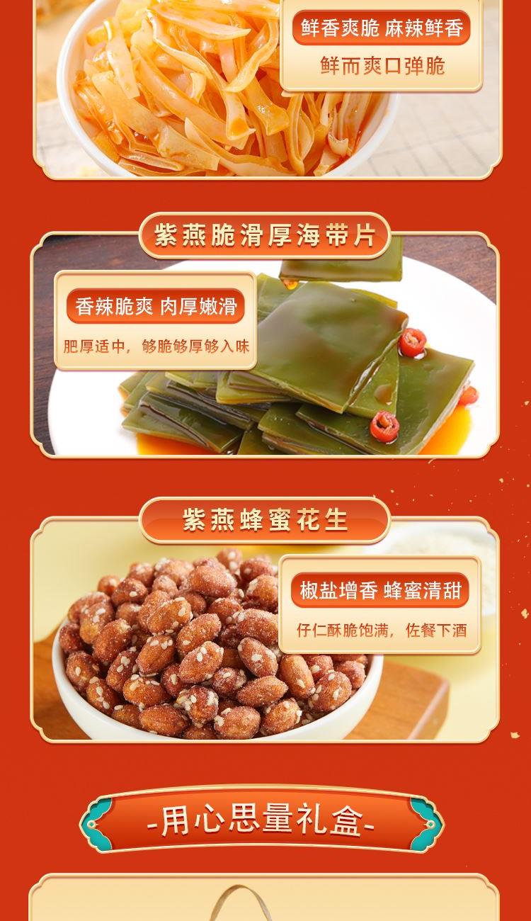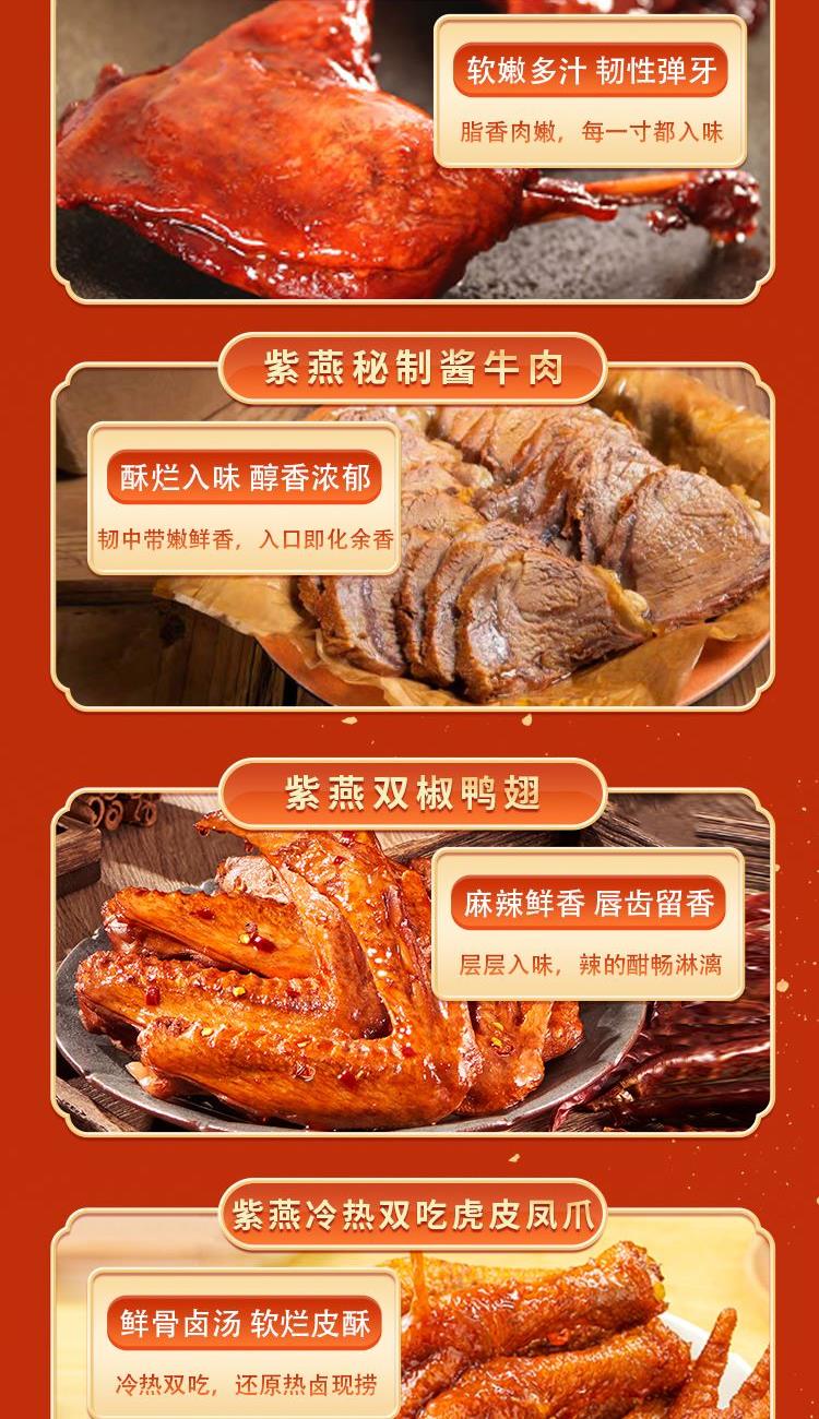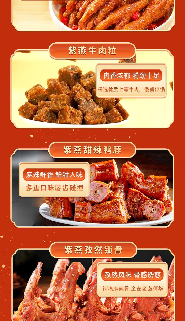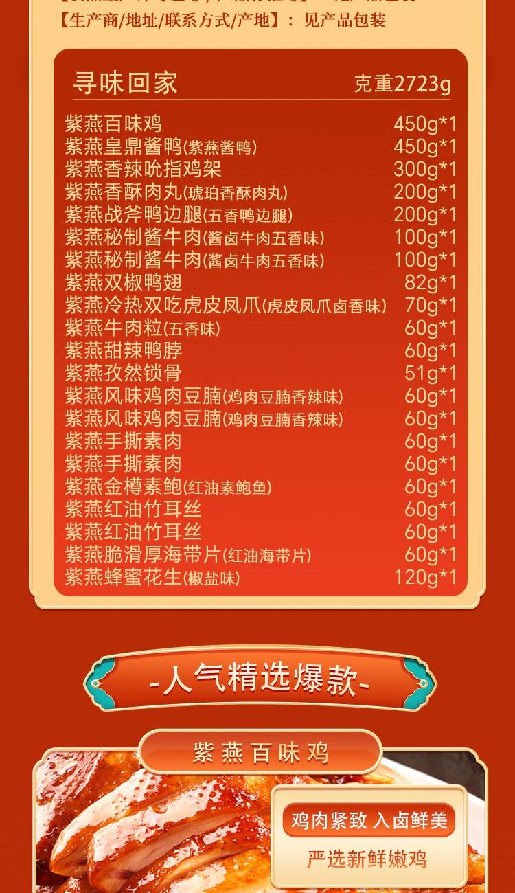 内容物配置: 紫燕百味鸡450g*1 紫燕皇鼎酱鸭(紫燕酱鸭)450g*1 紫燕香辣吮指鸡架300g*1 紫燕香酥肉丸(琥珀香酥肉丸)200g*1 紫燕战斧鸭边腿(五香鸭边腿)200g*1 紫燕秘制酱牛肉(酱卤牛肉五香味)100g*1 紫燕秘制酱牛肉(酱卤牛肉五香味)100g*1 紫燕双椒鸭翅82g*1 紫燕冷热双吃虎皮凤爪(虎皮凤爪卤香味)70g*1 紫燕牛肉粒(五香味)60g*1 紫燕甜辣鸭脖60g*1 紫燕孜然锁骨51g*1 紫燕风味鸡肉豆腩(鸡肉豆腩香辣味)60g*1 紫燕风味鸡肉豆腩(鸡肉豆腩香辣味)60g*1 紫燕手撕素肉60g*1 紫燕手撕素肉60g*1 紫燕金樽素鲍(红油素鲍鱼)60g*1 紫燕红油竹耳丝60g*1 紫燕红油竹耳丝60g*1 紫燕脆滑厚海带片(红油海带片)60g*1 紫燕蜂蜜花生(椒盐味)120g*1 寻味回家礼盒+组装+外盒