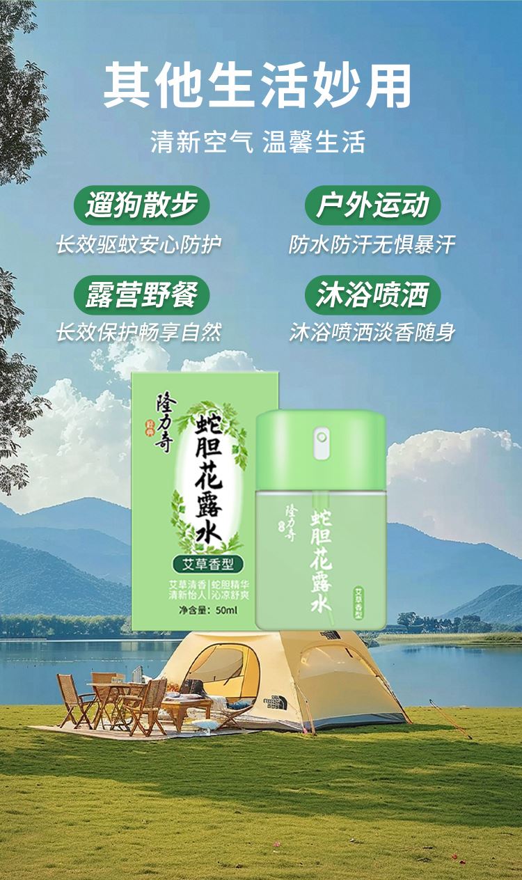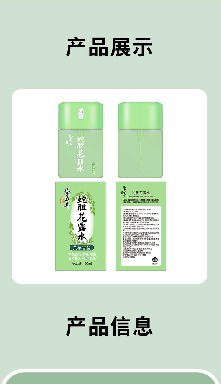 隆力奇艾草香型蛇胆花露水 50ml 货号:LLQ-2025050602 净含量:50ml 保 质 期:3年 功效:驱蚊止痒 提神醒脑 持久凝香 喷头设计,简单易用 外箱尺寸:313*217*235mm 产品卖点: 1.天然艾草香氛,驱蚊同时舒缓安神; 2.草本温和配方,快速止痒不刺激肌肤 3.长效防护12小时,清爽便携全家适用。