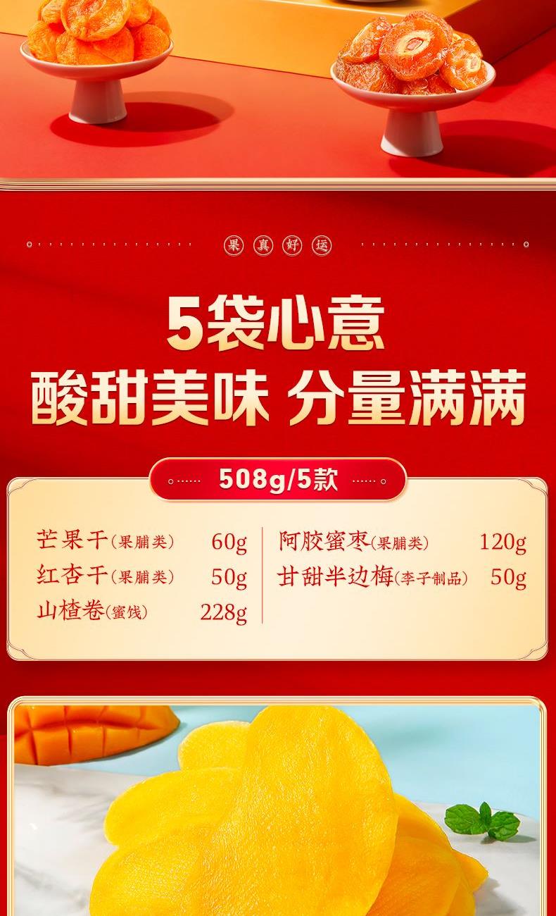 礼盒尺寸mm(长*宽*高):300*90*240 内配:芒果干 60g 红杏干 50g 甘甜半边梅50g 阿胶蜜枣 120g 山楂卷(蜜饯) 228g