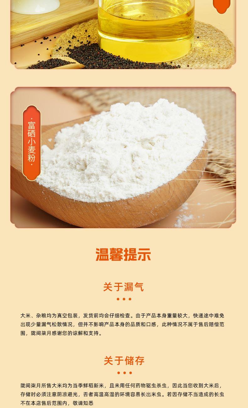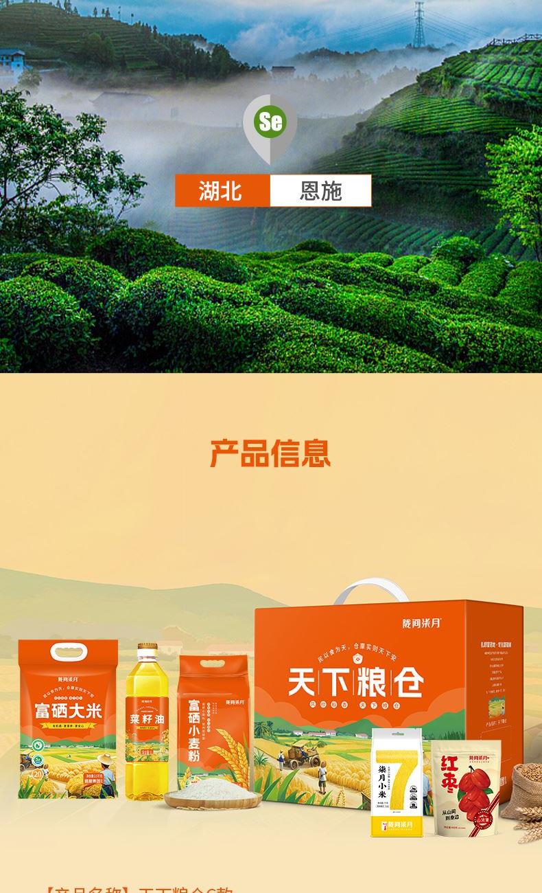 产品信息 品 名:天下粮仓C 规 格:富硒大米2.5kg、菜籽油1L,富硒小麦粉1kg 小米1kg,红枣400g 包 装:长38cm宽17.5cm高30cm 产品特色 1、富有机硒认证,每100g平均硒含量≥20ug。 2、菜籽油油品透亮、香味浓郁,含有丰富的维生素E以及油酸、亚油酸、亚麻酸等; 3、富硒小麦粉,面粉自然白净,粉质细腻,筋度适中,延展性高,适合家庭面食制作:做饺子、面条、馒头、包子、烙饼、面包等; 4、小米色泽金黄,软糯清香,米油浓厚,双层真空锁鲜包装 5、精美礼盒,送礼佳品。