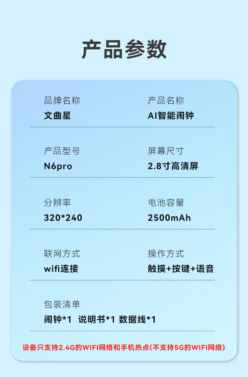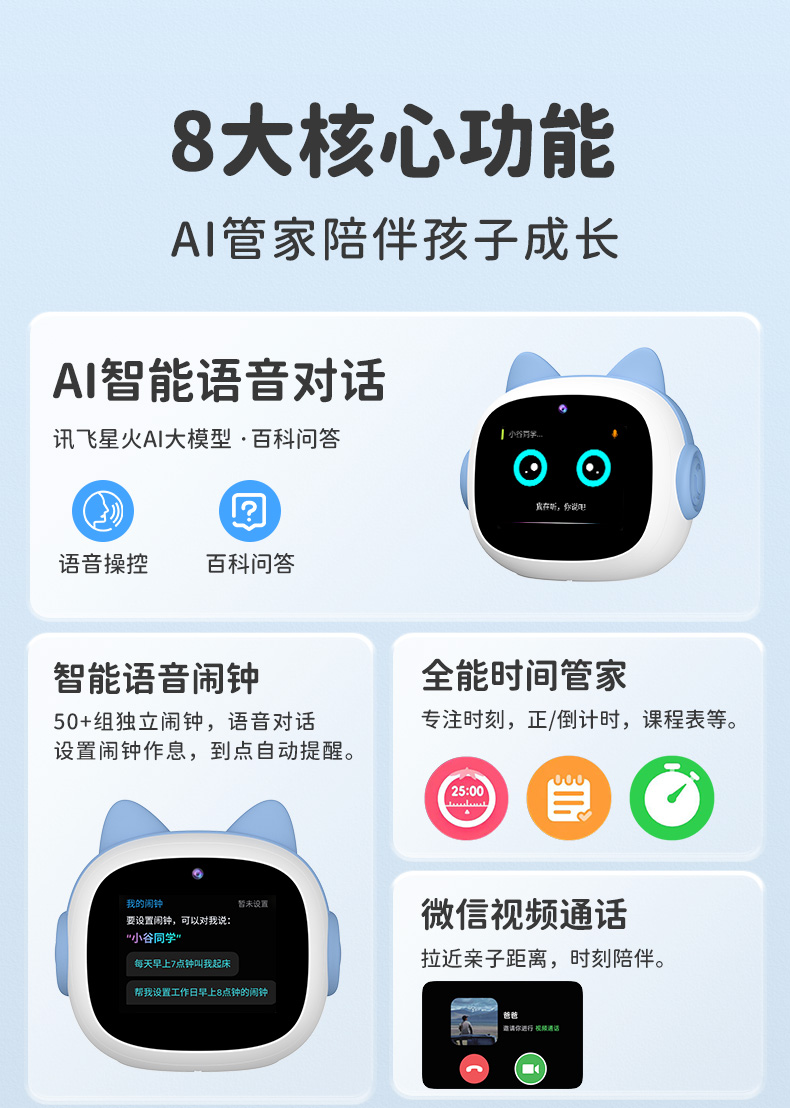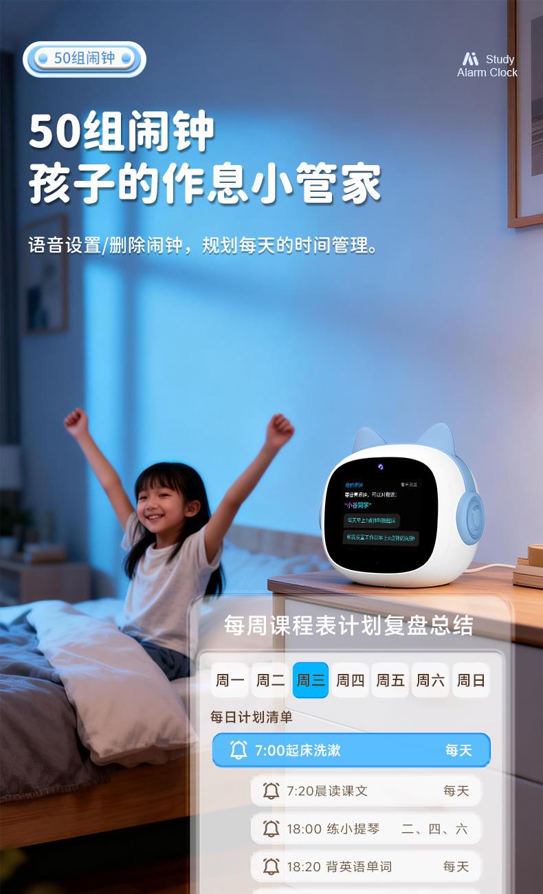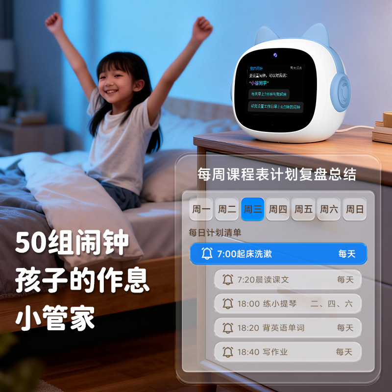 1、文曲星AI智能闹钟(时间管理器)N6pro,搭载讯飞星火大模型,全语音控制 2、微信视频通话/语聊,深度强化情感连接,拉近父母与孩子距离 3、覆盖1-9年级同步教材听力,陪孩子一起学习成长 4、50组闹钟提示,智能设置闹钟及时间管理,各种时间规划有条不紊 5、多轮连续语音对话,不间断对答,满足孩子的十万个为什么,人机对话体验更有温度 6、更智能更全面的时间管理助手,培养孩子自律性,让孩子更有时间观念 7、多模块英语学习,背单词,同步教材,口语对练,精通20多国语言在线翻译 8、小学1-6年级英语课文同步1对1口语对练,提升孩子口语能力 9、背单词模块,三步轻松攻克,单词、生字、词组听写 10、丰富汉语课堂,学拼音,识汉字,古诗词等,开启孩子早期启蒙教育 11、番茄计时法,科学管理时间,提升学习效率 12、课外知识拓展,故事大全,名著,欢乐儿歌,国学经典等精彩内容