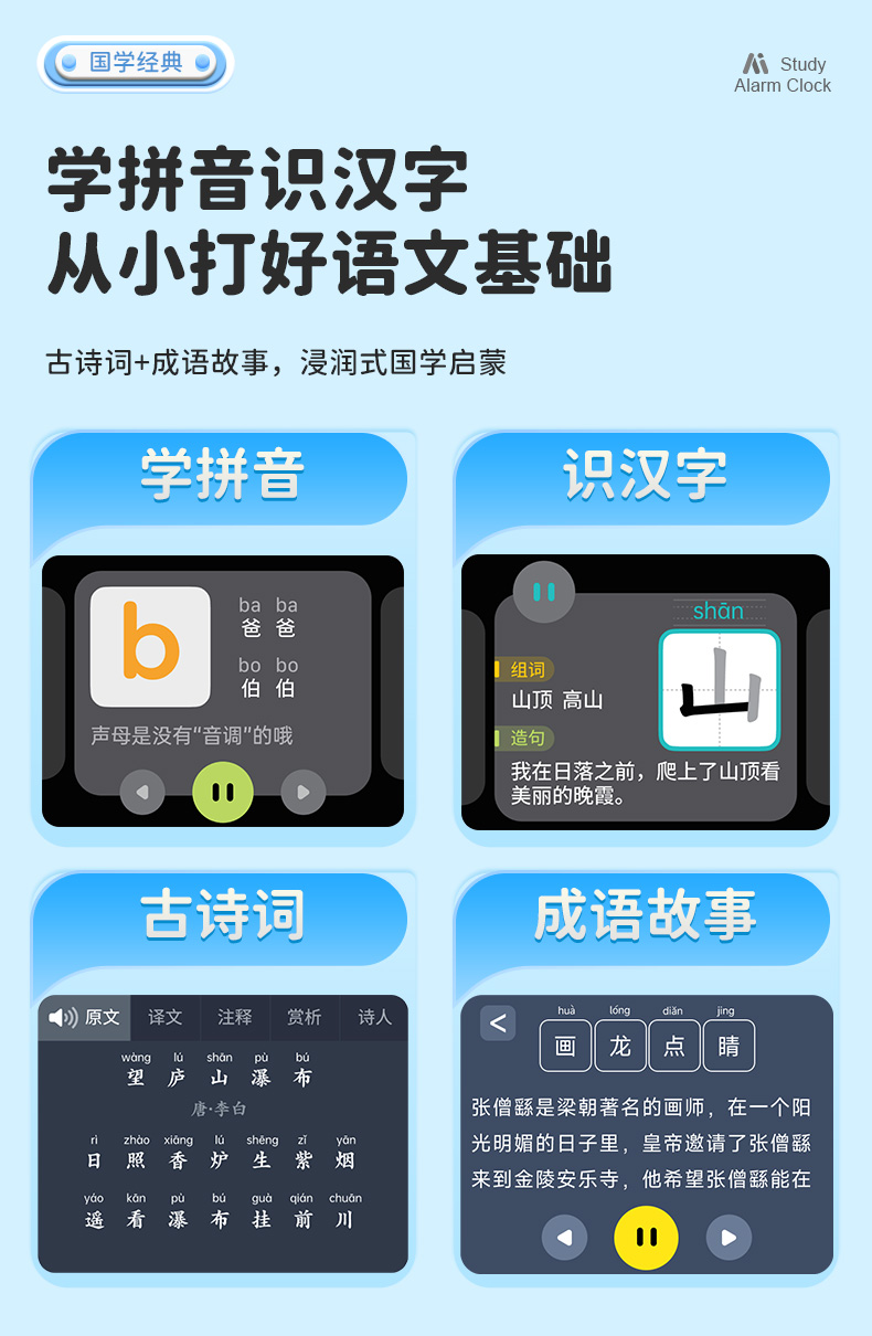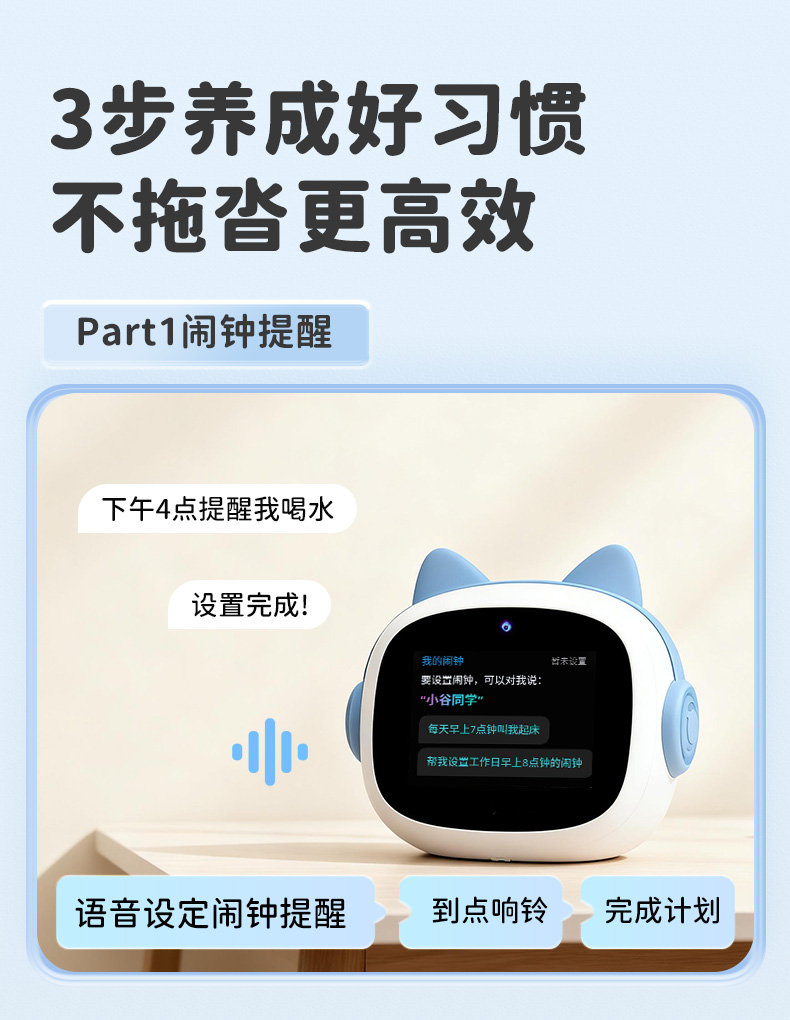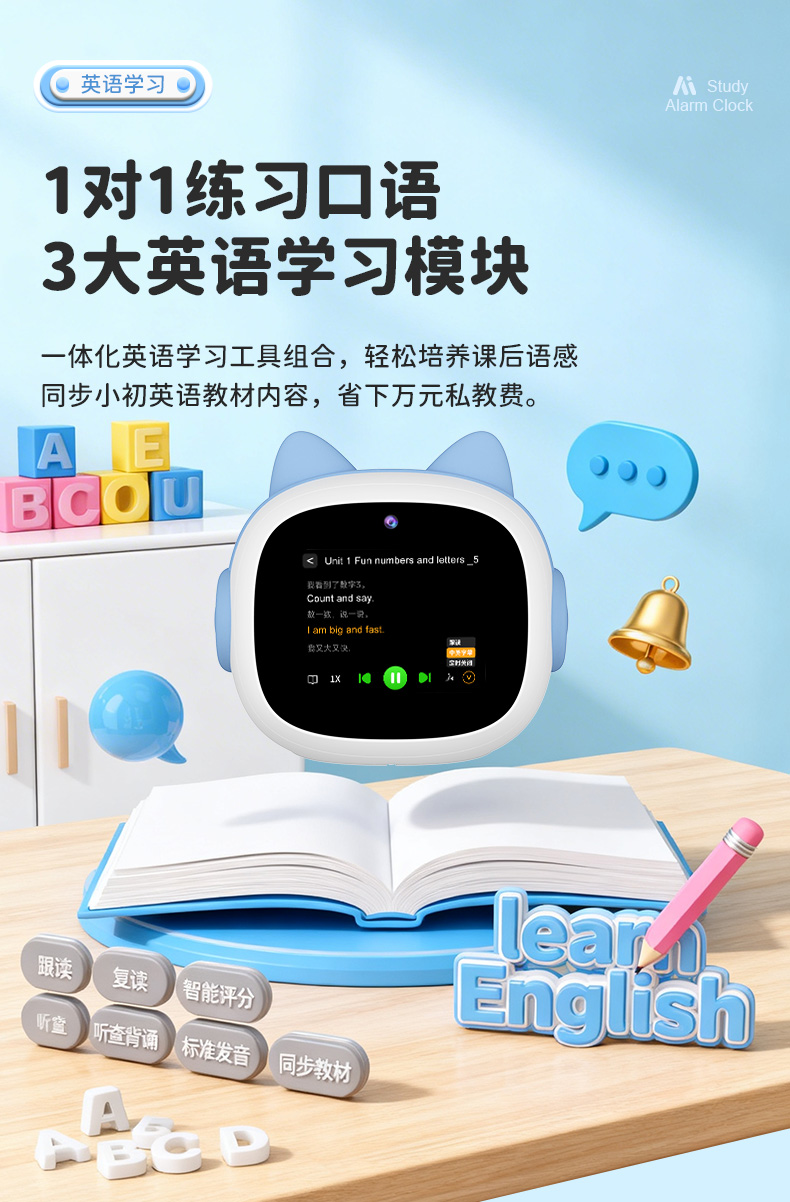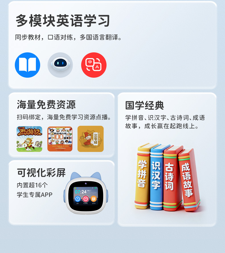 1、文曲星AI智能闹钟(时间管理器)N6pro,搭载讯飞星火大模型,全语音控制 2、微信视频通话/语聊,深度强化情感连接,拉近父母与孩子距离 3、覆盖1-9年级同步教材听力,陪孩子一起学习成长 4、50组闹钟提示,智能设置闹钟及时间管理,各种时间规划有条不紊 5、多轮连续语音对话,不间断对答,满足孩子的十万个为什么,人机对话体验更有温度 6、更智能更全面的时间管理助手,培养孩子自律性,让孩子更有时间观念 7、多模块英语学习,背单词,同步教材,口语对练,精通20多国语言在线翻译 8、小学1-6年级英语课文同步1对1口语对练,提升孩子口语能力 9、背单词模块,三步轻松攻克,单词、生字、词组听写 10、丰富汉语课堂,学拼音,识汉字,古诗词等,开启孩子早期启蒙教育 11、番茄计时法,科学管理时间,提升学习效率 12、课外知识拓展,故事大全,名著,欢乐儿歌,国学经典等精彩内容