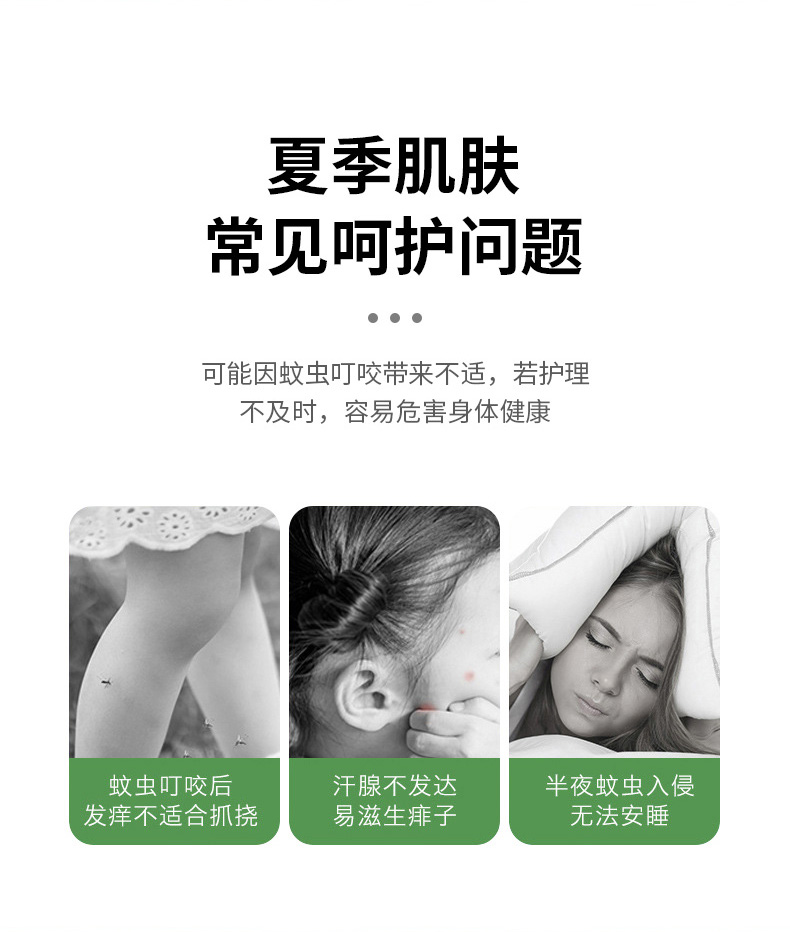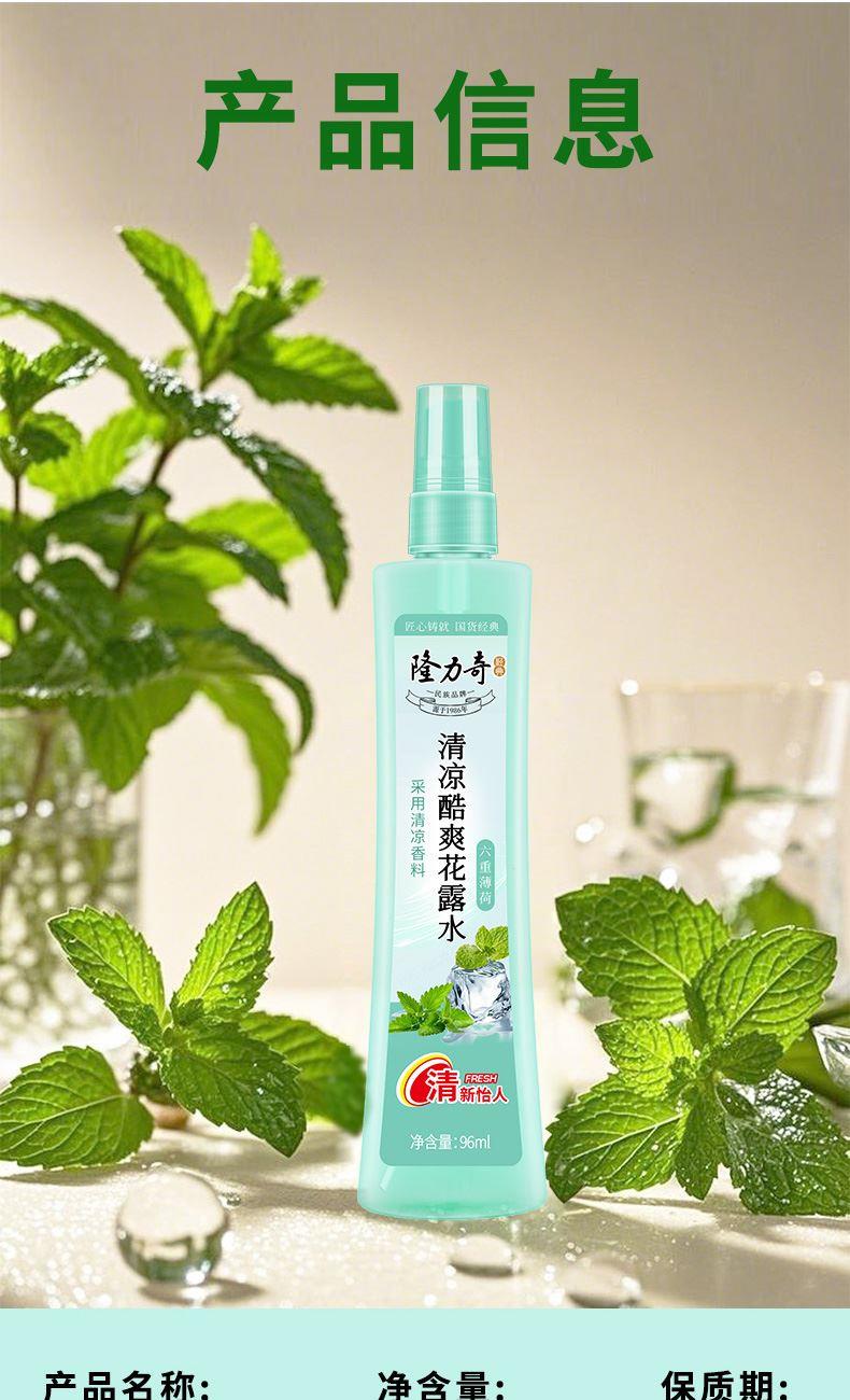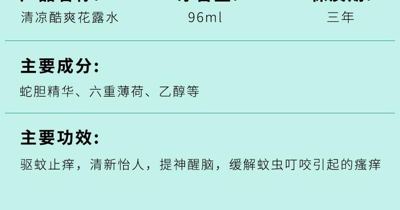 货号:LLQ-202502010 净含量:96ml 保 质 期:3年 功效:驱蚊止痒 提神醒脑 持久凝香 喷头设计,简单易用 外箱尺寸:218*211*196mm 整箱重量:3.4kg 产品卖点: 1.高效驱蚊:安全驱蚊数小时,适用成人与儿童; 2.清凉舒爽:天然薄荷与蛇胆成分,祛痱止痒,提神醒肤; 3.多效用途:可涂抹、喷洒或滴入洗澡水,夏季清凉消暑