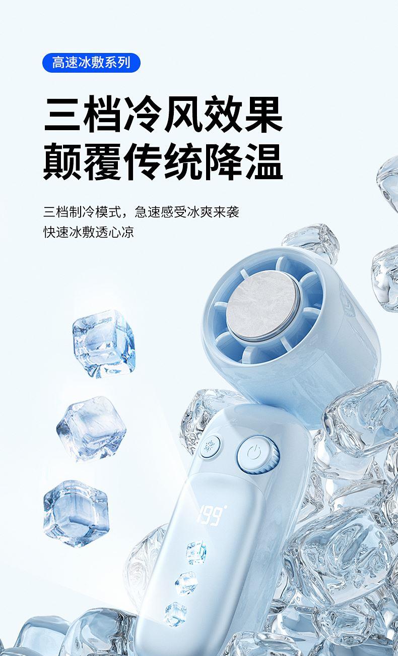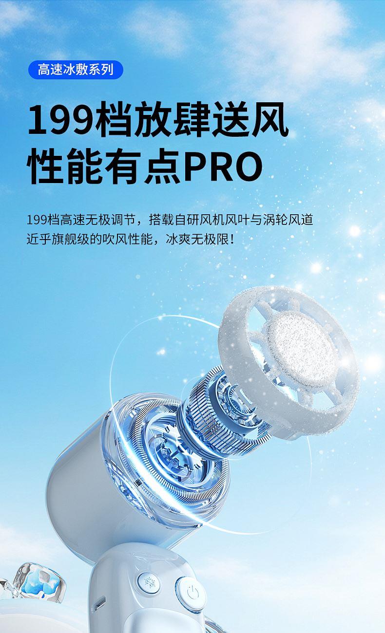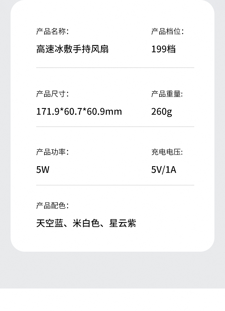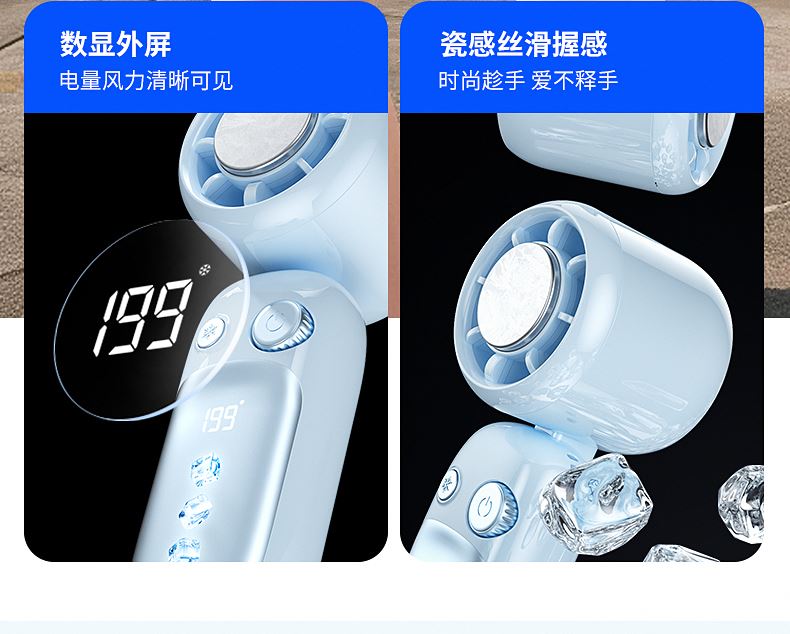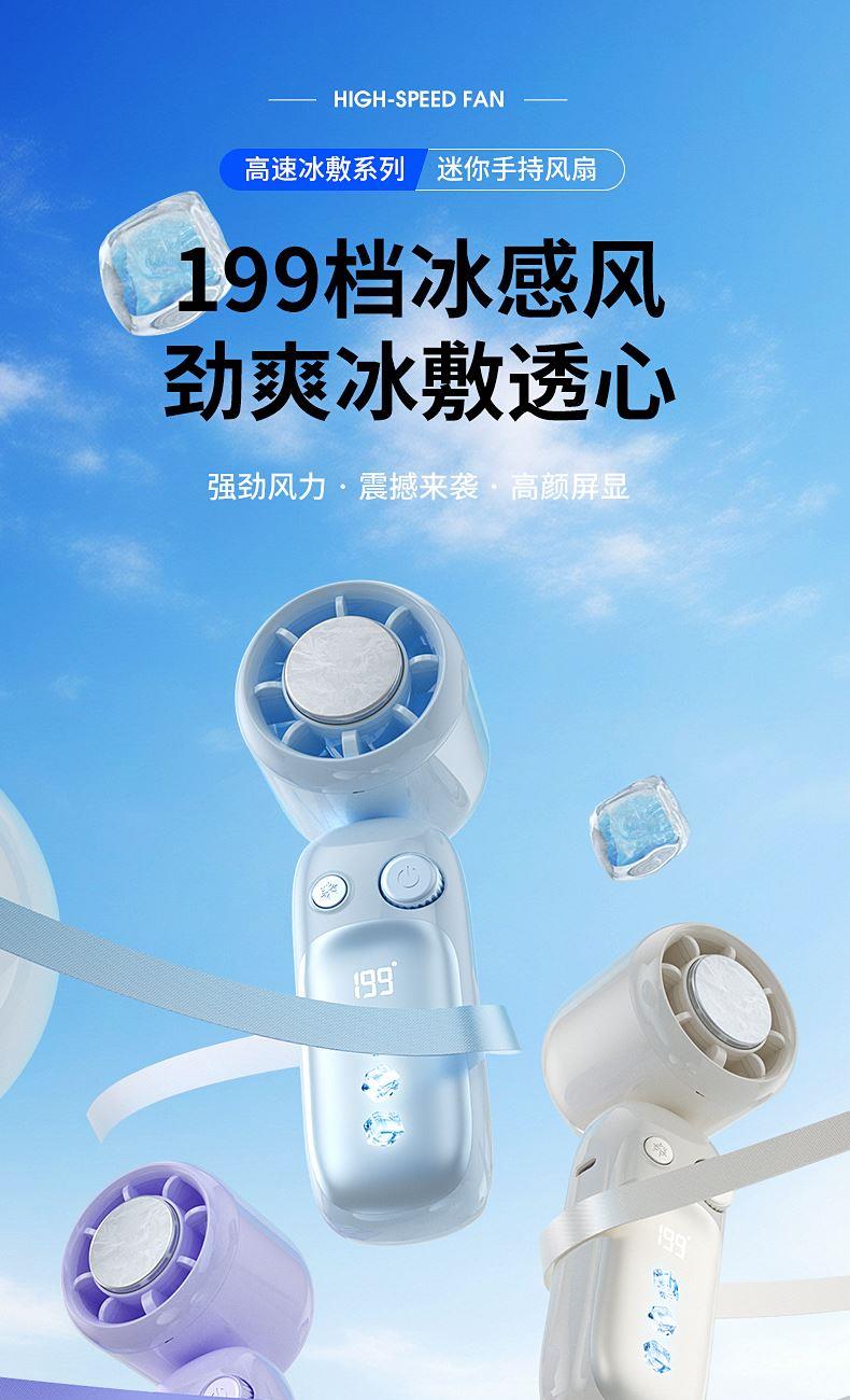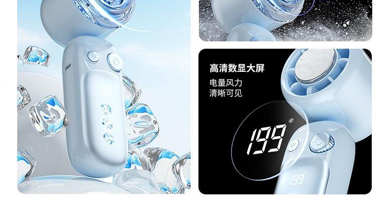 产品材质:ABS 产品功能:199档风力调节 产品容量:3000mAh 产品尺寸:60.7*60.9*171.9mm 产品颜色:米白色,蓝色,紫色 多巴胺撞色系列,让夏天活力满满;菲林亮面高光,搭配电镀工艺;199档风力调节,超大风力,为你的夏天带来丝丝清凉;半导体制冷,3档冷风选择,智能冰感屏,科技感十足,带来不一样的体验。