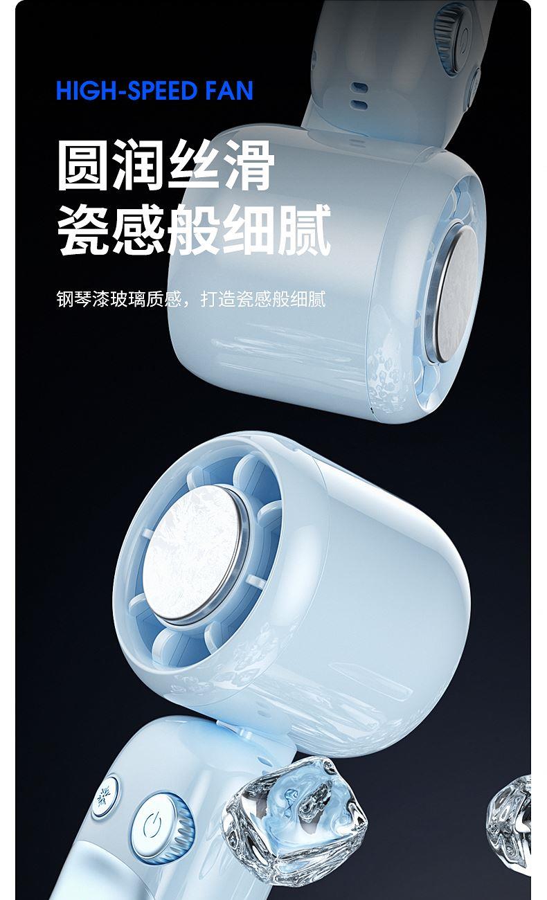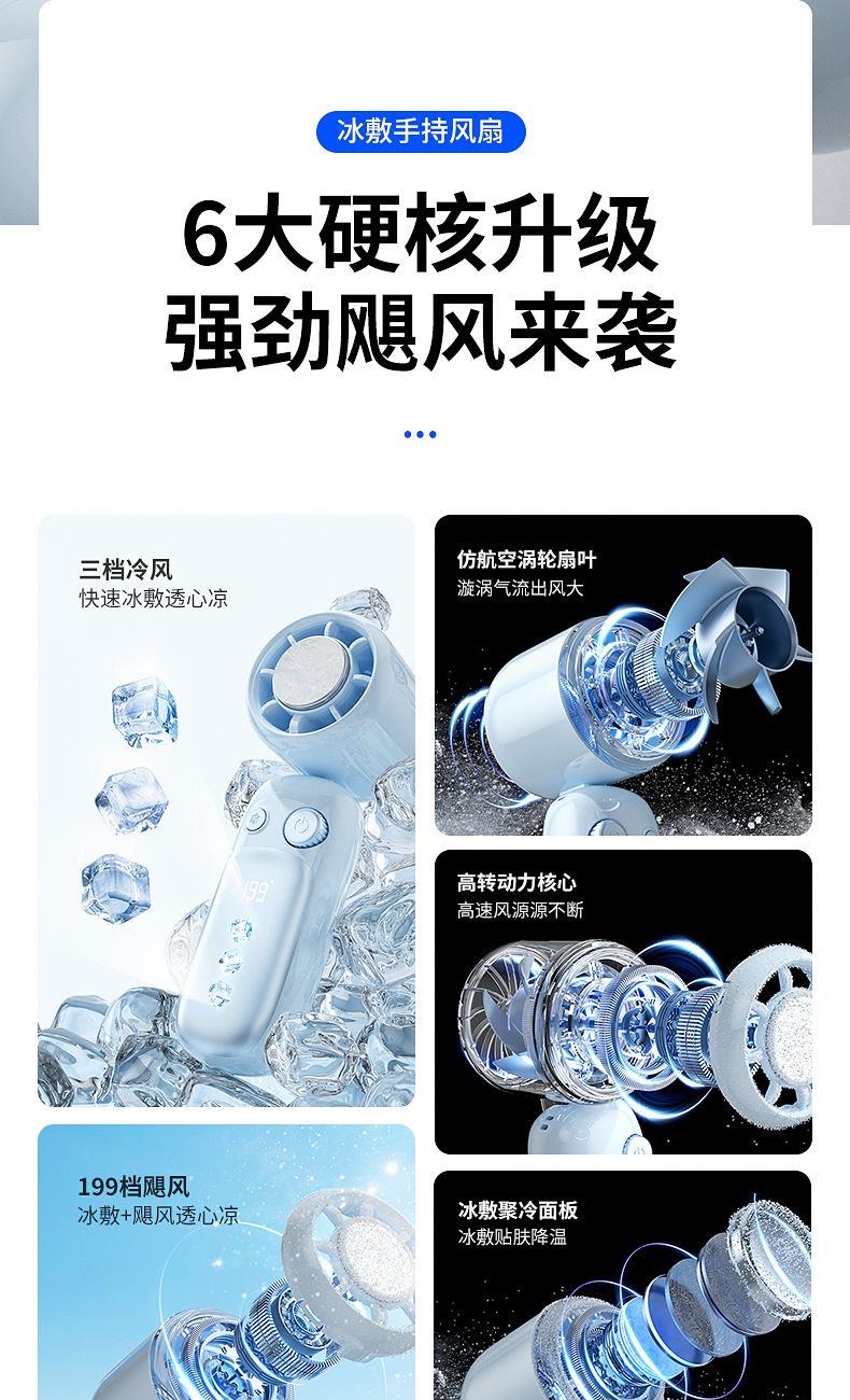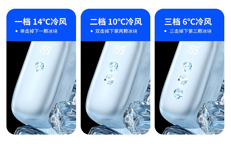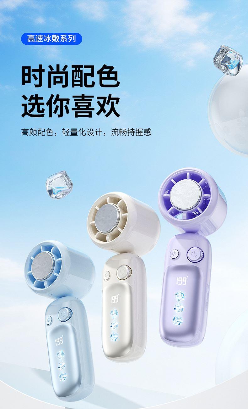 产品材质:ABS 产品功能:199档风力调节 产品容量:3000mAh 产品尺寸:60.7*60.9*171.9mm 产品颜色:米白色,蓝色,紫色 多巴胺撞色系列,让夏天活力满满;菲林亮面高光,搭配电镀工艺;199档风力调节,超大风力,为你的夏天带来丝丝清凉;半导体制冷,3档冷风选择,智能冰感屏,科技感十足,带来不一样的体验。