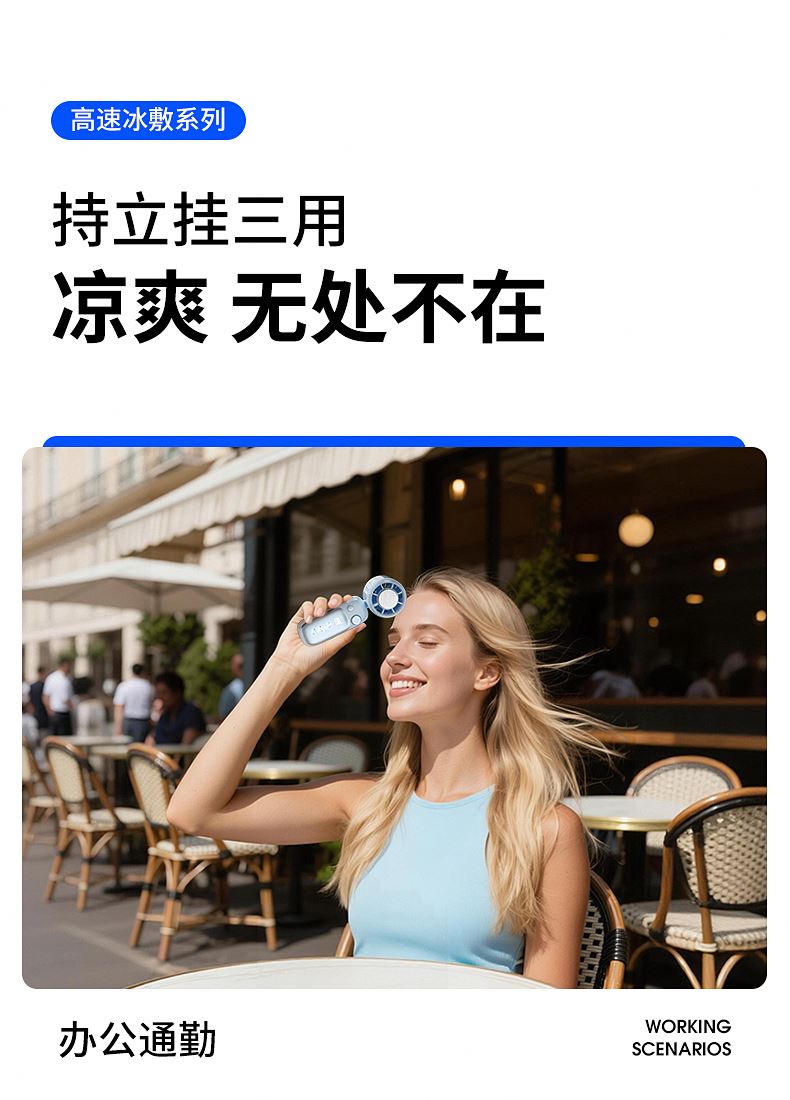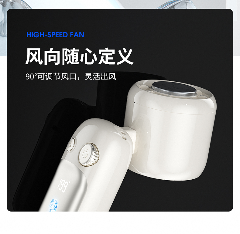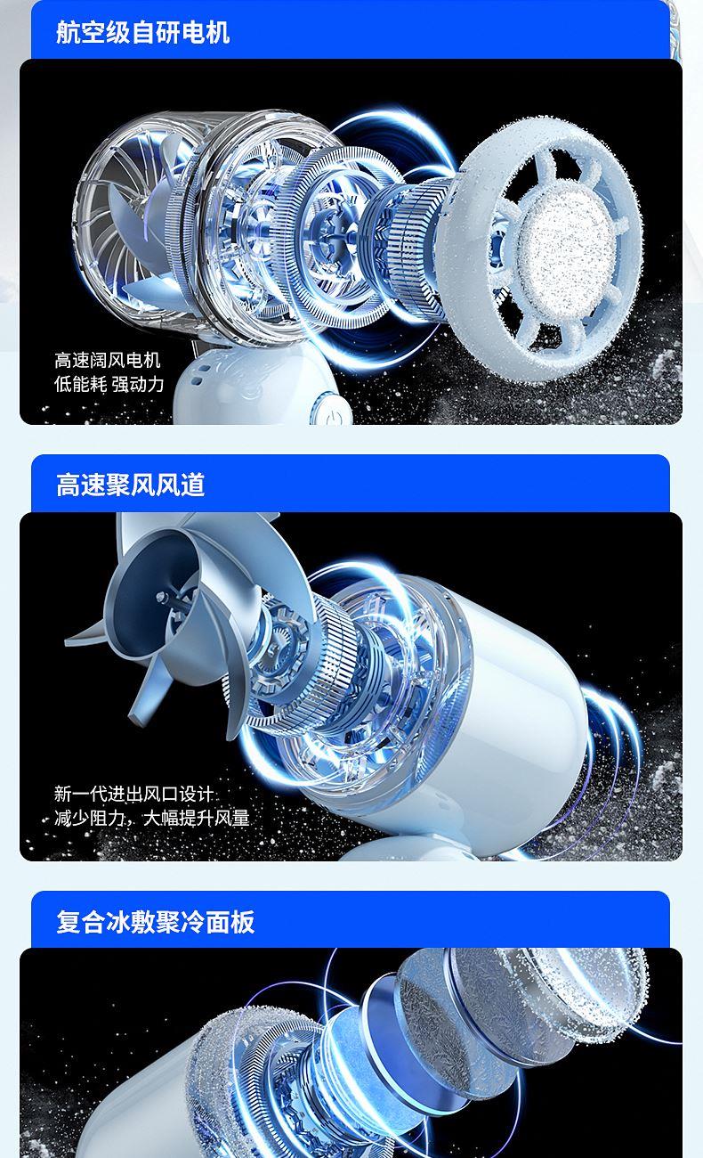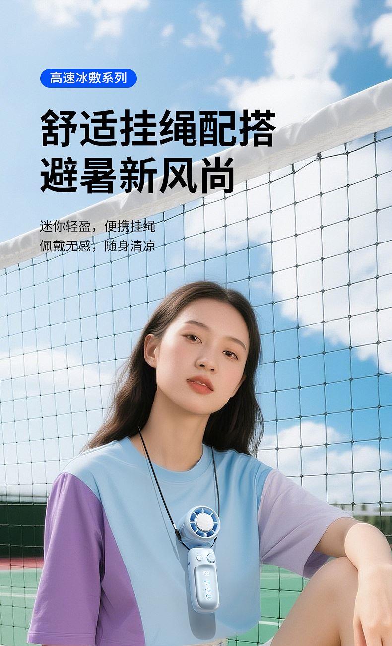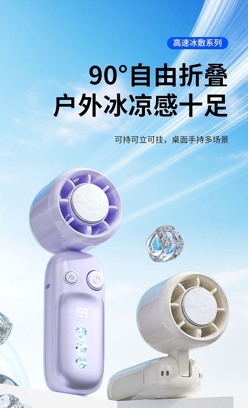 产品材质:ABS 产品功能:199档风力调节 产品容量:3000mAh 产品尺寸:60.7*60.9*171.9mm 产品颜色:米白色,蓝色,紫色 多巴胺撞色系列,让夏天活力满满;菲林亮面高光,搭配电镀工艺;199档风力调节,超大风力,为你的夏天带来丝丝清凉;半导体制冷,3档冷风选择,智能冰感屏,科技感十足,带来不一样的体验。