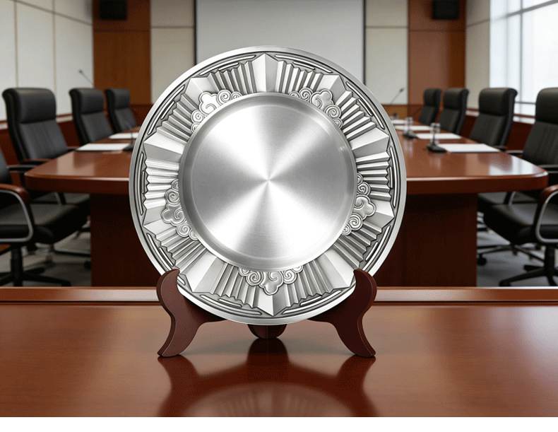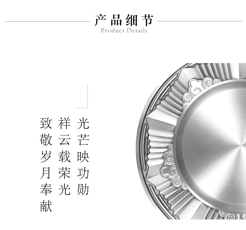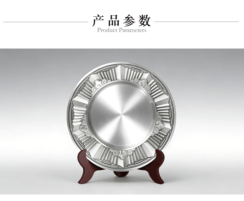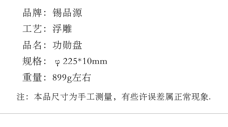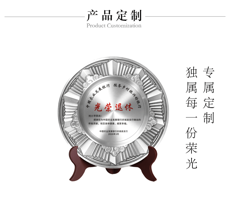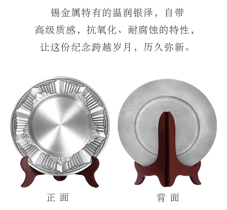 产 品:功勋盘 规 格: φ225*10mm 重 量:899g左右 专属定制,让每一份荣光无可复制 盘心预留超大空白区域,支持个性化定制; 🎯 多元场景,礼赠与收藏的不二之选 ✅ 企业荣誉:功勋员工、年度表彰、合伙人纪念,彰显企业格局 ✅ 军旅纪念:退伍荣归、立功授奖、战友留念,定格热血荣光 ✅ 礼赠场景:长辈寿辰、恩师谢礼、行业致敬,传递满满敬意 ✅ 收藏臻品:锡器本身兼具收藏价值,定制内容更具传世意义 📦 细节拉满,质感看得见 搭配实木三角展示架,免装裱、免安装,开箱即可摆放,办公室、书房、博古架都能彰显格调 高纯度锡材密度高、分量足,上手厚重有质感,拿在手里就是满满的诚意与认可 精致礼盒包装,送礼体面有排面,自用收藏也能妥善封存。