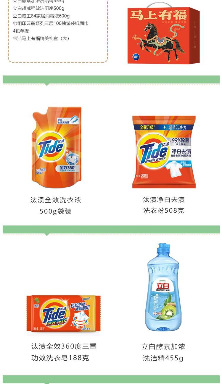 汰渍全效洗衣液500G袋装 汰渍净白去渍洗衣粉508克 汰渍全效360度三重功效洗衣皂188克 立白威王厨房重油污净500g+补充装420g 立白酵素加浓洗洁精455g 立白超威强效洁厕净500g 立白威王84家居消毒液600g 心相印云麓系列三层100抽塑装纸面巾4包单提 宝洁马上有福精美礼盒(大)