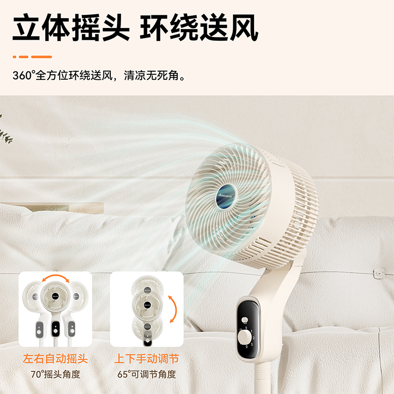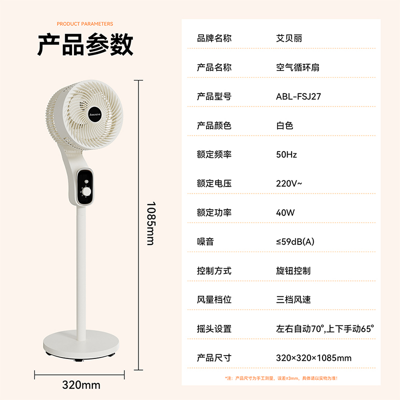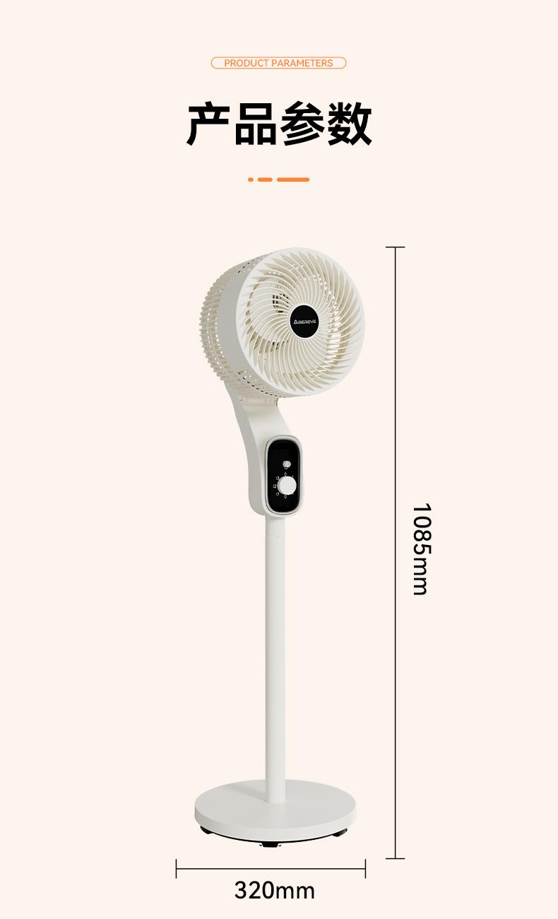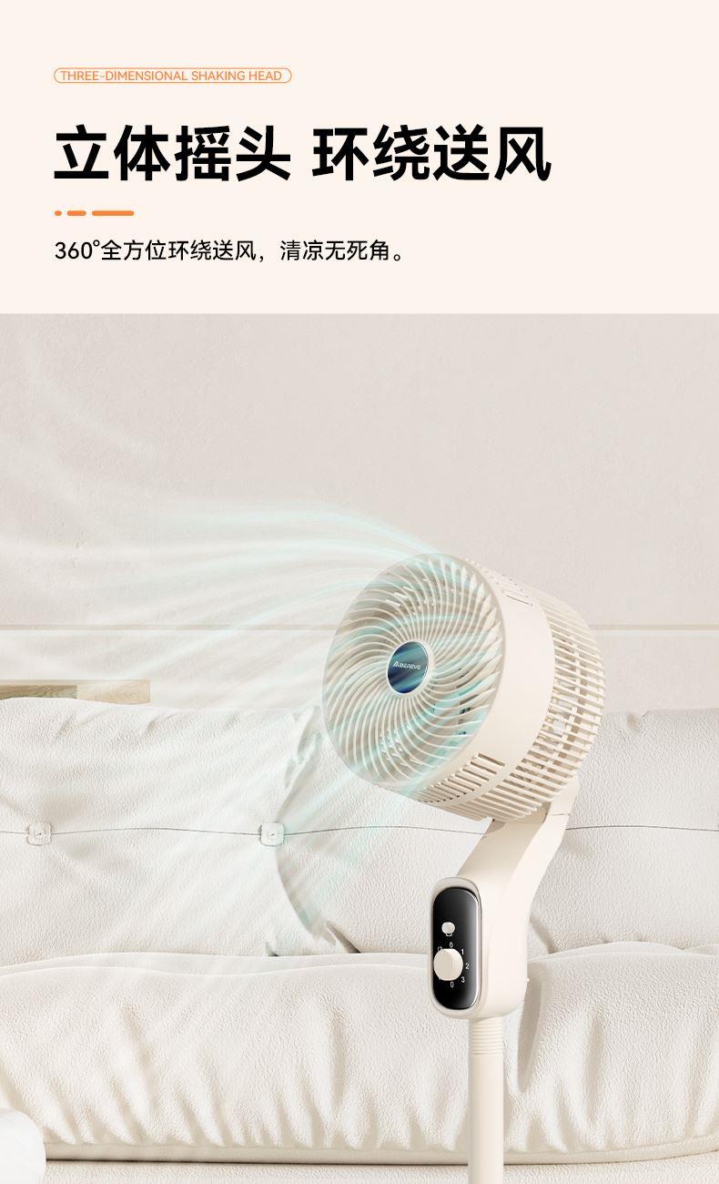 产品颜色:白色 产品材质:PP+ABS 额定电压:220V~ 额定频率:50Hz 额定功率:40W 产品净重:3.9kg 产品毛重:4.5kg 产品尺寸:320*320*1085mm 包装尺寸:525*240*330mm 单台为彩盒包装;4台/ ◁旋钮控制,上下左右自动摇头 ◁360℃摇头送风 多角度多层次送风,全屋空气自然流动 ◁3档风速 满足多样化风感需求 全家都有舒适体感 ◁台立两用,形态随心变,同时拥有台式循环扇和落地循环扇 ◁整屋深循环,强劲搅动室内空气,加速空气流动 ◁配重加固底盘 内置配重块设计 降低机身重心