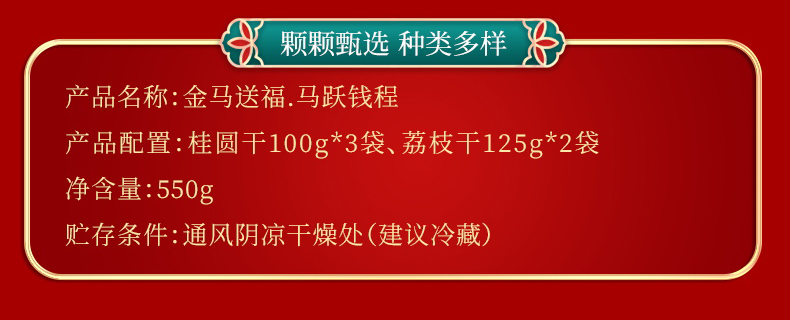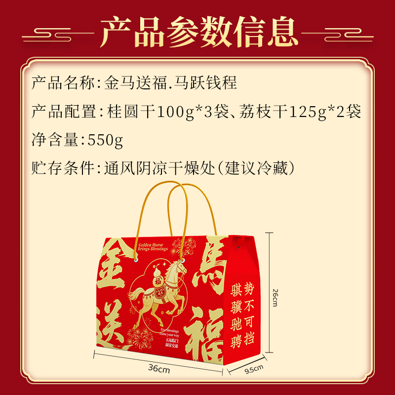 净含量:550g 礼盒:金马送福·马跃钱程 产品规格配置:桂圆干100g*3袋、荔枝干125g*2袋 盒尺寸:36*26*9.5cm 箱尺寸:38*28*60cm 箱重量:5.7kg 箱体积:0.064方