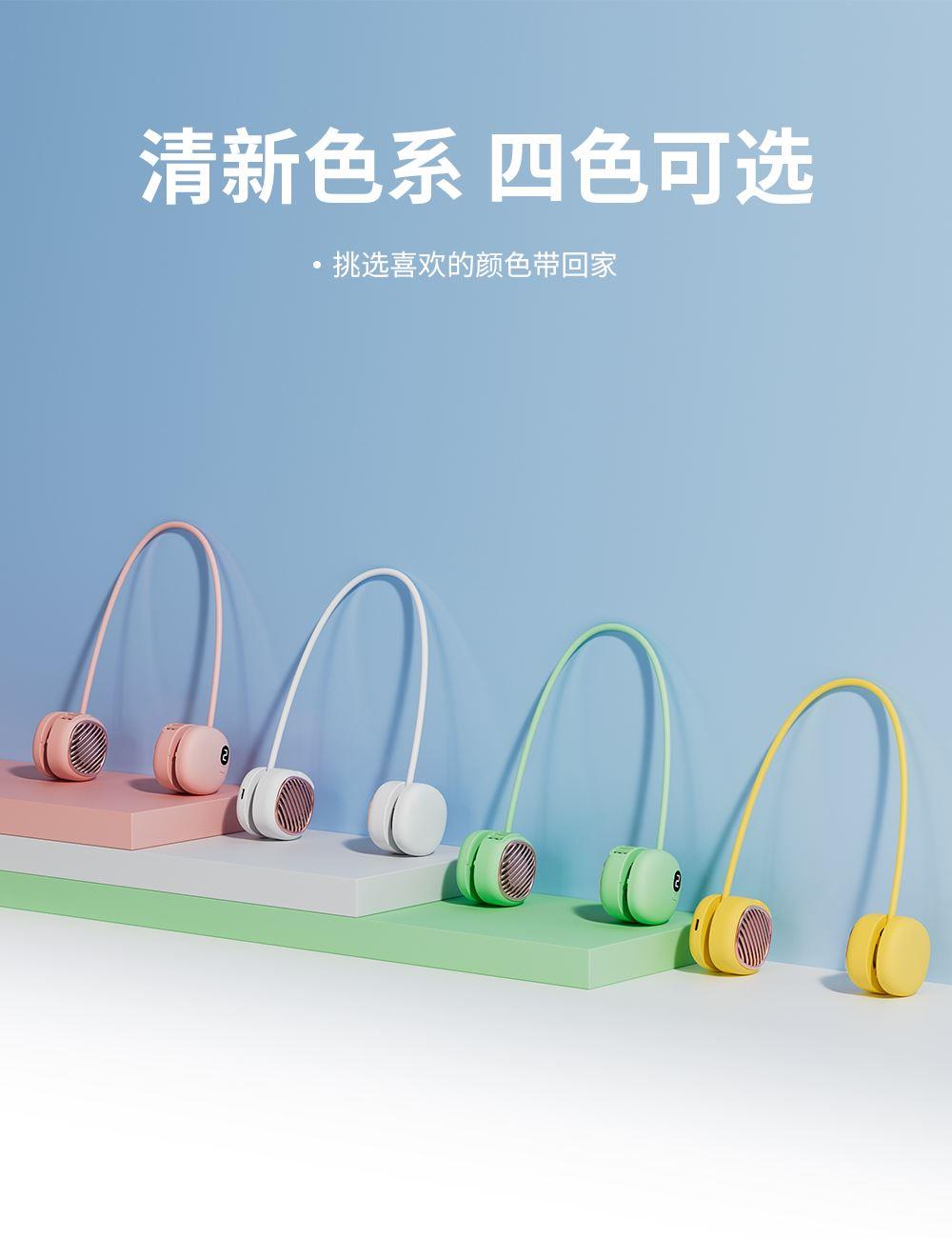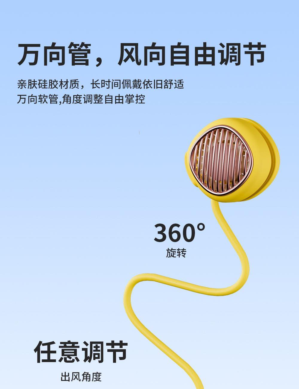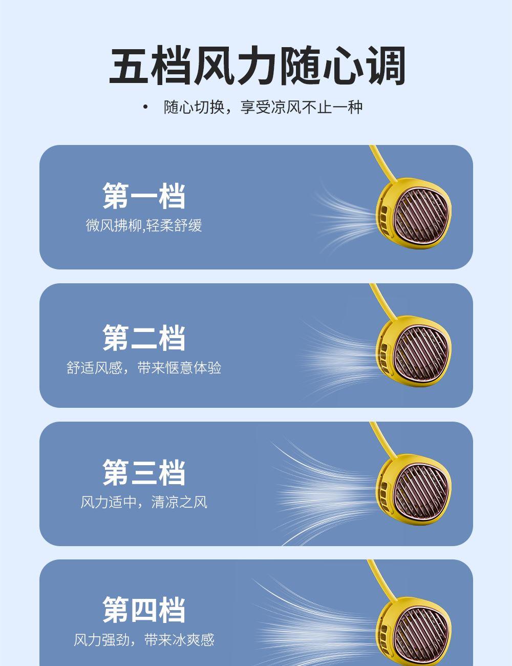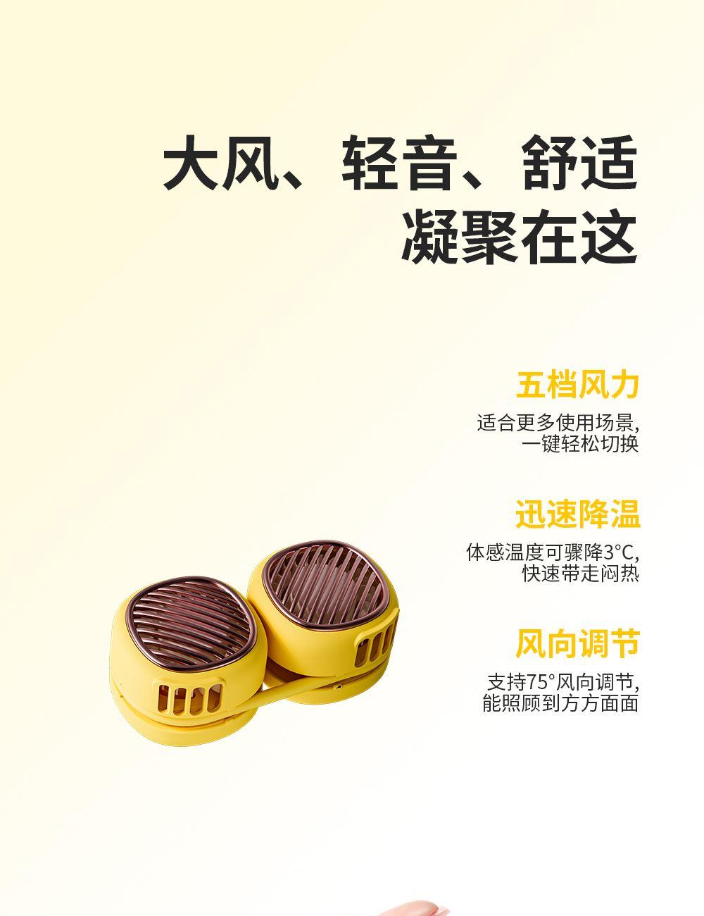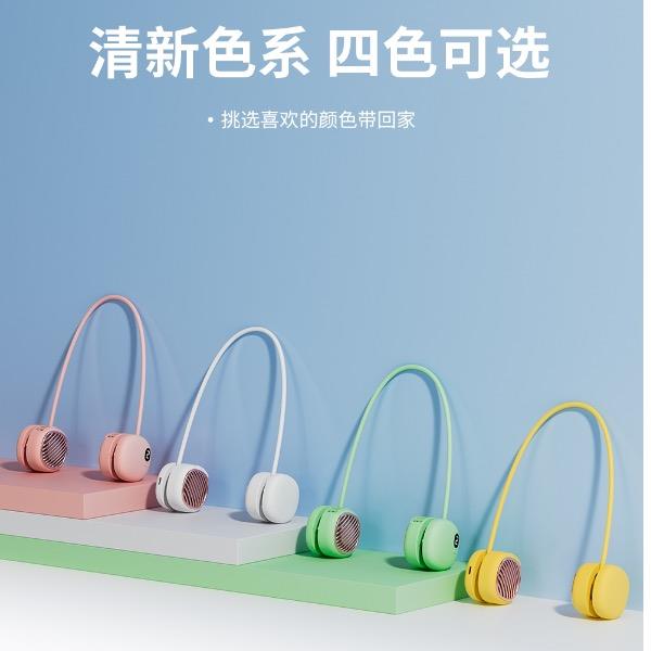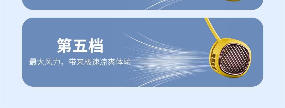 产品材质:ABS 产品功能:5档风力调节 产品容量:1000mAh 产品尺寸:58*58*48.5mm 产品颜色:白色,黄色,绿色,粉色 释放双手,挂脖更轻松;可自由调节,怎么舒服怎么吹,创新绕线收纳,迷你便携,收纳不占空间,五档风力,随心切换。