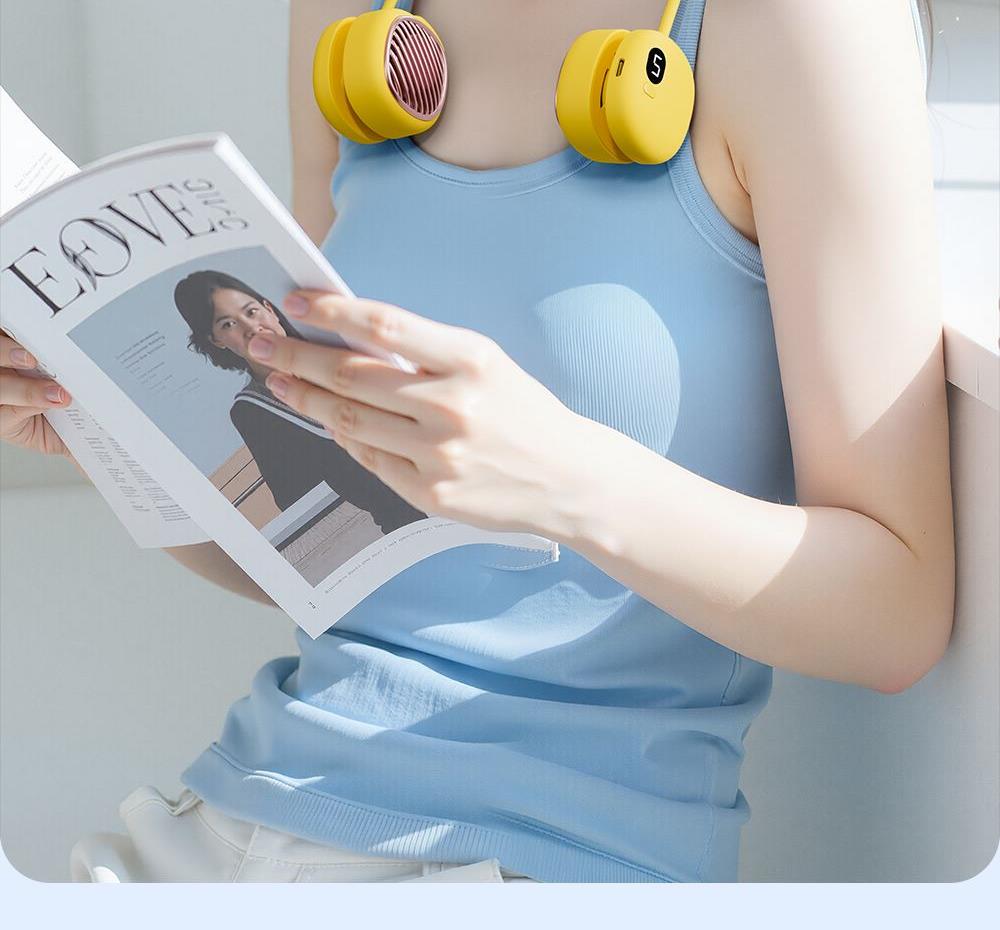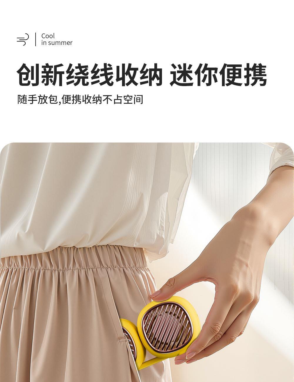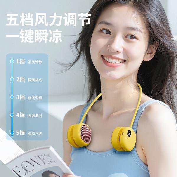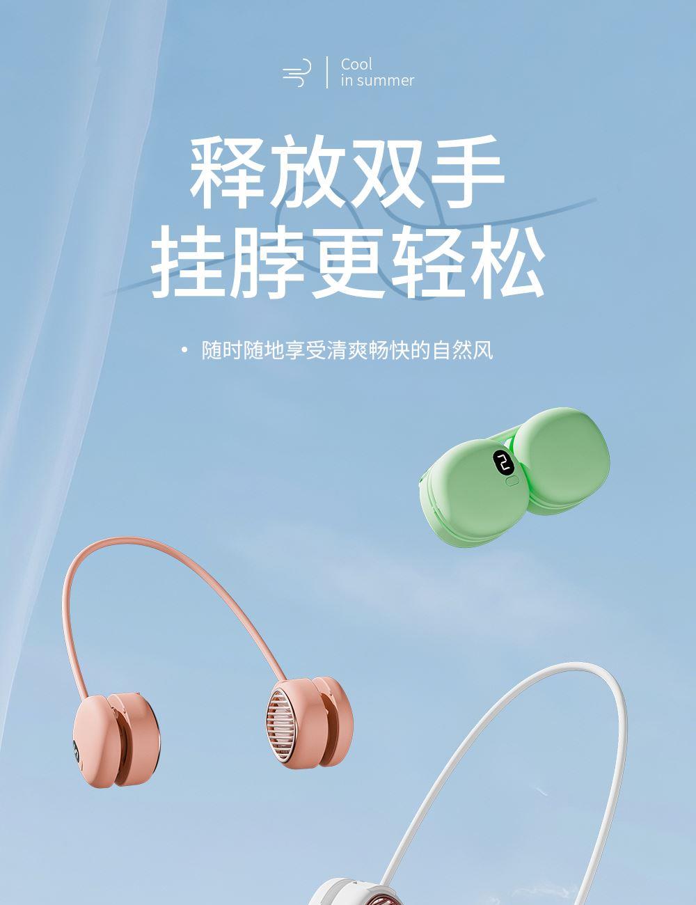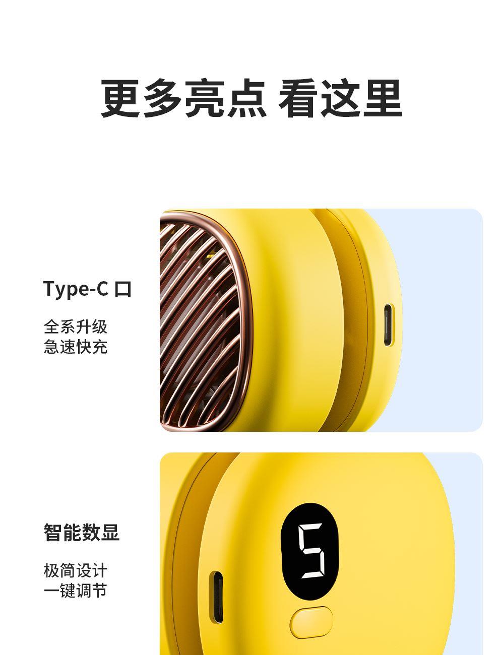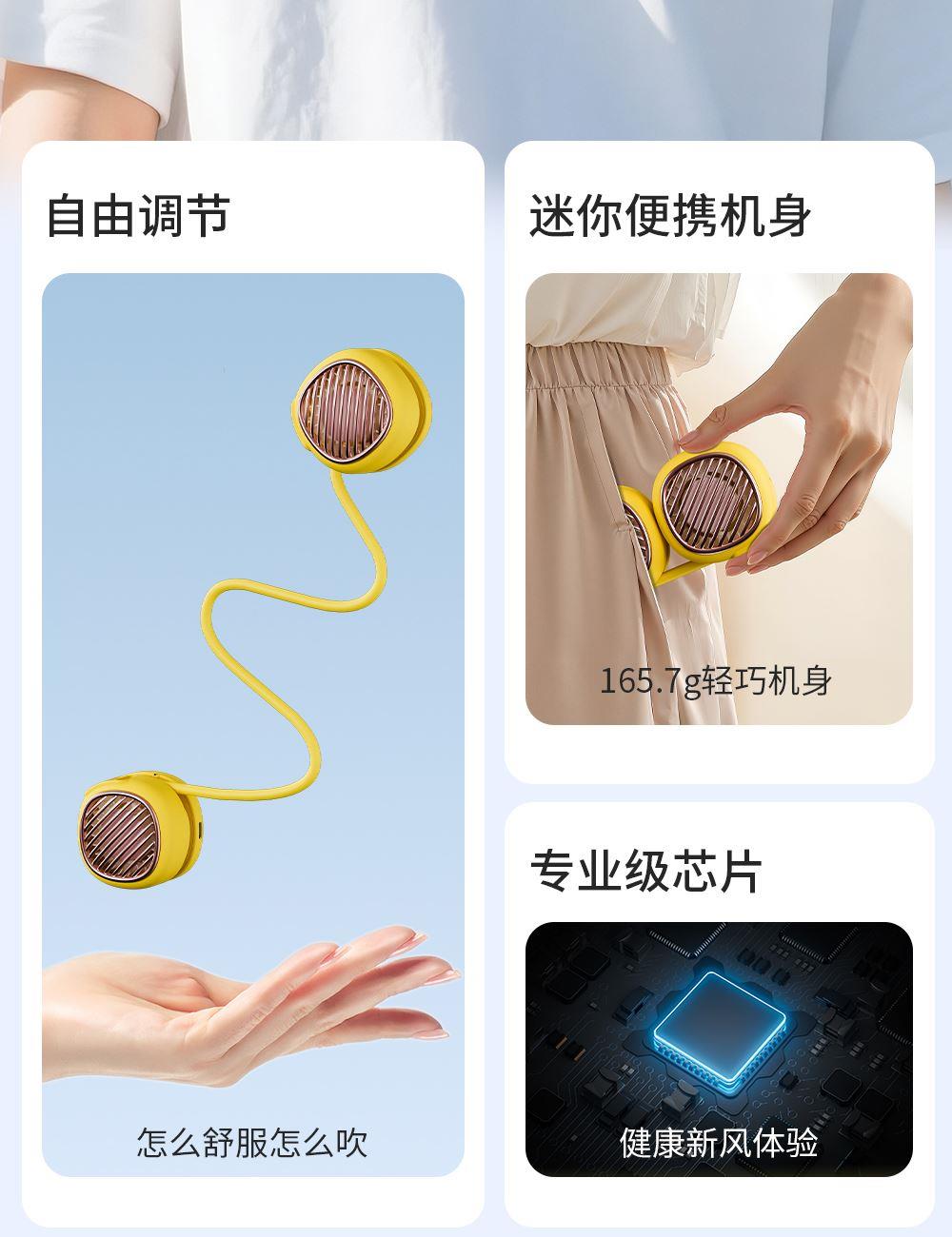 产品材质:ABS 产品功能:5档风力调节 产品容量:1000mAh 产品尺寸:58*58*48.5mm 产品颜色:白色,黄色,绿色,粉色 释放双手,挂脖更轻松;可自由调节,怎么舒服怎么吹,创新绕线收纳,迷你便携,收纳不占空间,五档风力,随心切换。
