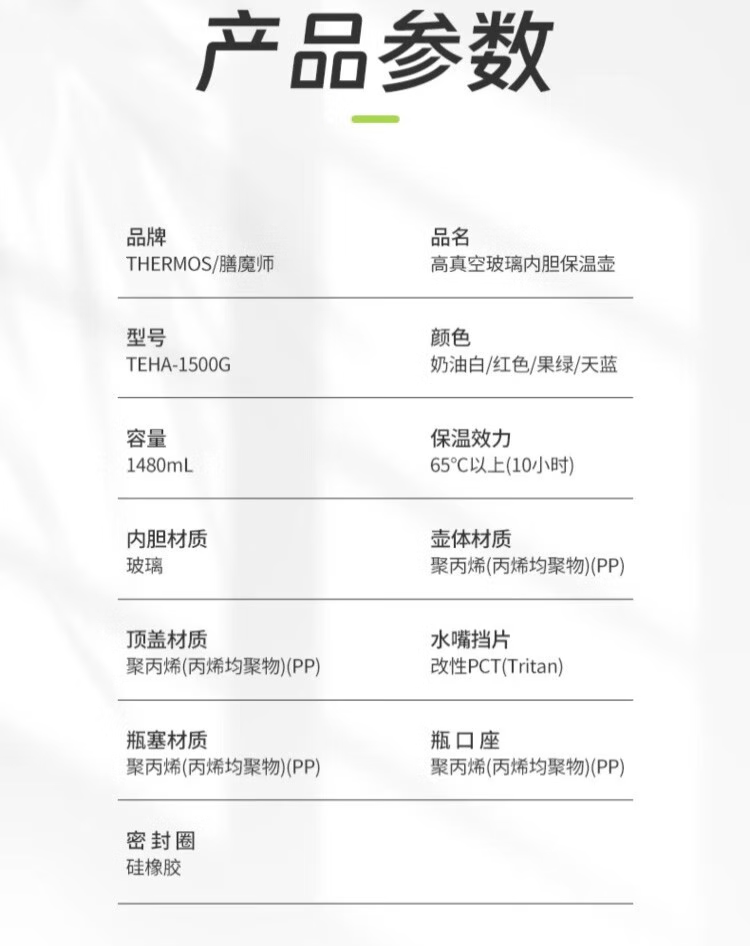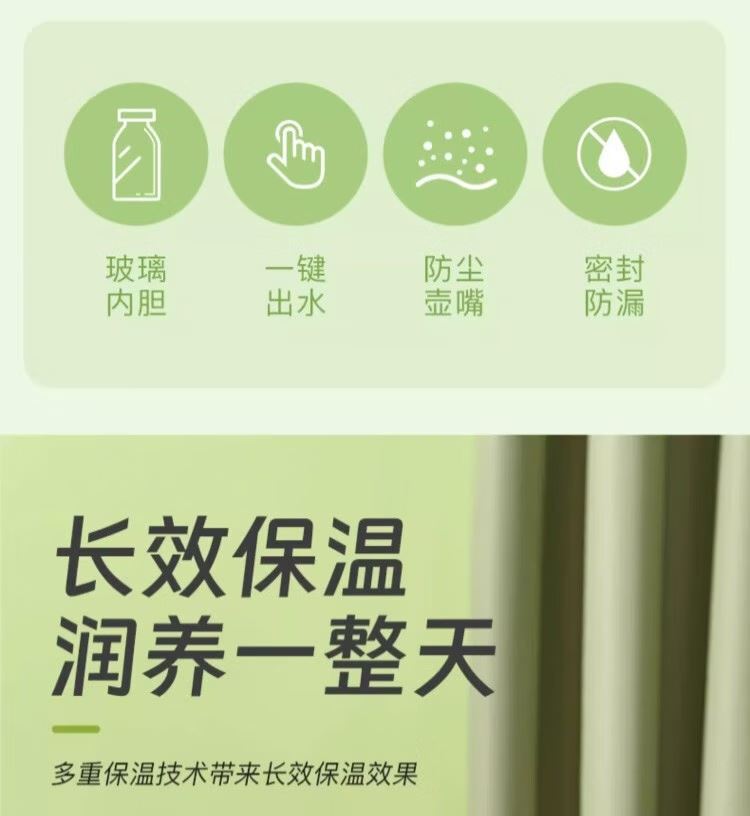 颜 色:奶油白/果绿/蓝色/红色 容 量:1480ml 类 型:家用保温壶 定 制:可以定制 材 质:玻璃内胆 保 温:6小时大约60°C 保 冷:6小时大约12°C
