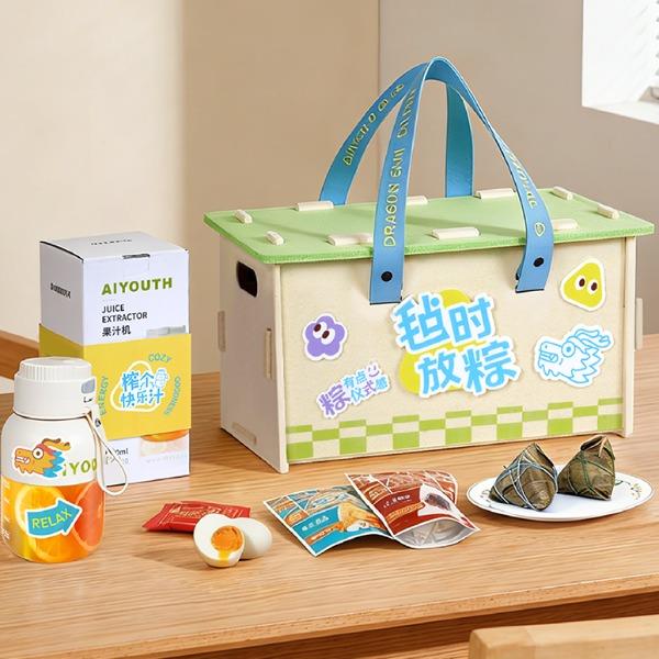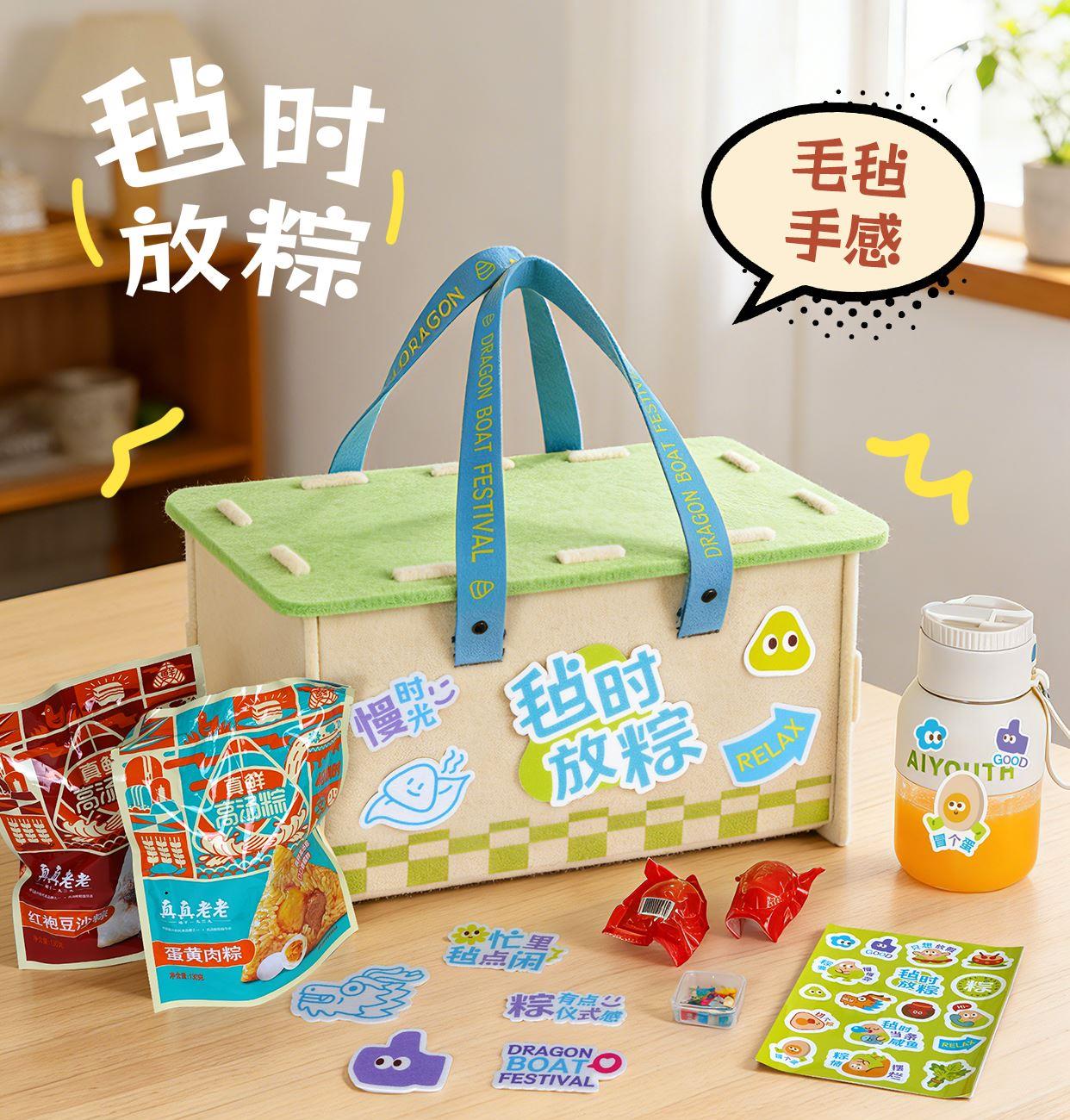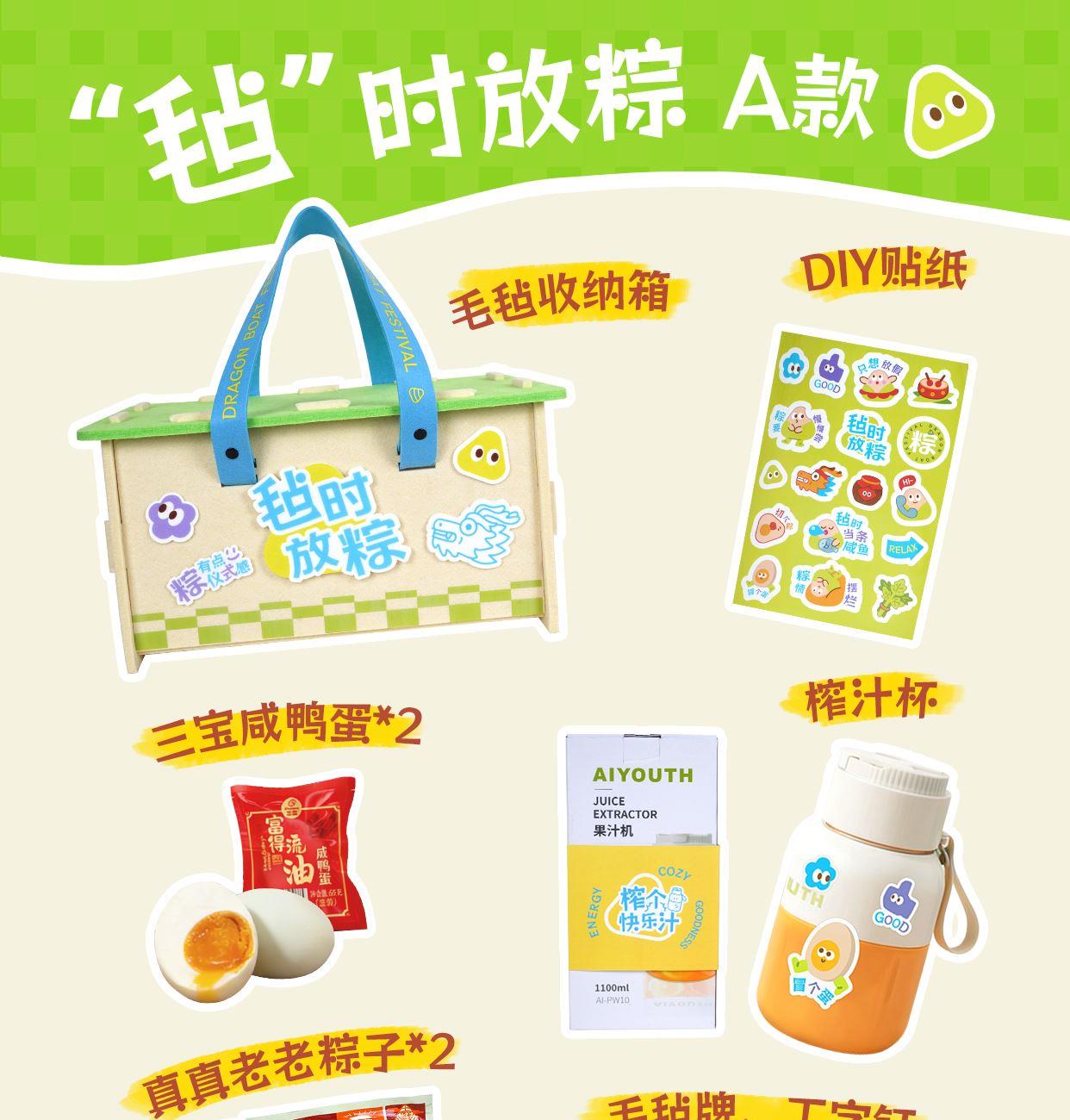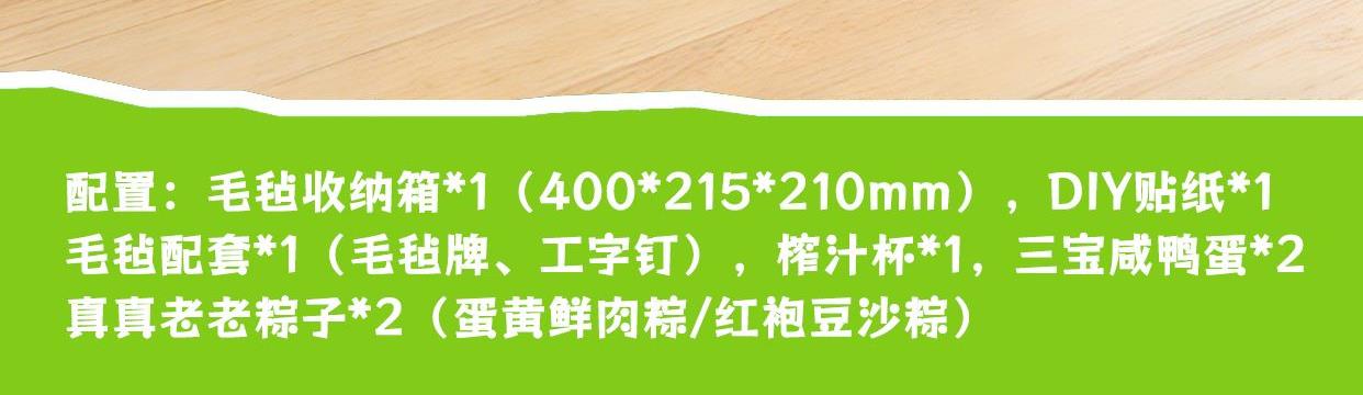 产品配置 毛毡收纳箱*1 , (400*215*210mm) 榨汁杯小家电*1 毛毡配套*1,(毛毡牌、工字钉) DIY贴纸*1 真真老老粽子*2, (蛋黄鲜肉粽/红袍豆沙粽) 三宝咸鸭蛋*2