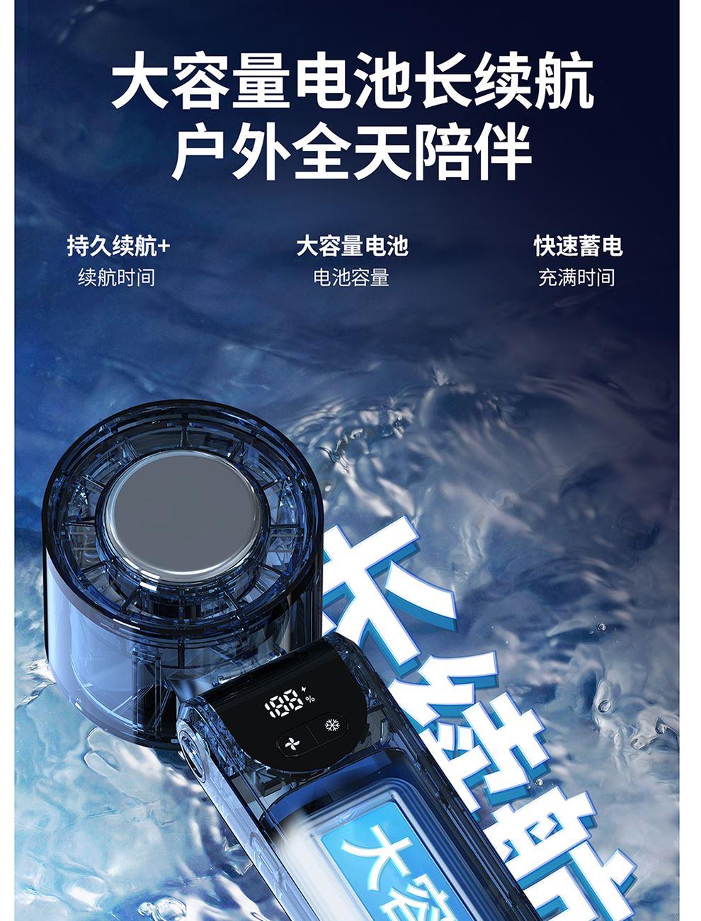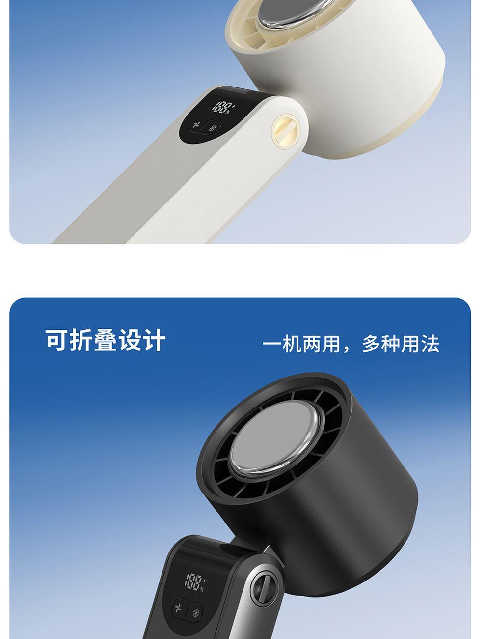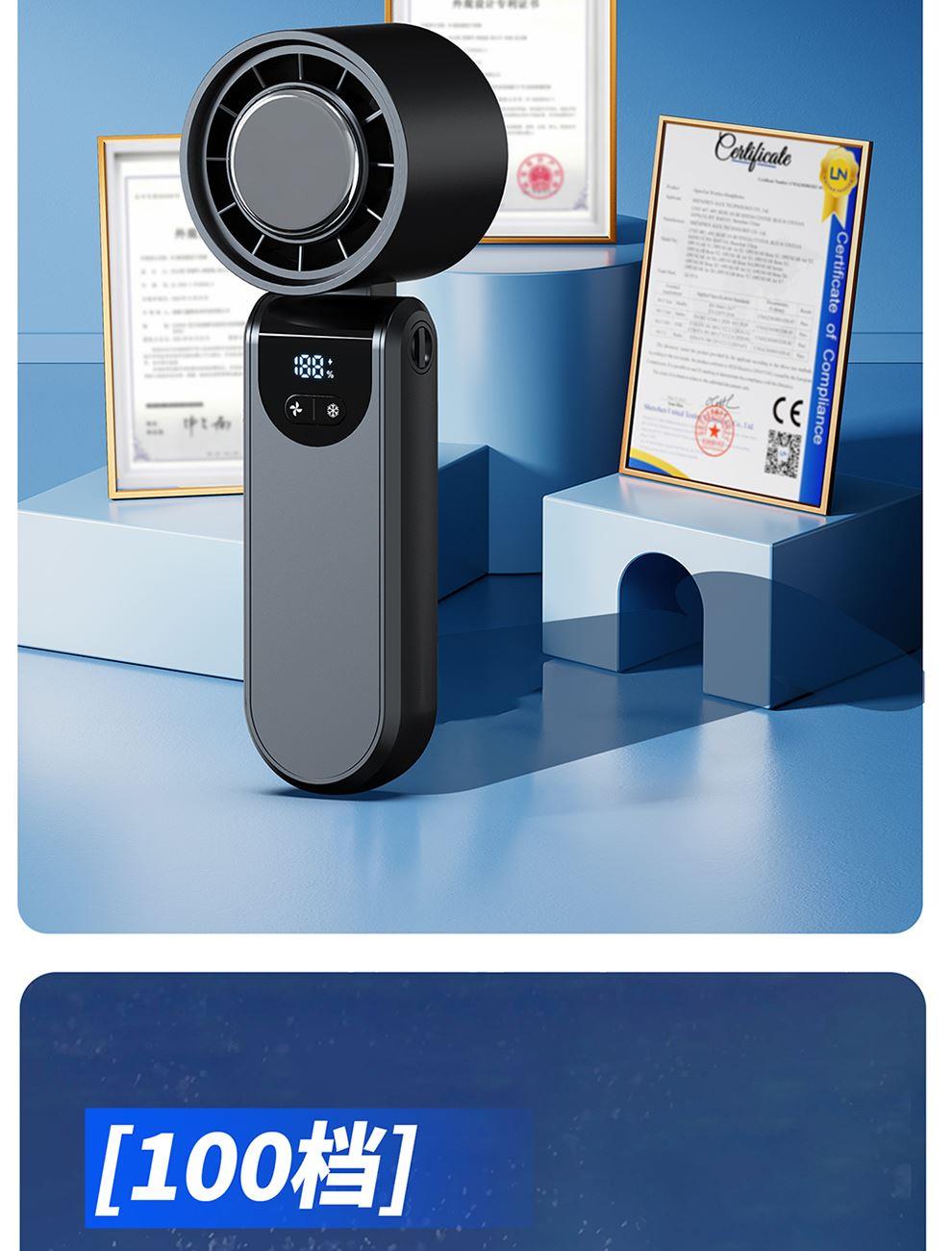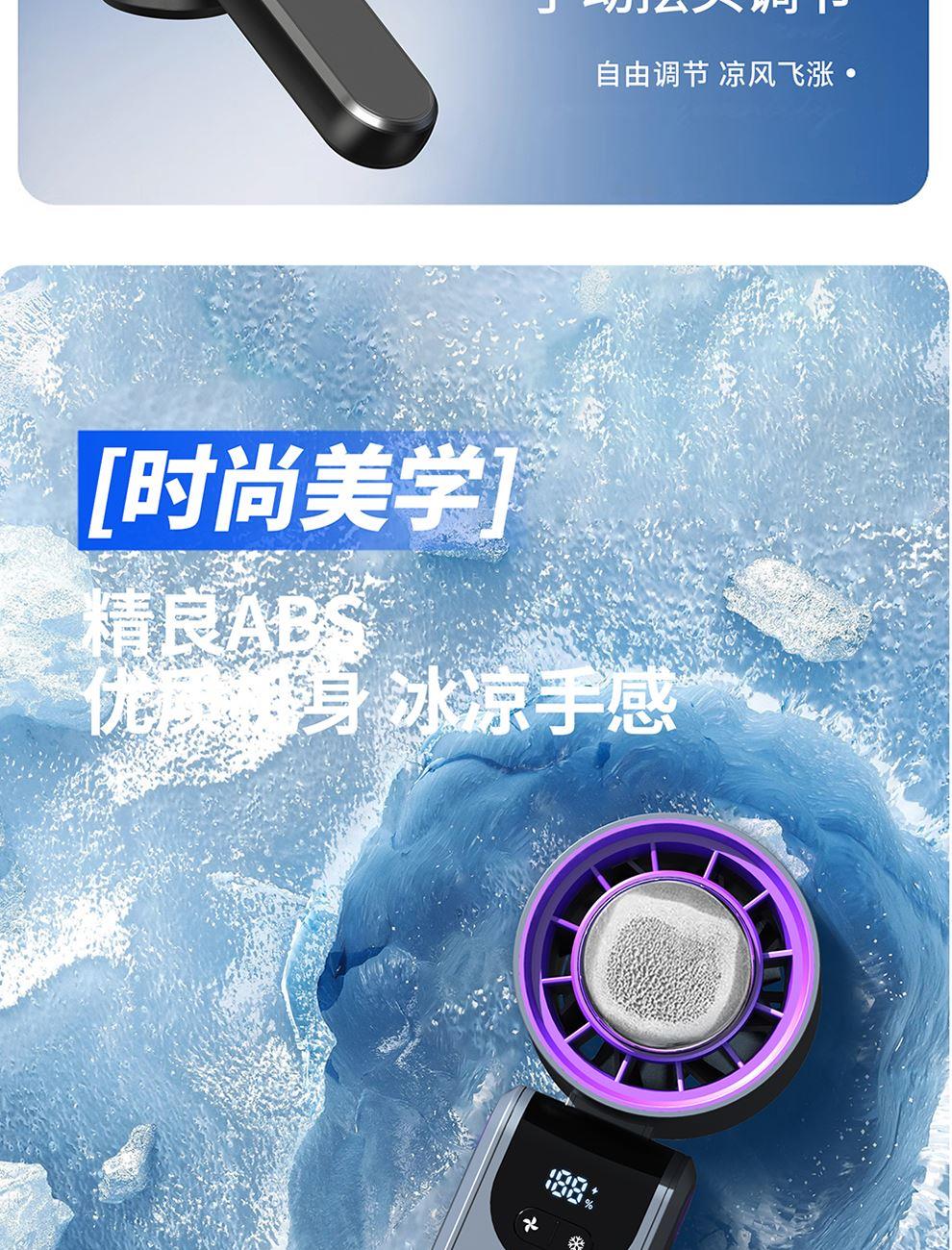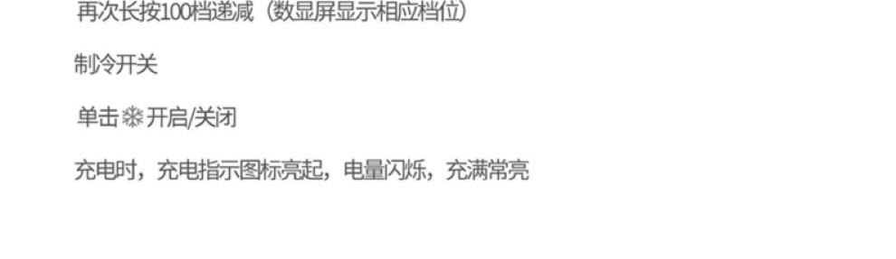 产品尺寸:17.7*6.1*5.4cm 产品材质:ABS+PP+金属+电子元件 输入电流:5V/1A 电池容量:4000mAH 功 率:8w 使用时间:1.5-12小时 产品重量:179g 特点: 冰敷制冷 急速降温 100档风力 无极调节 创新折叠 秒变桌面风扇 LED电量风速数显 一目了然