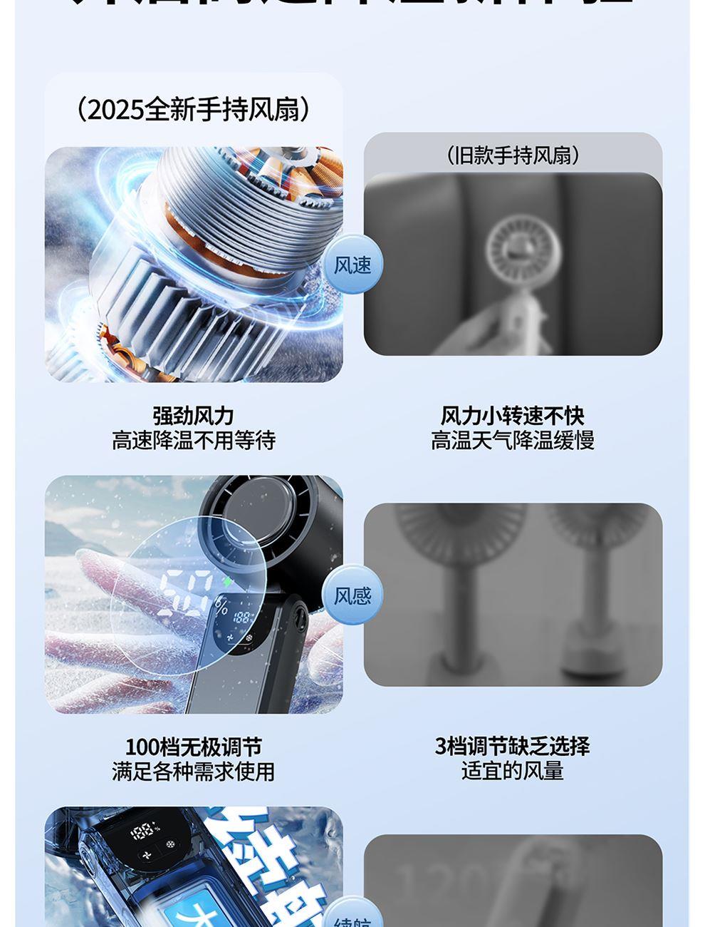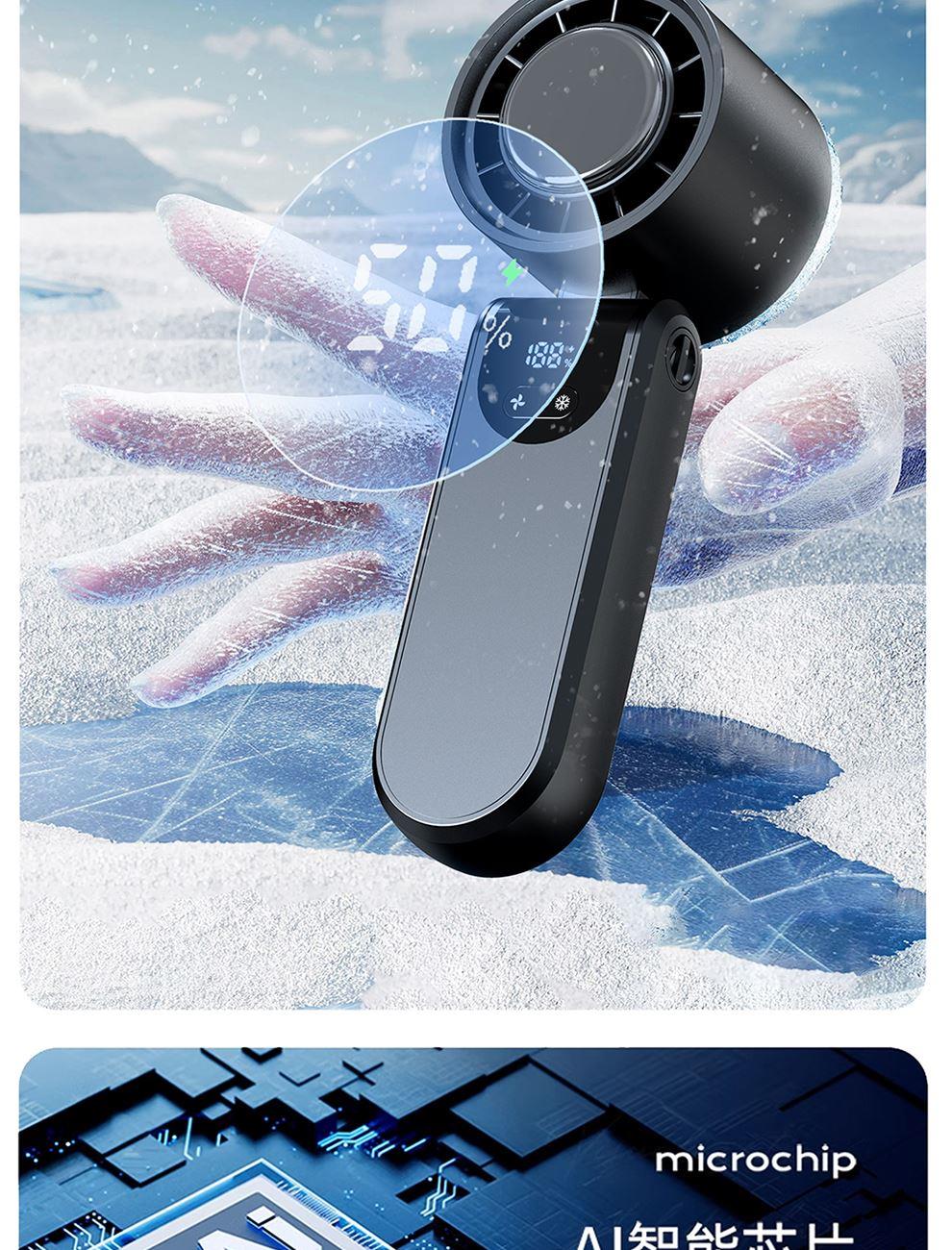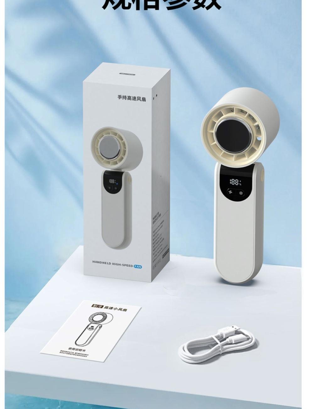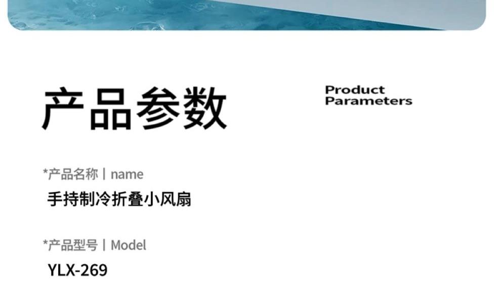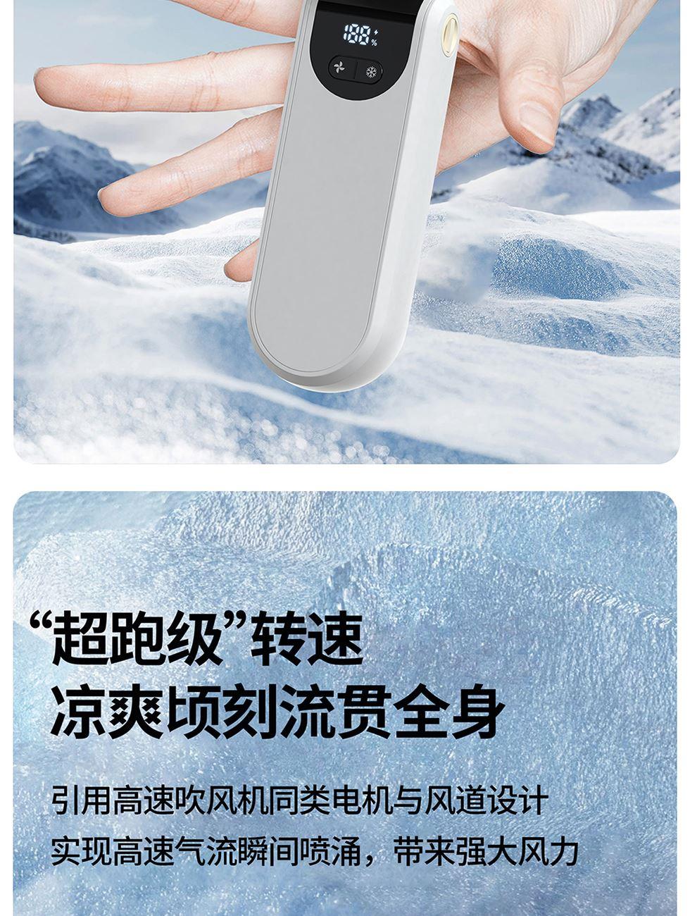 产品尺寸:17.7*6.1*5.4cm 产品材质:ABS+PP+金属+电子元件 输入电流:5V/1A 电池容量:4000mAH 功 率:8w 使用时间:1.5-12小时 产品重量:179g 特点: 冰敷制冷 急速降温 100档风力 无极调节 创新折叠 秒变桌面风扇 LED电量风速数显 一目了然