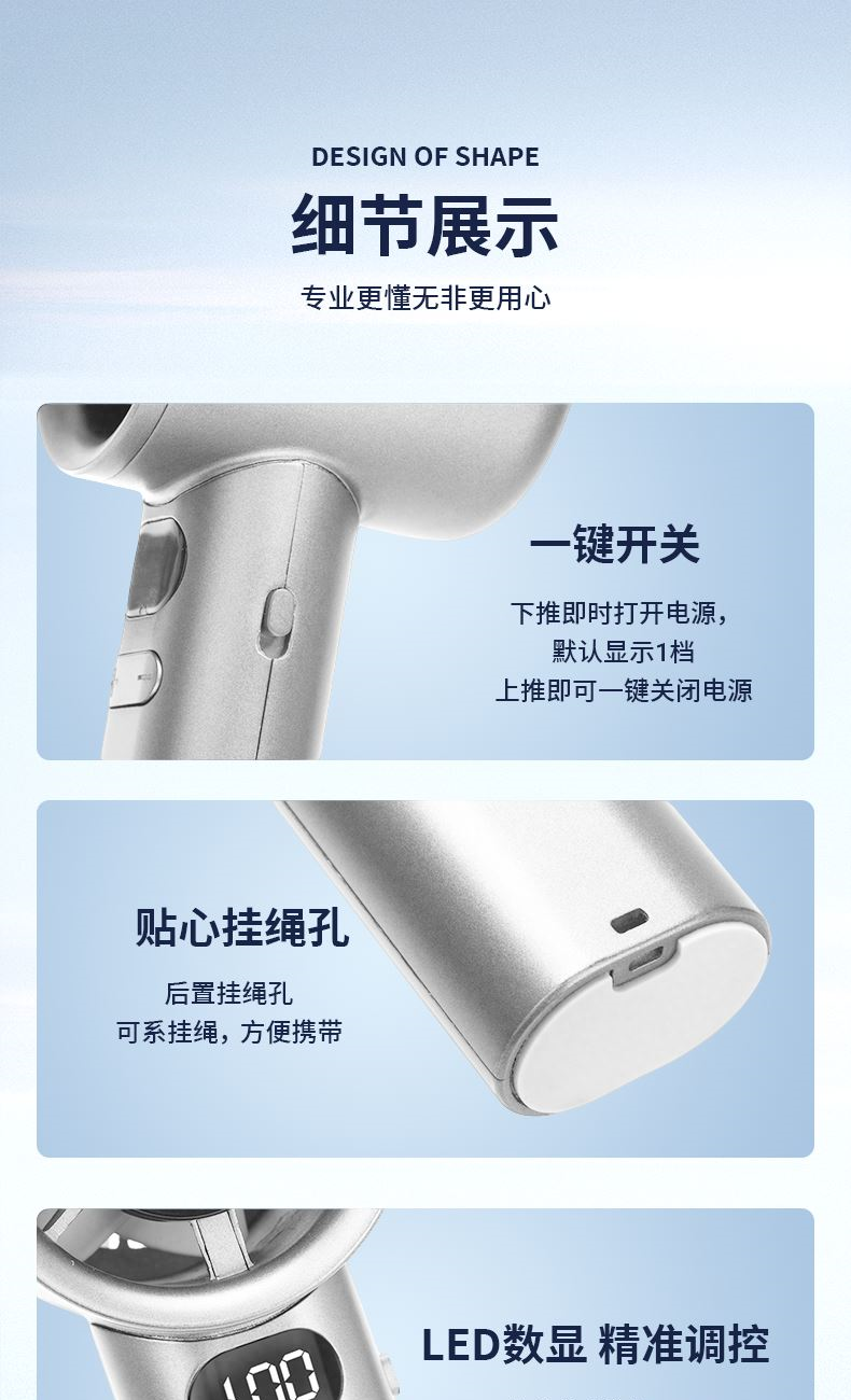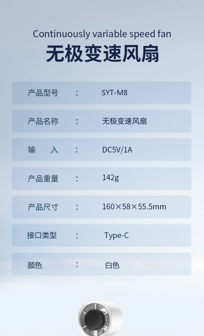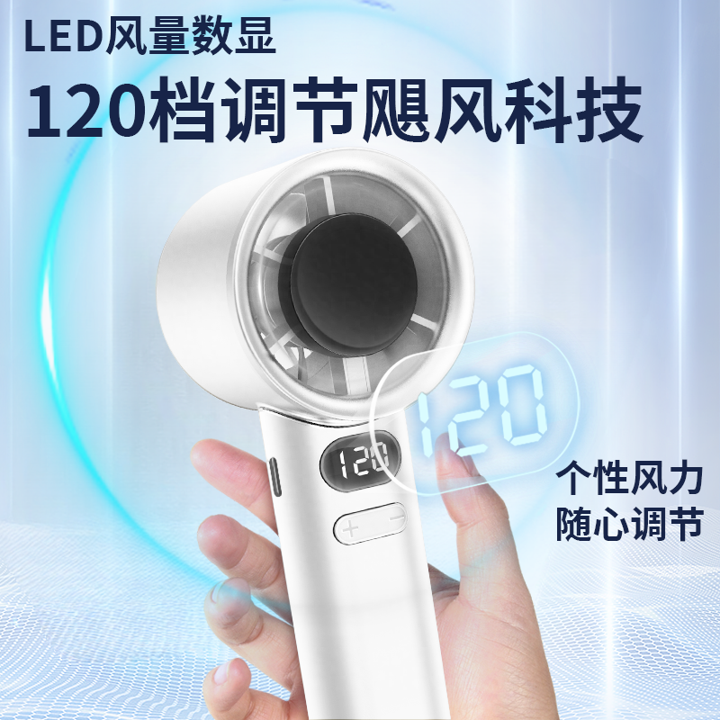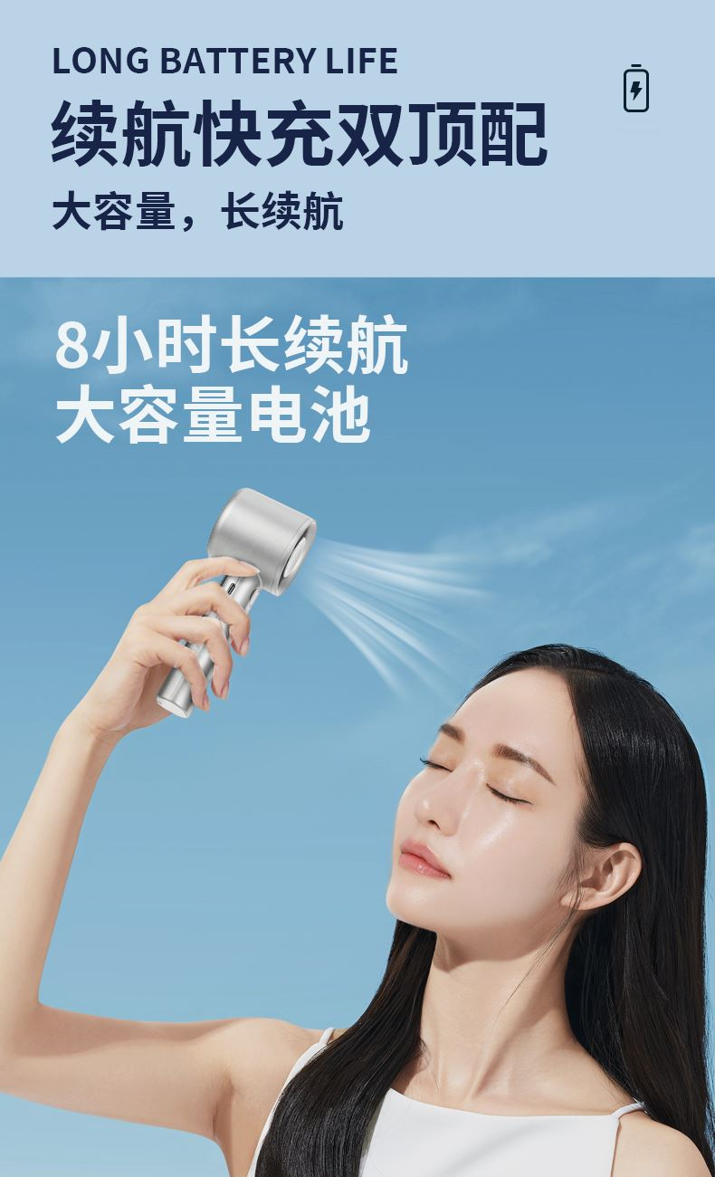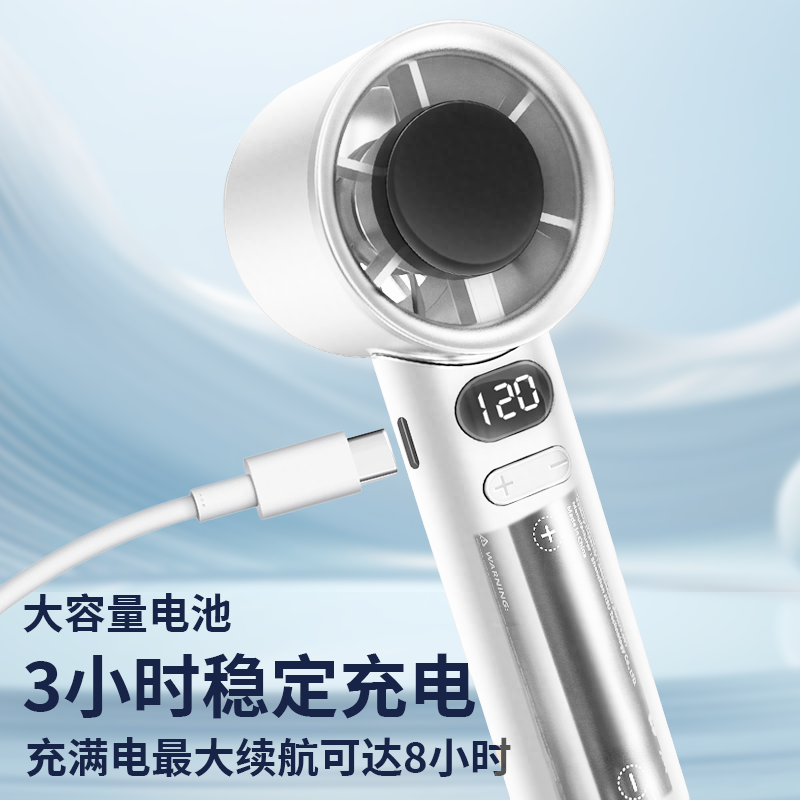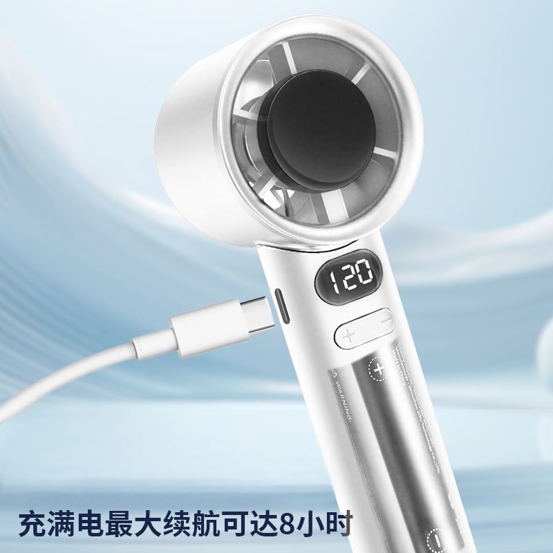 电池容量:2000mAh 续航时间:约2-8H 充电时间:2.5H 工作模式:120档无极调速 电 机:无刷电机 产品材质:塑胶ABS+电子元器件 高颜值,大风力,长续航,2000mAh大容量电池,超大风 无级变速 静音 120档无极调速,涡轮增压出风设计,续航快充,双顶配,TYPE-C接口快速充电