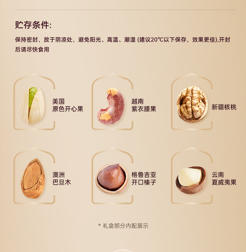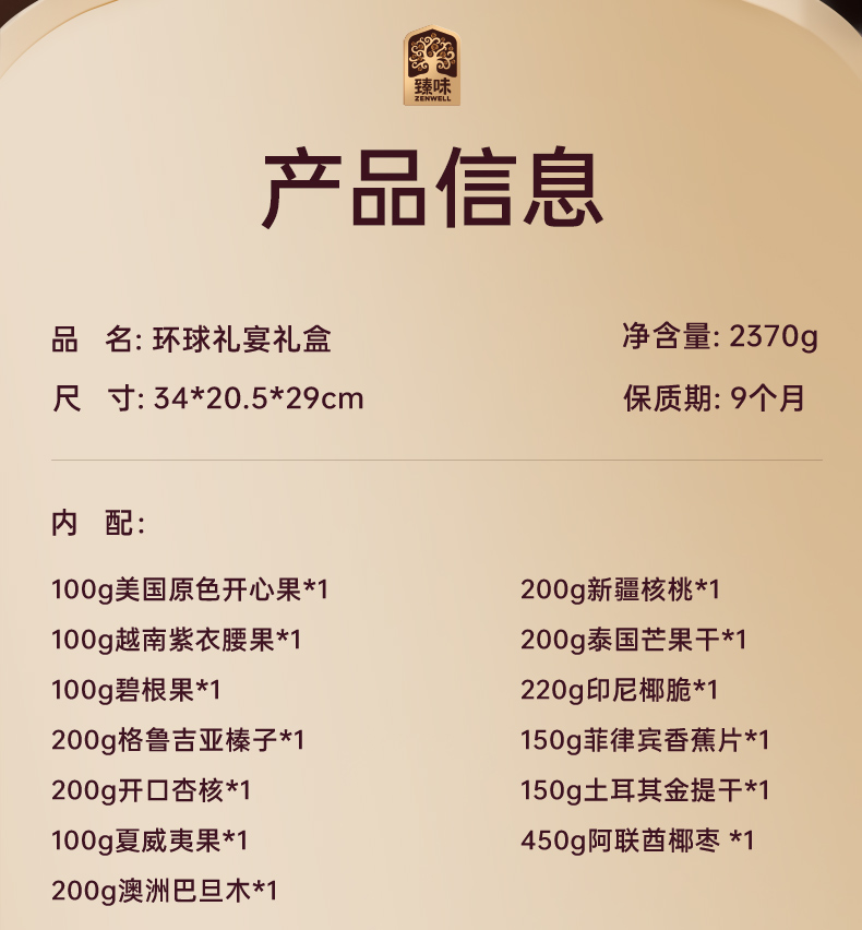臻味-100g美国原色开心果*1 臻味-100g越南紫衣腰果*1 臻味-100g碧根果*1 臻味-200g格鲁吉亚开口榛子*1 臻味-200g开口杏核*1 臻味-100g夏威夷果*1 臻味-100g澳洲巴旦木*1 臻味-200g新疆核桃*1 臻味-200g泰国芒果干*1 臻味-220g印尼椰脆*1 臻味-200g菲律宾黄蕉干*1 臻味-200g土耳其金提干*1 臻味-450g阿联酋椰枣*1