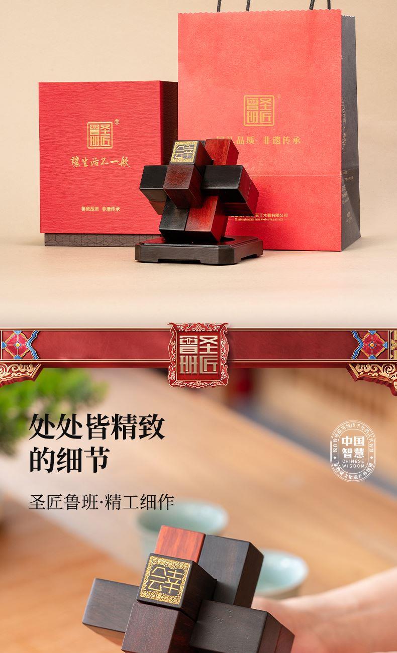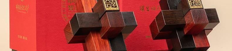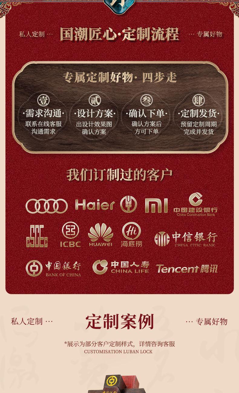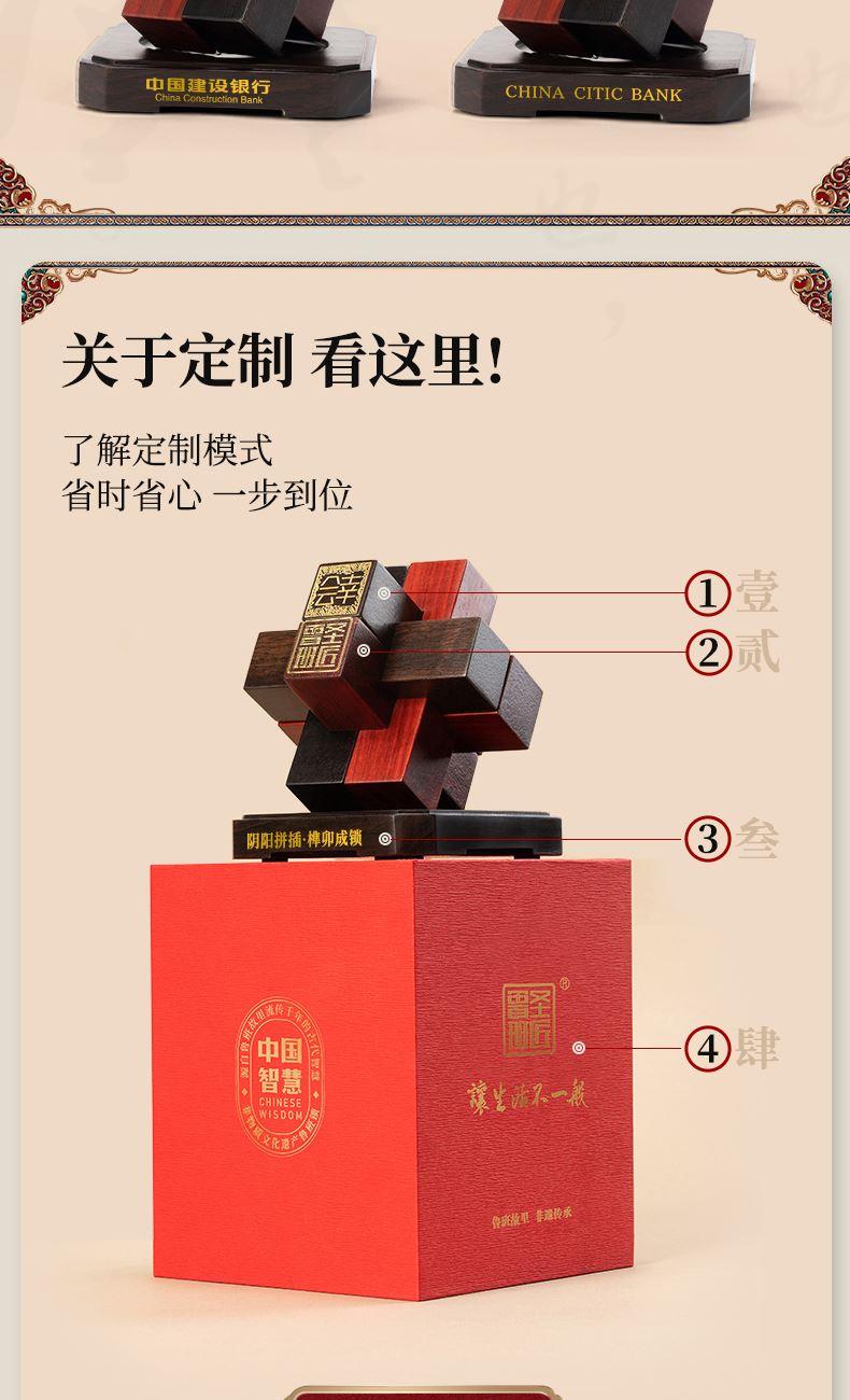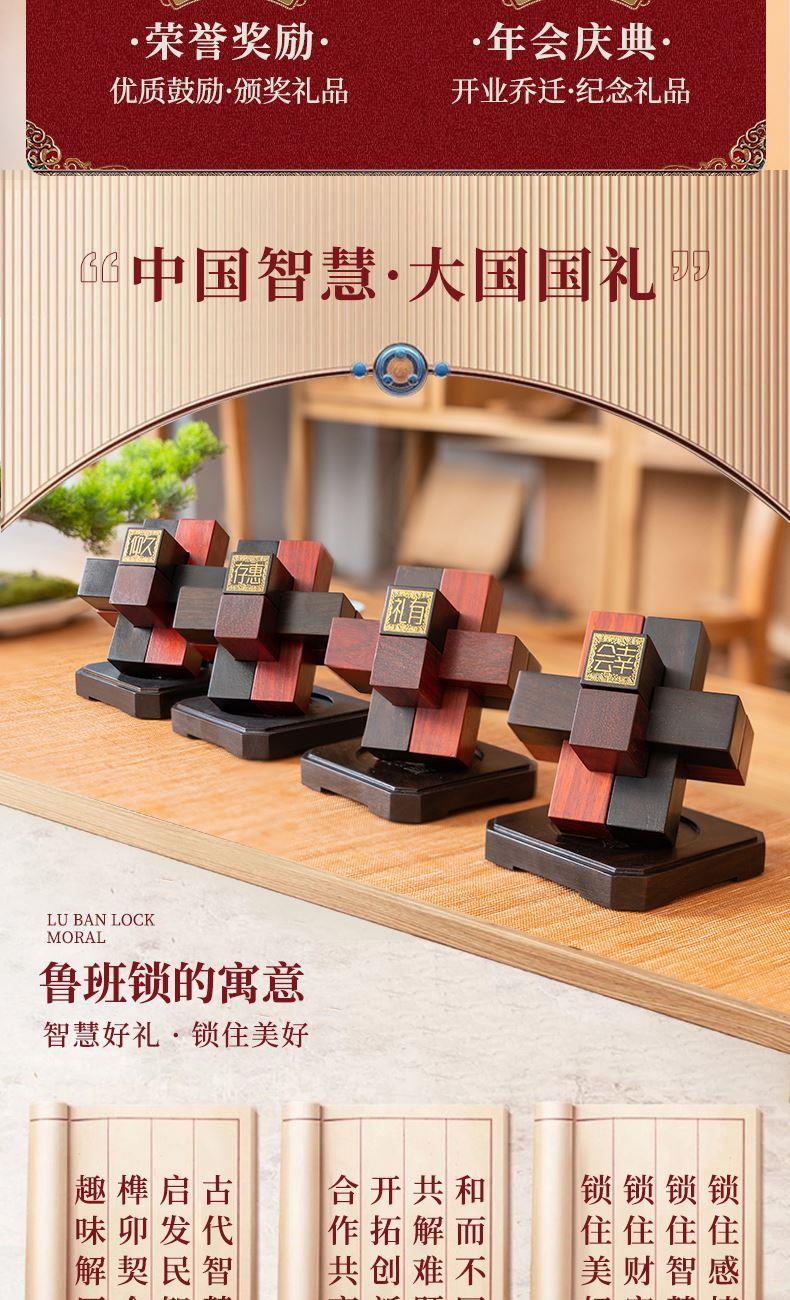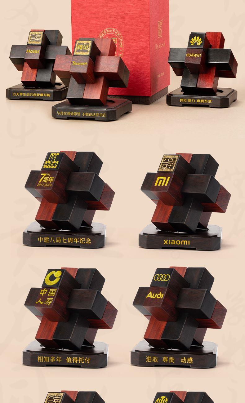 幸会有礼,情意绵长!这组幸会有礼鲁班锁,融合传统社交谦敬之辞:‘幸会’、‘有礼’、‘惠存’、‘久仰’,传递文化韵味。锁体采用描金工艺,典雅精致,底座则采用外方内圆设计,象征天圆地方。锁头和底座都可以个性化定制,无论是家族徽章、生肖图案,还是个人签名,皆可雕刻其上,彰显独特魅力。这是2020年鲁班诞辰日推出的一款纪念款鲁班锁,在中德经济技术论坛上,李克强总理将此款鲁班锁送给德国总理默克尔,意味着共同破解世界难题,这是对中国古代制造的自信和骄傲,这款就是中德友谊锁的同款锁。