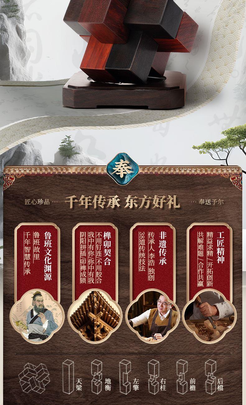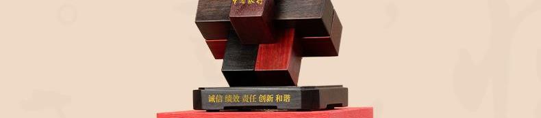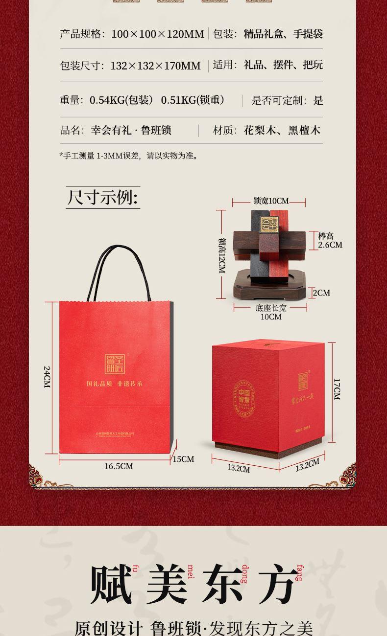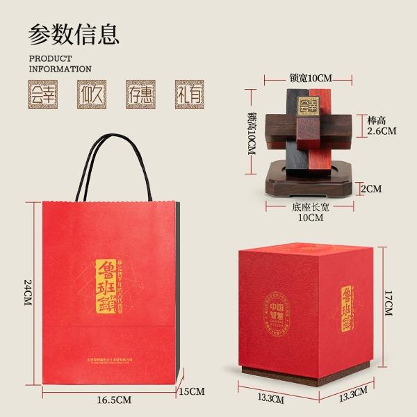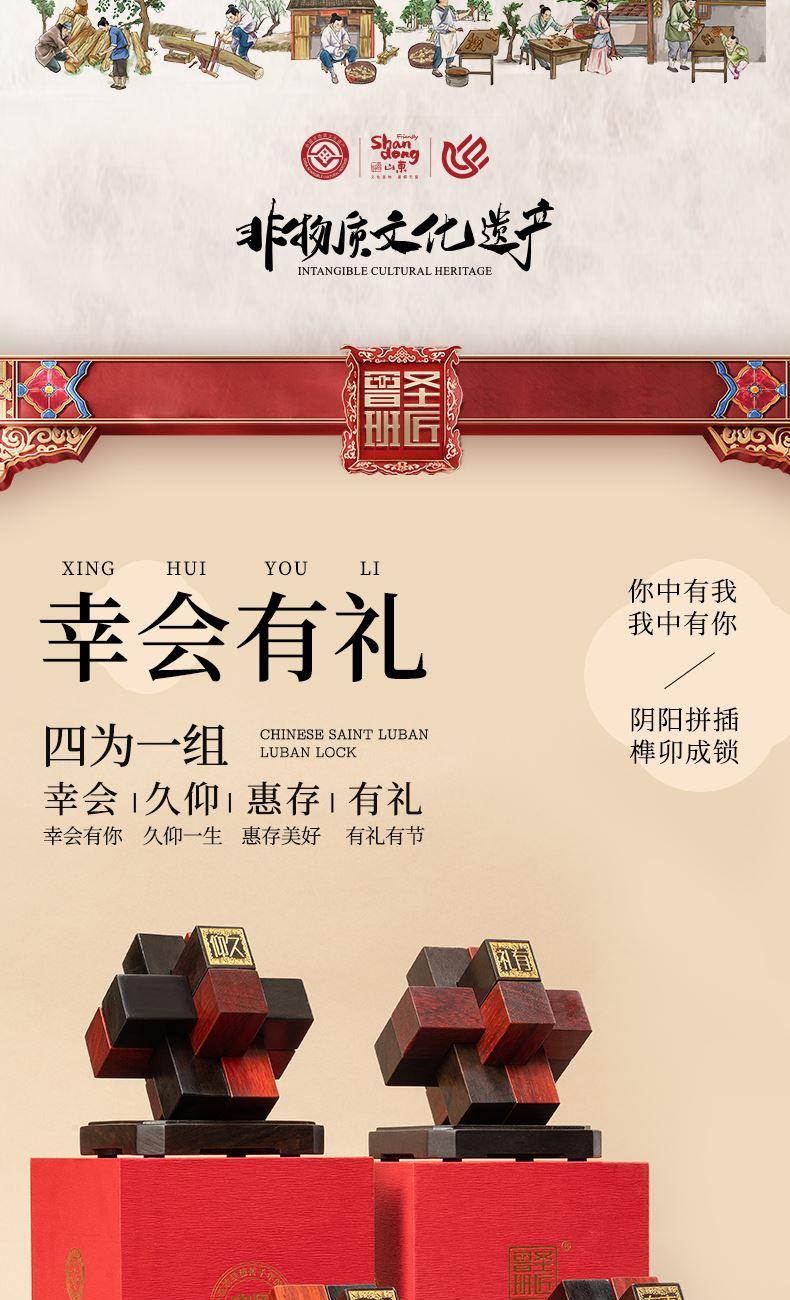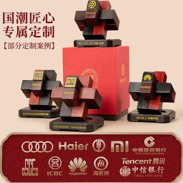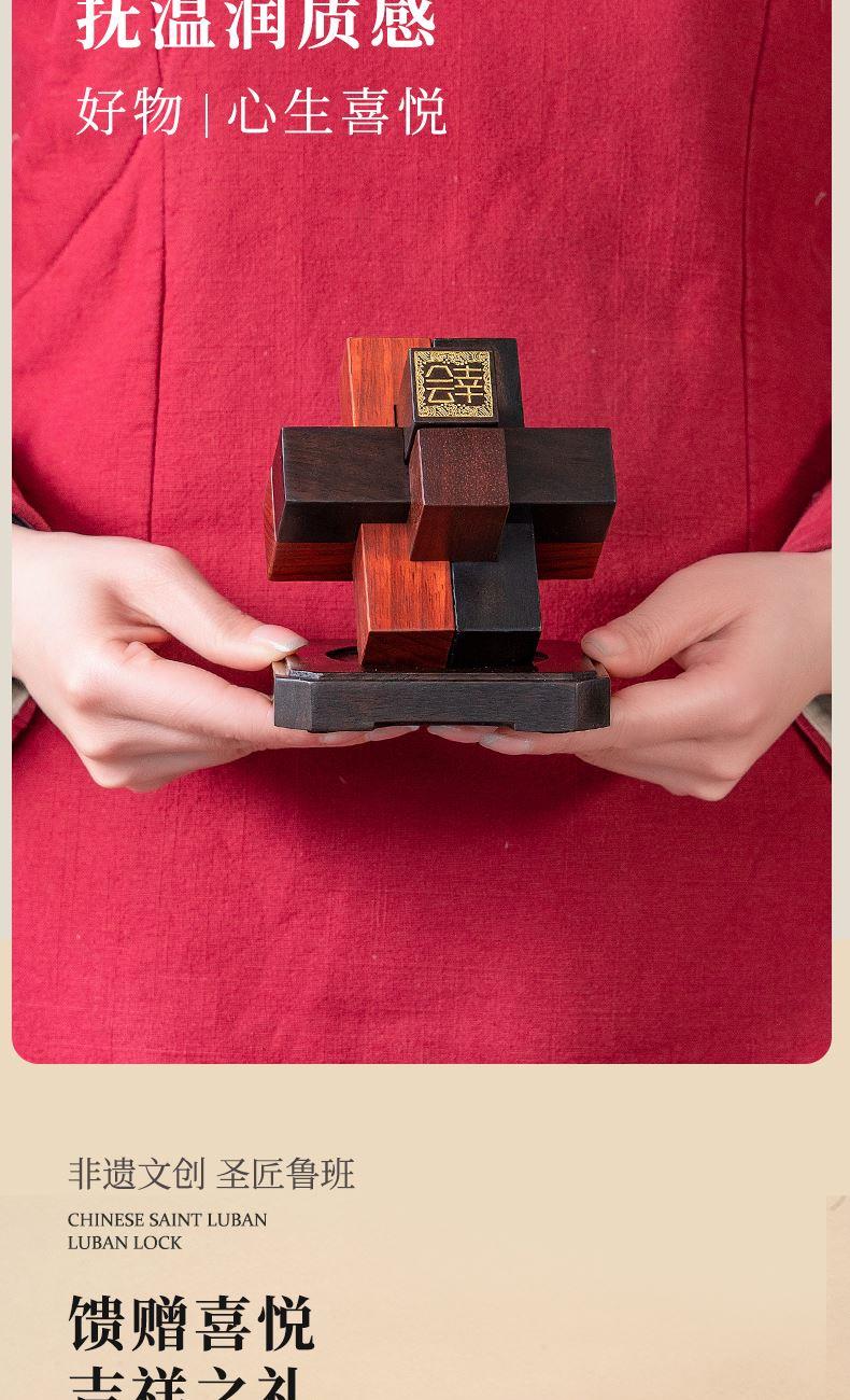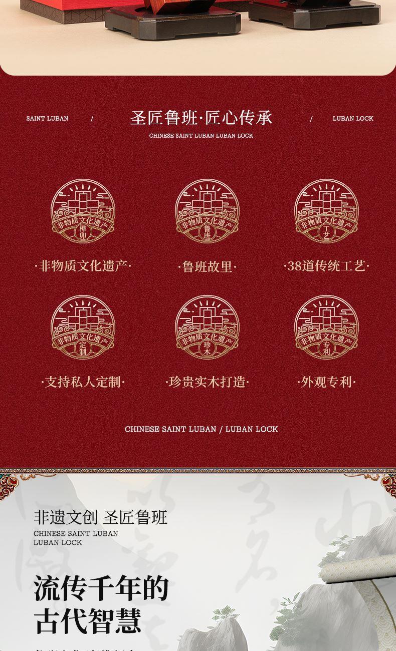 幸会有礼,情意绵长!这组幸会有礼鲁班锁,融合传统社交谦敬之辞:‘幸会’、‘有礼’、‘惠存’、‘久仰’,传递文化韵味。锁体采用描金工艺,典雅精致,底座则采用外方内圆设计,象征天圆地方。锁头和底座都可以个性化定制,无论是家族徽章、生肖图案,还是个人签名,皆可雕刻其上,彰显独特魅力。这是2020年鲁班诞辰日推出的一款纪念款鲁班锁,在中德经济技术论坛上,李克强总理将此款鲁班锁送给德国总理默克尔,意味着共同破解世界难题,这是对中国古代制造的自信和骄傲,这款就是中德友谊锁的同款锁。